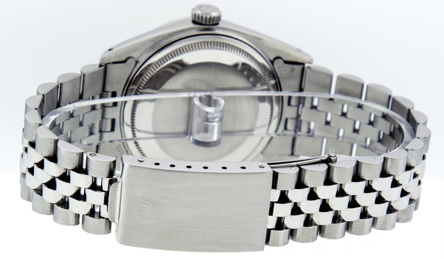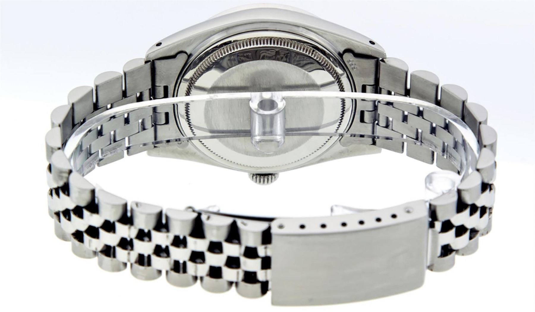 One Mens Rolex Datejust Polished Bright with Satin Finish, Serviced & Electronically Tested, Stainless Steel Case: 36mm, Custom Diamond Lugs: 28 Diamonds In Lugs, Color: G to H, Clarity: SI-VS. Stainless Steel Crown, Custom Bezel: 18K White Gold Diamond + Ruby Beadset, Diamond Count: 36 Diamonds + 4 Rubies, Total Weight 1.00 Carat, Clarity: SI-VS, Color: G to H. Custom Crystal: New Synthetic Sapphire Cyclops Lens. Custom Hands: New Luminescent Hands. Movement: Automatic Winding Movement.. Custom Dial: White Diamond Dial With Sqaure Roman Track, Diamond Color: G To H In Color, Clarity: SI-VS. Date Window: 3 O'Clock Position Date Display, Quickset, Model: Datejust Condition: G-6 Extra Fine. Bracelet: Stainless Steel Jubilee Band. Bright Polish & Satin Finish. 7.0 Inch Length, Adjustable. Standard Clasp, With Rolex Logo. This Watch Has Been Serviced And Polished And Its Free Of All Dents And Scratches.