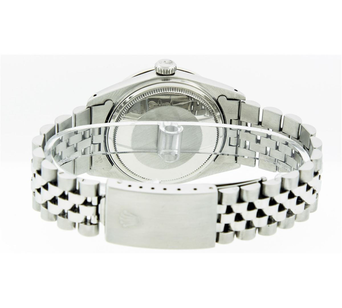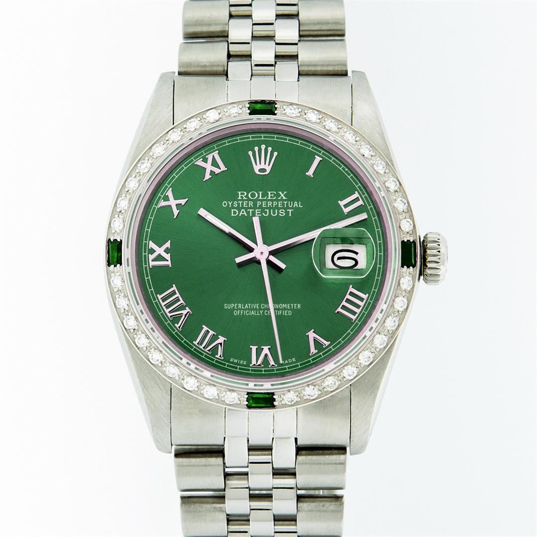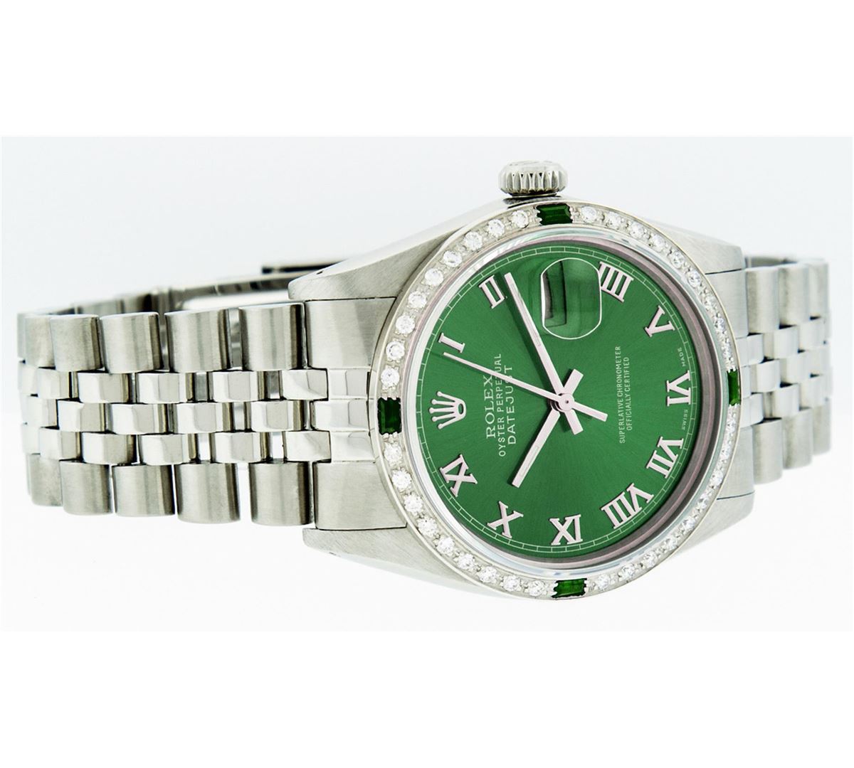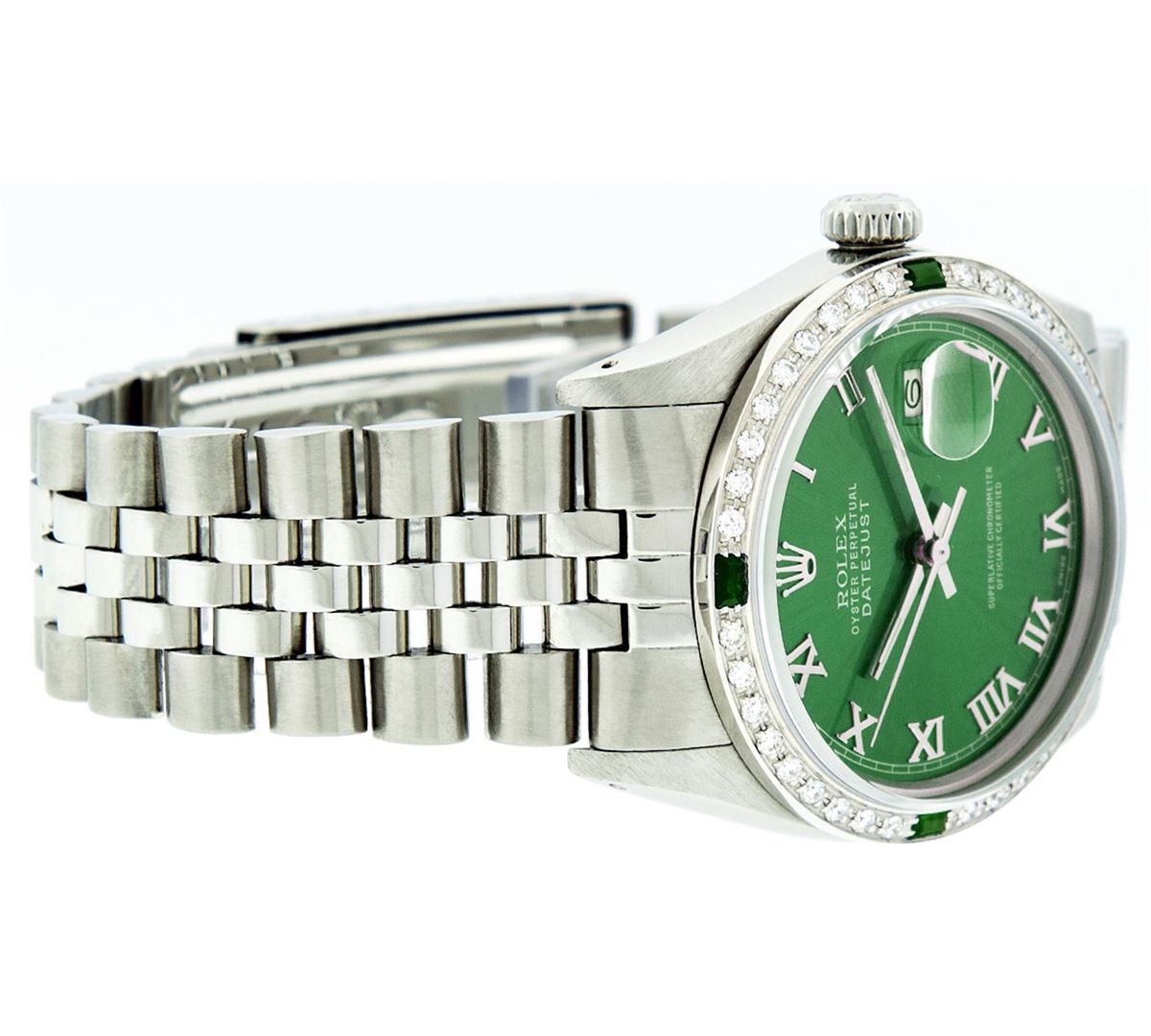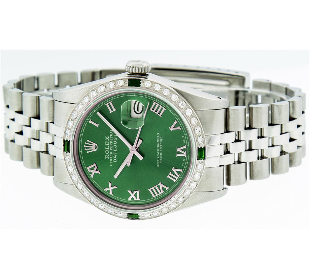 One Mens Rolex Datejust Polished Bright with Satin Finish, Serviced & Electronically Tested, Stainless Steel Case:36mm, Stainless Steel Crown, Custom Bezel: 18K White Gold Emerald Beadset Diamond Bezel, Diamond + Gem Count: 36 Diamonds + 4 Emeralds. Total Weight 1.00 Carat, Clarity: Si-VS, Color: G to H. Custom Crystal: Synthetic Sapphire Cyclops Lens. Movement: Automatic Winding Movement Caliber 3035. Custom Dial: Green Roman Dial With Square Track. Date Window: 3 O'Clock Position Date Display, Quickset, Model: Datejust. Condition: G-6 Extra Fine. Bracelet: Stainless Steel Jubilee. Bright Polish & Satin Finish. 7.0 Inch Length, Adjustable. Standard Clasp, With Rolex Logo.