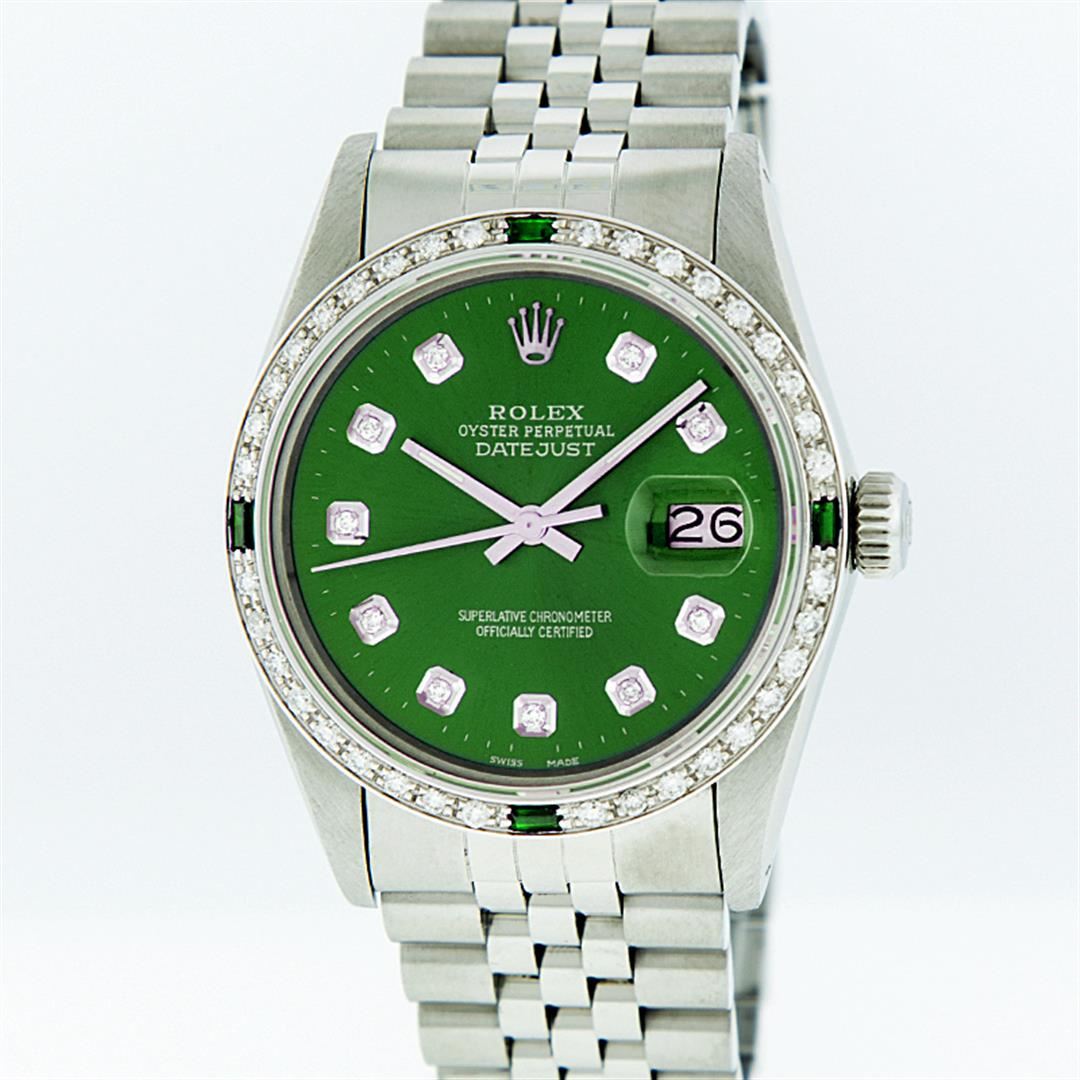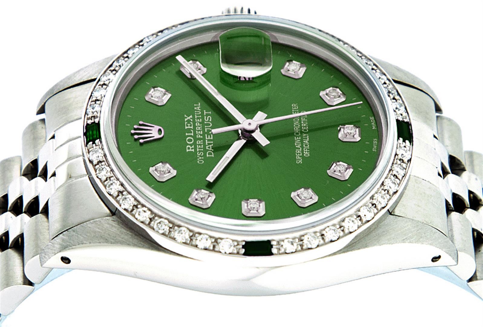 One Gents Rolex Datejust Polished, Serviced & Electronically Tested, Stainless Steel Case:36mm, Stainless Steel Crown, Custom Bezel: 18K White Gold Emerald Beadset Diamond Bezel, Diamond + Gem Count: 36 Diamonds + 4 Emeralds Total Weight 1.00 Carat, Clarity: SI-VS, Color: G to H. Custom Crystal: Synthetic Sapphire Cyclops Lens. Movement: Automatic Winding Movement Caliber 3035. Custom Dial: Green With Diamond Hour Markers, 10 Diamond Dial G To H In Color, Clarity: SI-VS. Date Window: 3 O'Clock Position Date Display, Quickset, Model: Datejust, Condition: G-6 Extra Fine. Bracelet: Stainless Steel Jubilee. Bright Polish & Satin Finish. 7.0 Inch Length, Adjustable. Standard Clasp, With Rolex Logo