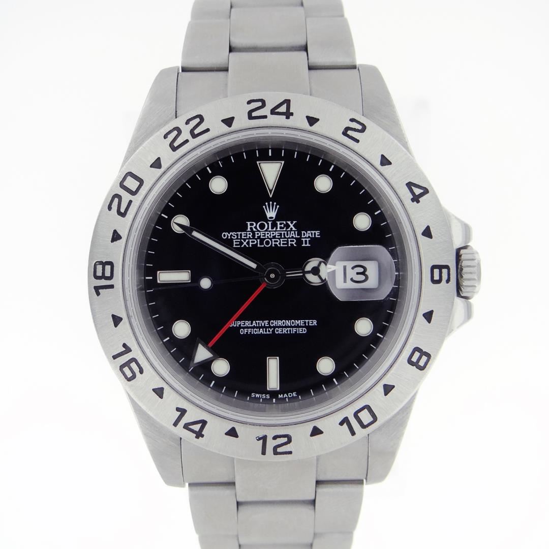 One Mens Pre Owned Rolex Stainless Steel Explorer II Polished, Serviced & Electronically Tested, Rolex Stainless Steel Case: 40mm, Rolex Stainless Steel Crown, Rolex Bezel: Rolex 24-Hour Graduated Stainless Steel Bezel. Crystal: Sapphire With Cyclops Lens. Rolex Movement: Automatic Winding Movement Caliber 3185. Rolex Dial: Rolex Black Dial With luminous Hour Markers. Date Window: 3 O'Clock Position Date Display, Model: Explorer II, Quickset, Condition: G-6 Extra Fine. Rolex Bracelet: Rolex Stainless Steel Oyster Bracelet with a Folding Deployment Clasp, Bracelet Length: 7.0" wrist. This Watch Has Been Serviced Time Tested And Is In Excellent Condition It Is Free Of All Scratches And Dents.