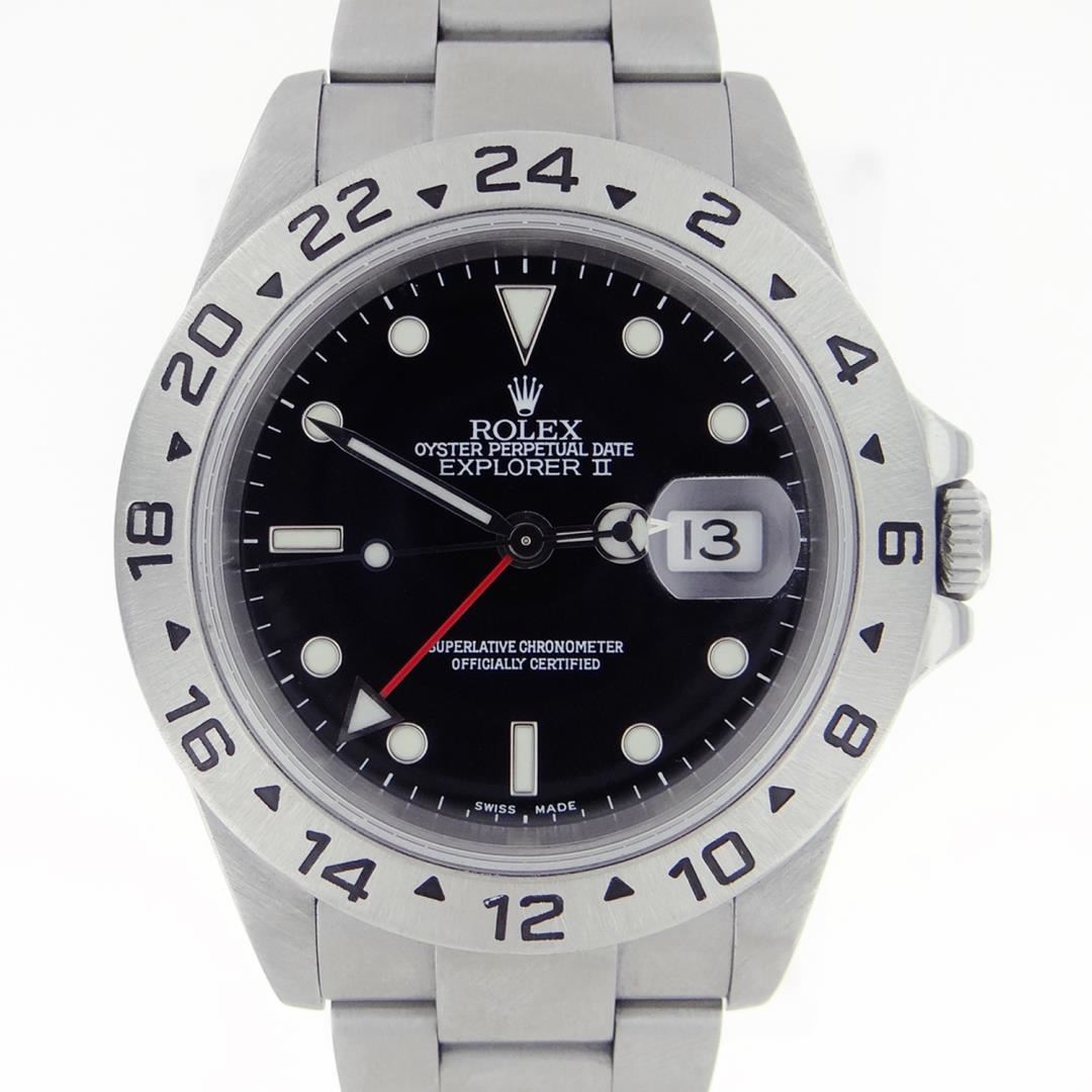 One Mens Pre Owned Rolex Stainless Steel Explorer II Polished, Serviced & Electronically Tested, Rolex Stainless Steel Case: 40mm, Rolex Stainless Steel Crown, Rolex Bezel: Rolex 24-Hour Graduated Stainless Steel Bezel. Crystal: Sapphire With Cyclops Lens. Rolex Movement: Automatic Winding Movement Caliber 3185. Rolex Dial: Rolex Black Dial With luminous Hour Markers. Date Window: 3 O'Clock Position Date Display, Model: Explorer II, Quickset, Condition: G-6 Extra Fine. Rolex Bracelet: Rolex Stainless Steel Oyster Bracelet with a Folding Deployment Clasp, Bracelet Length: 7.0" wrist. This Watch Has Been Serviced Time Tested And Is In Excellent Condition It Is Free Of All Scratches And Dents.