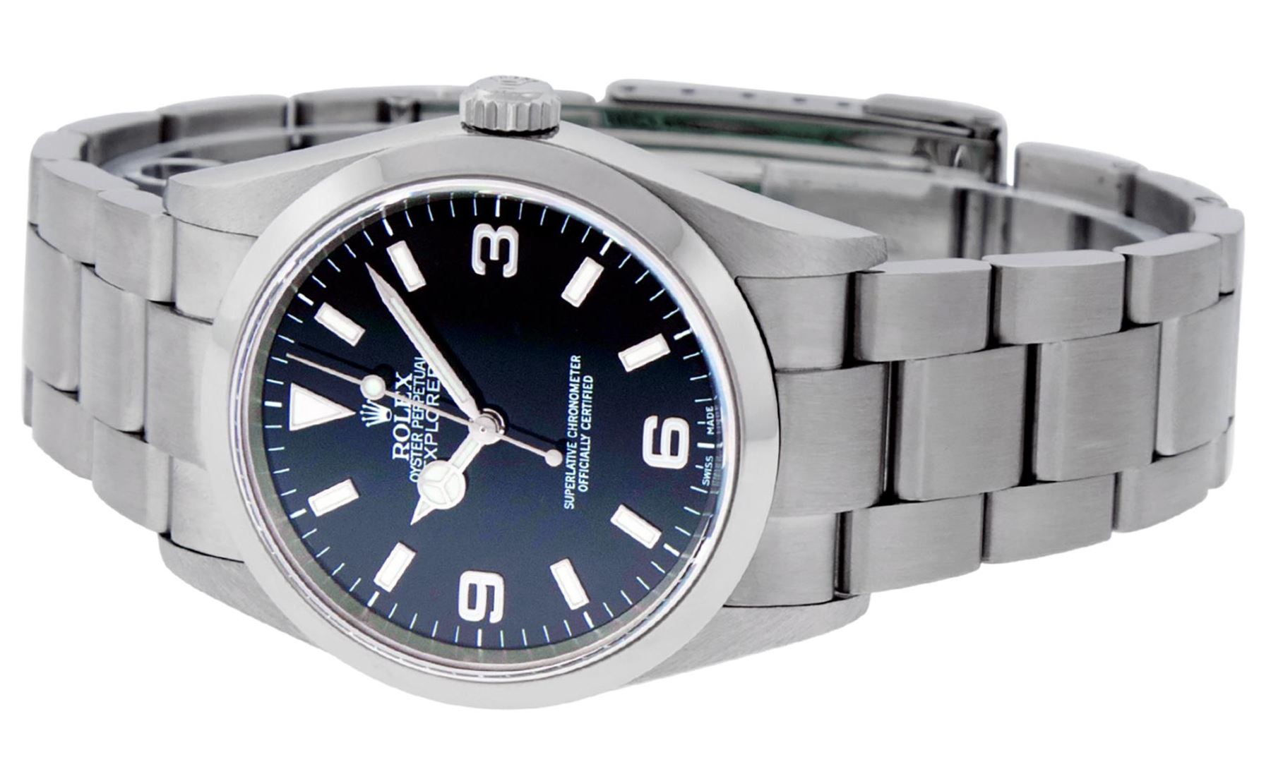 One Mens Pre Owned Rolex Stainless Steel Explorer Polished, Serviced & Electronically Tested, Rolex Stainless Steel Case: 36mm, Rolex Stainless Steel Crown, Rolex Bezel: Rolex Stainless Steel Smooth Domed Bezel. Rolex Crystal: Sapphire With Magnified Date Window. Rolex Movement: Automatic Winding Movement Caliber 3130. Rolex Dial: Rolex Black Dial With Raised Arabic Numerals. Date Window: 3 O'Clock Position Date Display, Model: Explorer, Condition: G-6 Extra Fine. Rolex Bracelet: Rolex Stainless Steel Oyster Bracelet, Bright Polish & Satin Finish. 7 Inch Length, Adjustable. Flip Lock Clasp with Rolex Logo. This Watch Has Been Serviced Time Tested And Is In Excellent Condition It Is Free Of All Scratches And Dents.