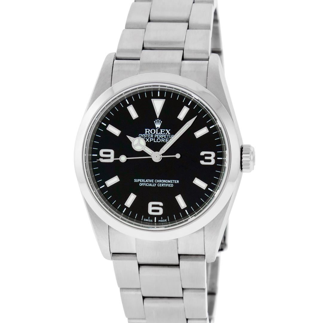 One Mens Pre Owned Rolex Stainless Steel Explorer Polished, Serviced & Electronically Tested, Rolex Stainless Steel Case: 36mm, Rolex Stainless Steel Crown, Rolex Bezel: Rolex Stainless Steel Smooth Domed Bezel. Rolex Crystal: Sapphire With Magnified Date Window. Rolex Movement: Automatic Winding Movement Caliber 3130. Rolex Dial: Rolex Black Dial With Raised Arabic Numerals. Date Window: 3 O'Clock Position Date Display, Model: Explorer, Condition: G-6 Extra Fine. Rolex Bracelet: Rolex Stainless Steel Oyster Bracelet, Bright Polish & Satin Finish. 7 Inch Length, Adjustable. Flip Lock Clasp with Rolex Logo. This Watch Has Been Serviced Time Tested And Is In Excellent Condition It Is Free Of All Scratches And Dents.