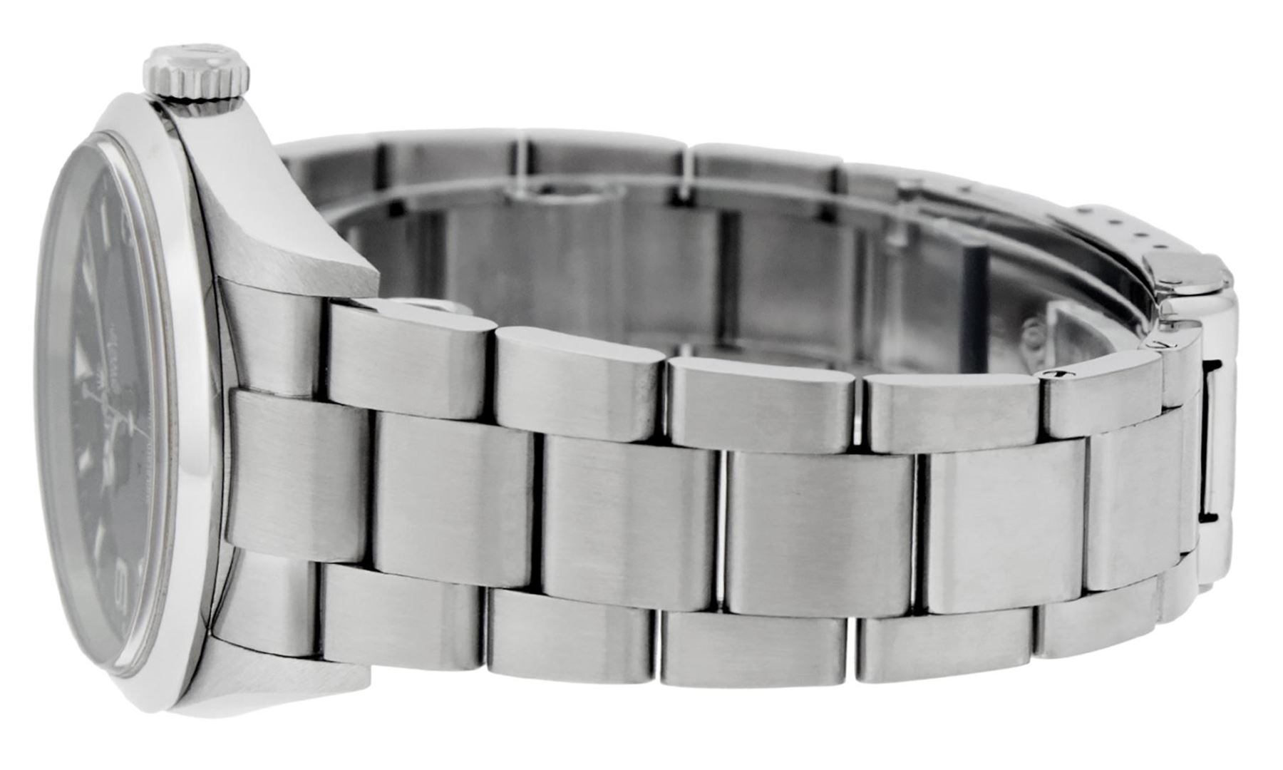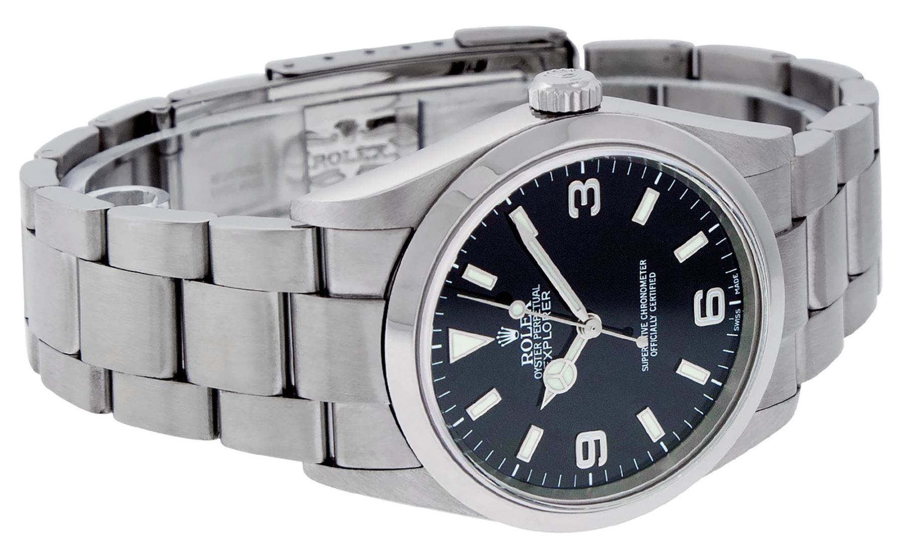 One Mens Pre Owned Rolex Stainless Steel Explorer Polished, Serviced & Electronically Tested, Rolex Stainless Steel Case: 36mm, Rolex Stainless Steel Crown, Rolex Bezel: Rolex Stainless Steel Smooth Domed Bezel. Rolex Crystal: Sapphire With Magnified Date Window. Rolex Movement: Automatic Winding Movement Caliber 3130. Rolex Dial: Rolex Black Dial With Raised Arabic Numerals. Date Window: 3 O'Clock Position Date Display, Model: Explorer, Condition: G-6 Extra Fine. Rolex Bracelet: Rolex Stainless Steel Oyster Bracelet, Bright Polish & Satin Finish. 7 Inch Length, Adjustable. Flip Lock Clasp with Rolex Logo. This Watch Has Been Serviced Time Tested And Is In Excellent Condition It Is Free Of All Scratches And Dents.
