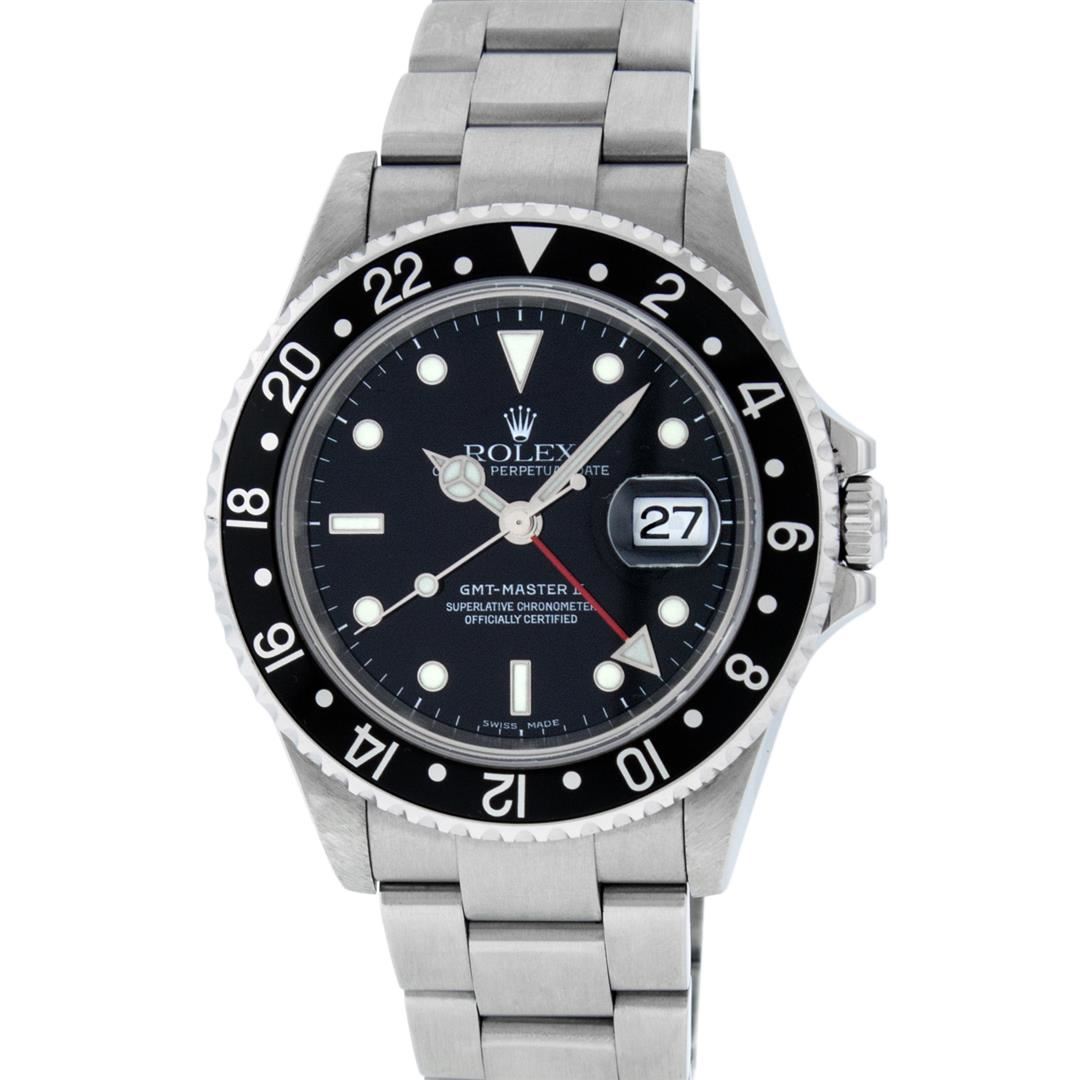 One Mens Pre Owned Rolex Stainless Steel GMT Master 2 Polished, Serviced & Electronically Tested, Rolex Stainless Steel Case: 40mm, Rolex Stainless Steel Crown, Rolex Bezel: Stainless Steel Bi Directional Rotatable Bezel With Black Insert. Rolex Crystal: Sapphire Crystal With Magnified Date Window. Rolex Movement: Automatic Winding Movement Caliber 3186. Dial: Rolex GMT Master 2 Black Dial, Date Window: 3 O'Clock Position Date Display, Model: GMT Master 2, Quickset, Condition: G-6 Extra Fine. Rolex Bracelet: Stainless Steel Oyster Band. Bright Polish & Satin Finish. 7.0 Inch Length, Adjustable. Standard Clasp, With Rolex Logo. This Watch Has Been Serviced Time Tested And Is In Excellent Condition It Is Free Of All Scratches And Dents.