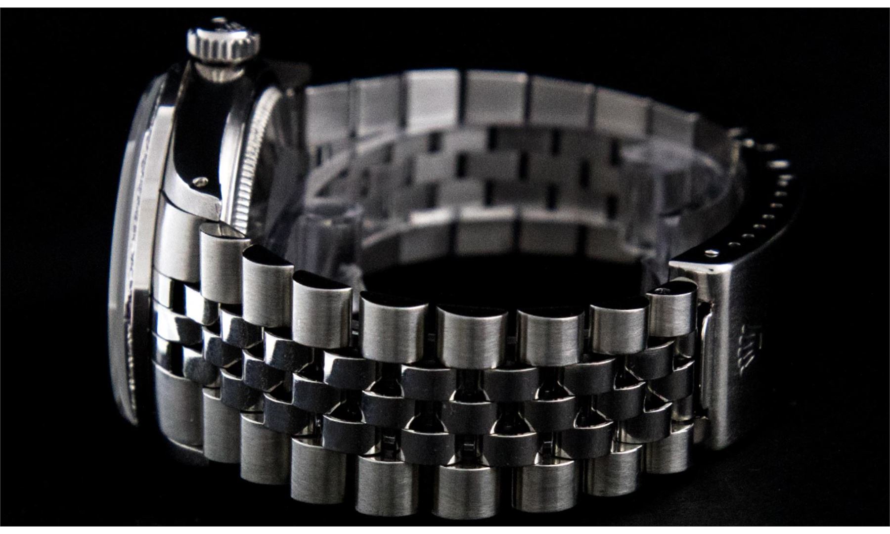 One Pre Owned Stainless Steel Rolex Datejust 36MM Polished Bright with Satin Finish, This Watch Has Been Serviced And Electronically Tested, Rolex Stainless Steel Case: 36mm, Rolex Stainless Steel Crown, Custom Bezel: New 18K White Gold Ruby Beadset Diamond Bezel, Diamond + Gem Count: 36 Diamonds + 4 Rubies. Custom Crystal: New Sapphire With Date Window. Custom Hands: New Luminescent Hands. Rolex Movement: Automatic Winding Movement 3035. Custom Dial: Custom Slate Grey Dial With Added Diamond Hour Markers, Diamond Count: 10 Diamonds in Dial. Date Window: 3 O'Clock Position Date Display, Quickset, Model: Quickset Datejust, Condition: G-6 Extra Fine. Rolex Bracelet: Stainless Steel Jubilee Band. Bracelet: 7.0 Inch Length, Adjustable. Standard Clasp, With Rolex Logo. This Watch Has Been Serviced Time Tested And Is In Excellent Condition It Is Free Of All Scratches And Dents.