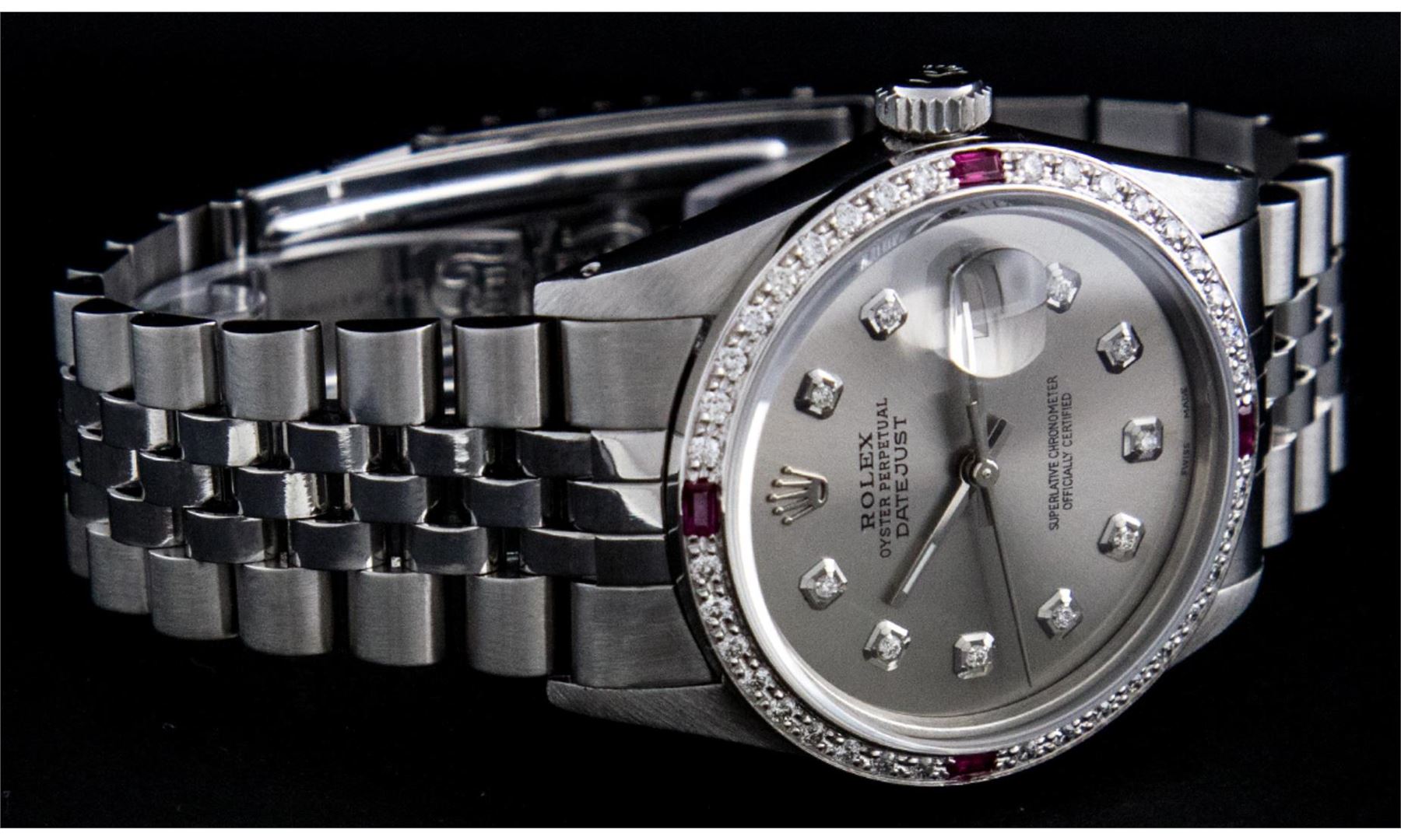One Pre Owned Stainless Steel Rolex Datejust 36MM Polished Bright with Satin Finish, This Watch Has Been Serviced And Electronically Tested, Rolex Stainless Steel Case: 36mm, Rolex Stainless Steel Crown, Custom Bezel: New 18K White Gold Ruby Beadset Diamond Bezel, Diamond + Gem Count: 36 Diamonds + 4 Rubies. Custom Crystal: New Sapphire With Date Window. Custom Hands: New Luminescent Hands. Rolex Movement: Automatic Winding Movement 3035. Custom Dial: Custom Slate Grey Dial With Added Diamond Hour Markers, Diamond Count: 10 Diamonds in Dial. Date Window: 3 O'Clock Position Date Display, Quickset, Model: Quickset Datejust, Condition: G-6 Extra Fine. Rolex Bracelet: Stainless Steel Jubilee Band. Bracelet: 7.0 Inch Length, Adjustable. Standard Clasp, With Rolex Logo. This Watch Has Been Serviced Time Tested And Is In Excellent Condition It Is Free Of All Scratches And Dents.