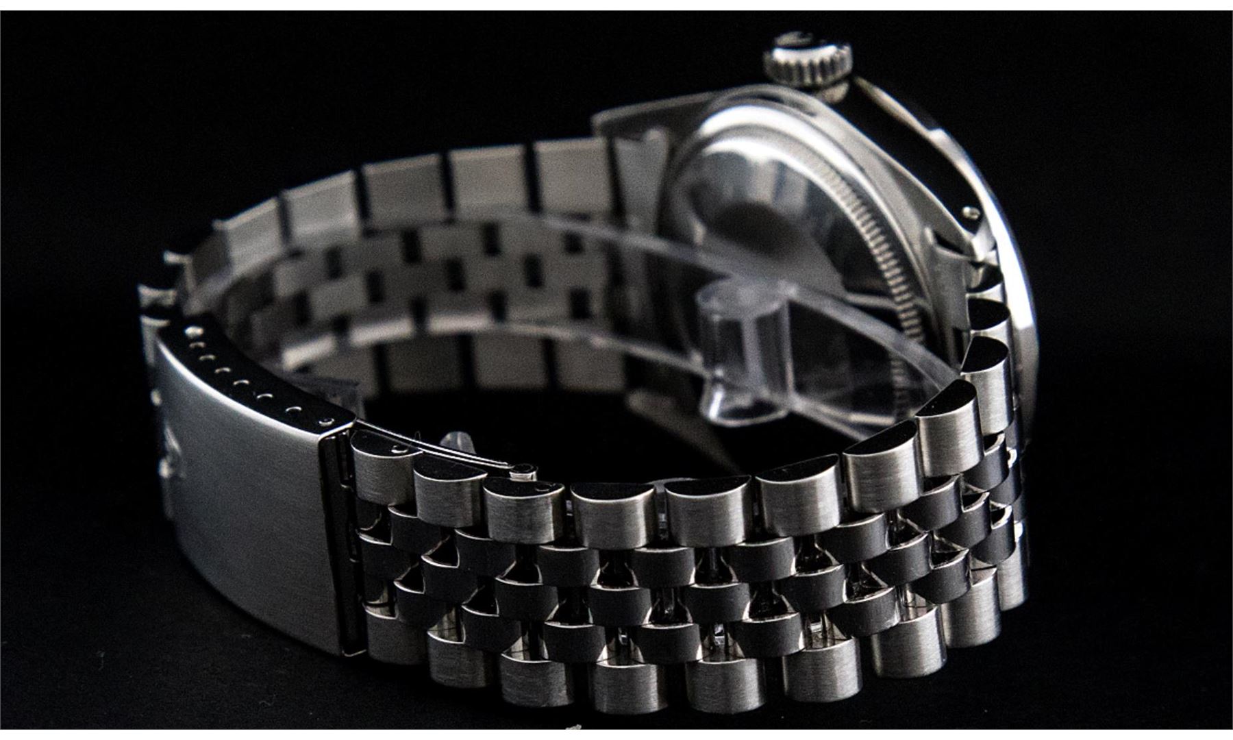 One Pre Owned Stainless Steel Rolex Datejust 36MM Polished Bright with Satin Finish, This Watch Has Been Serviced And Electronically Tested, Rolex Stainless Steel Case: 36mm, Rolex Stainless Steel Crown, Custom Bezel: New 18K White Gold Ruby Beadset Diamond Bezel, Diamond + Gem Count: 36 Diamonds + 4 Rubies. Custom Crystal: New Sapphire With Date Window. Custom Hands: New Luminescent Hands. Rolex Movement: Automatic Winding Movement 3035. Custom Dial: Custom Slate Grey Dial With Added Diamond Hour Markers, Diamond Count: 10 Diamonds in Dial. Date Window: 3 O'Clock Position Date Display, Quickset, Model: Quickset Datejust, Condition: G-6 Extra Fine. Rolex Bracelet: Stainless Steel Jubilee Band. Bracelet: 7.0 Inch Length, Adjustable. Standard Clasp, With Rolex Logo. This Watch Has Been Serviced Time Tested And Is In Excellent Condition It Is Free Of All Scratches And Dents.