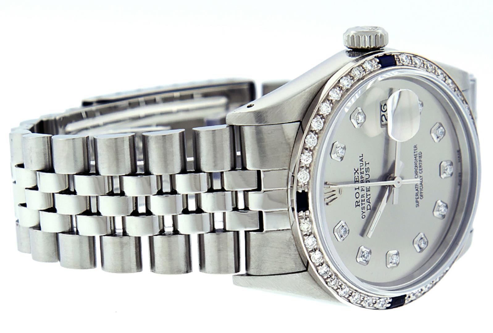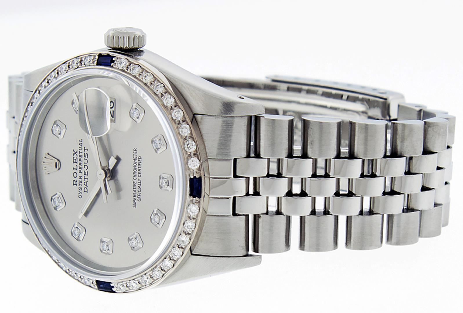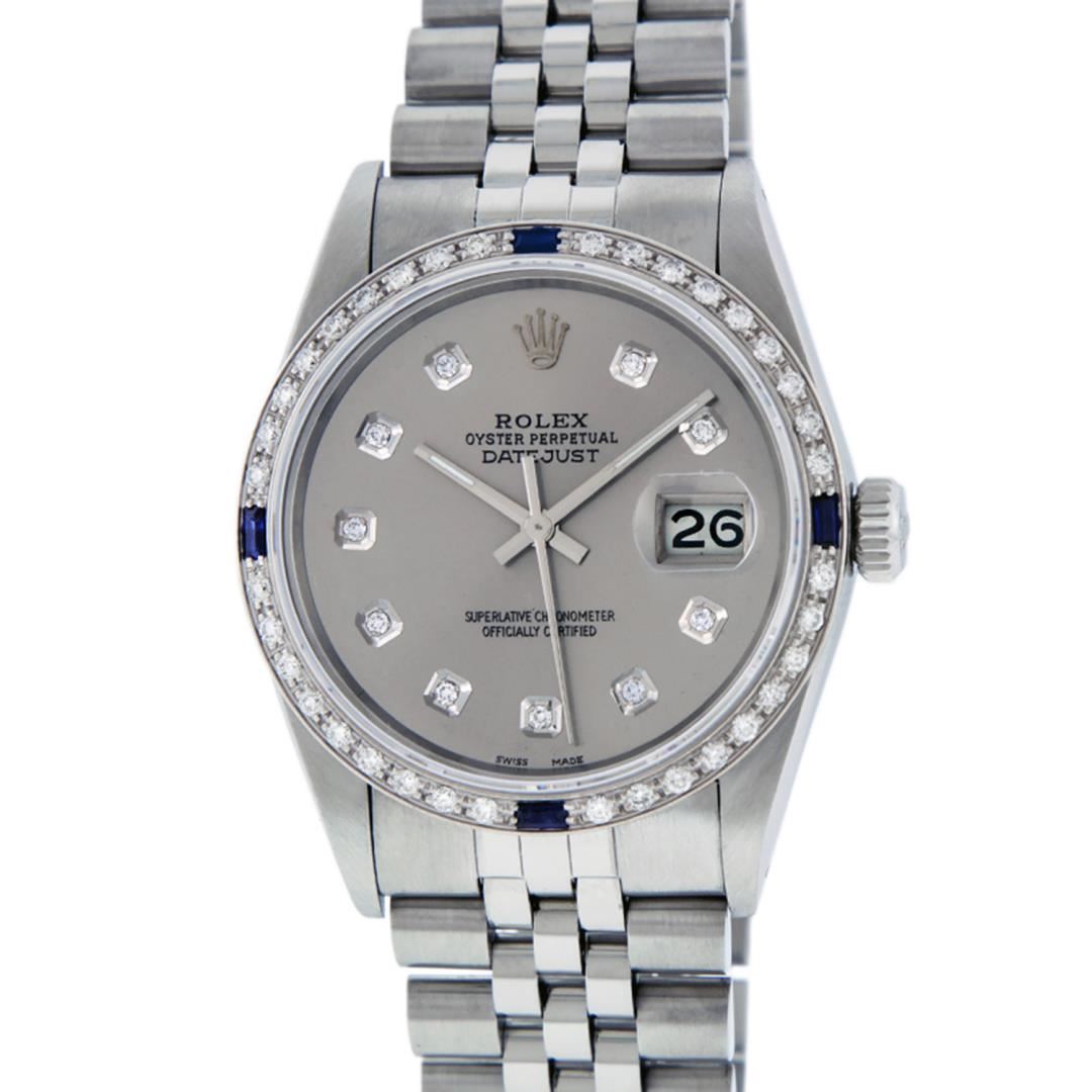 One Mens Pre Owned Stainless Steel Rolex Datejust Polished Bright with Satin Finish, This Watch Has Been Serviced And Electronically Tested, Stainless Steel Case: 36mm, Stainless Steel Crown, Custom Bezel: New 18K White Gold Sapphire Beadset Diamond Bezel, Diamond + Gem Count: 36 Diamonds + 4 Sapphires. Custom Crystal: New Sapphire With Magnified Date Window. Custom Hands: New Luminescent Hands. Rolex Movement: Automatic Winding Movement 3035. Custom Dial: Custom Slate Grey With Added Diamond Hour Markers, Diamond Count: 10 Diamonds in Dial. Date Window: 3 O'Clock Position Date Display, Quickset, Model: Quickset Datejust, Condition: G-6 Extra Fine. Rolex Bracelet: Stainless Steel Jubilee Band. Bracelet: 7.0 Inch Length, Adjustable. Standard Clasp, With Rolex Logo. This Watch Has Been Serviced Time Tested And Is In Excellent Condition It Is Free Of All Scratches And Dents.