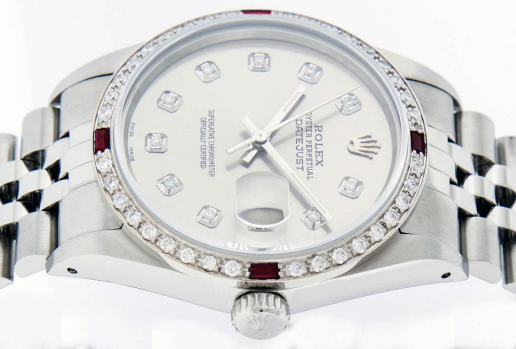 One Mens Stainless Steel Rolex Datejust Polished Bright with Satin Finish, This Watch Has Been Serviced & Electronically Tested, Stainless Steel Case: 36mm, Stainless Steel Crown, Custom Bezel: New 18K White Gold Ruby Beadset Diamond Bezel, Diamond + Gem Count: 36 Diamonds + 4 Rubies, Total Weight 1.00 Carat, Clarity: SI-VS, Color: G to H. Custom Crystal: New Synthetic Sapphire Cyclops Lens. Custom Hands: New Luminescent Hands. Movement: Automatic Winding Movement Caliber 3035. Custom Dial: Slate Grey With Diamond Hour Markers, Diamond Count: 10 Diamonds in Dial, Diamond Color: G To H In Color, Clarity: SI-VS. Date Window: 3 O'Clock Position Date Display, Quickset, Model: Datejust, Condition: G-6 Extra Fine. Bracelet: Stainless Steel Jubilee. Bracelet: 7.0 Inch Length, Adjustable. Standard Clasp, With Rolex Logo. This Watch Has Been Serviced Time Tested And Is In Excellent Condition It Is Free Of All Scratches And Dents.