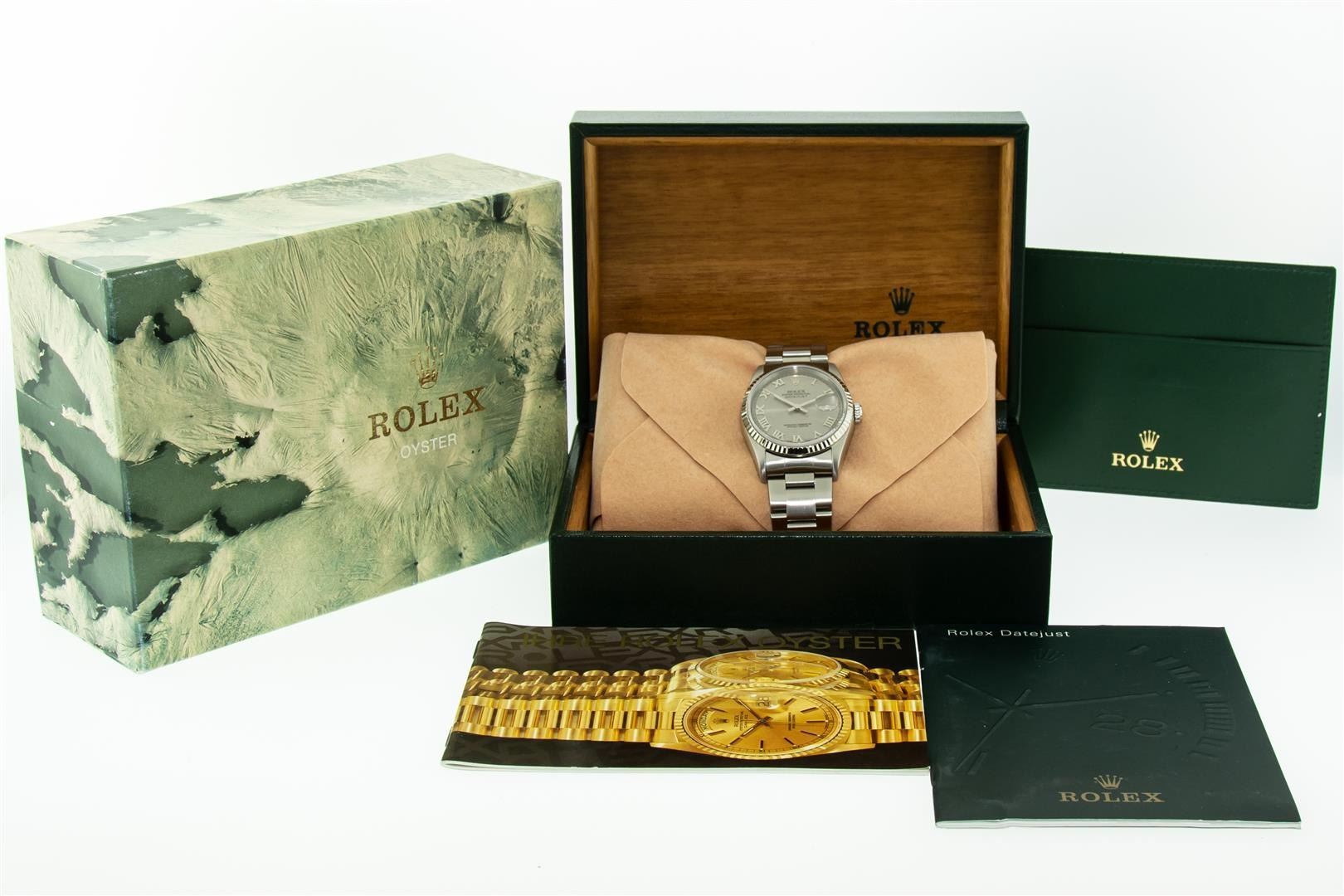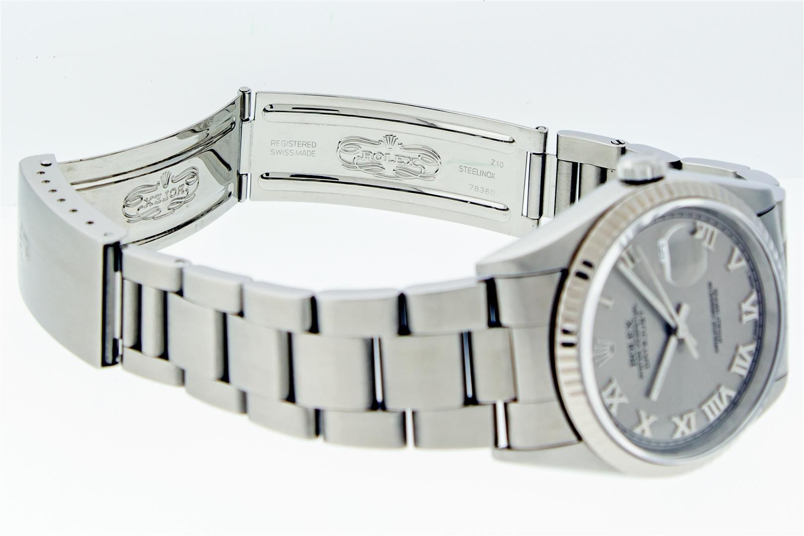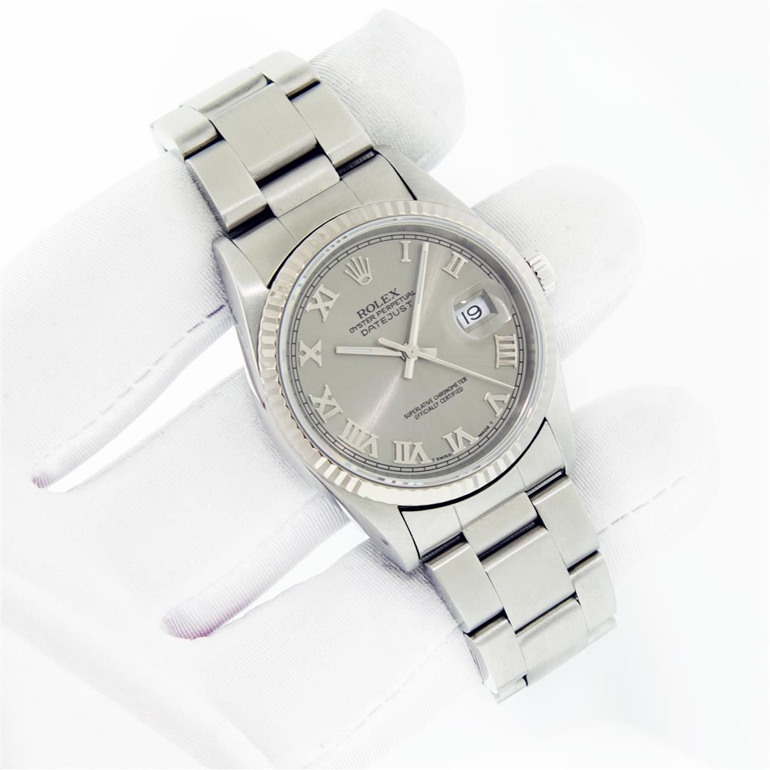 One Mens Pre Owned Stainless Steel Rolex Datejust Polished Bright with Satin Finish, This Watch Has Been Serviced & Electronically Tested, Rolex Stainless Steel Case: 36mm, Rolex Stainless Steel Crown, Rolex Bezel: 18K White Gold Fluted Bezel. Custom Crystal: New Sapphire With Magnified Date Window. Custom Hands: New Luminescent Hands. Rolex Movement: Automatic Winding Movement Caliber 3135. Custom Dial: Gray Roman With Square Track. Date Window: 3 O'Clock Position Date Display, Quickset, Model: Sapphire Datejust, Condition: G-6 Extra Fine. Rolex Bracelet: Stainless Steel Oyster Band. Bright Polish & Satin Finish. 7.0 Inch Length, Adjustable. Standard Clasp, With Rolex Logo. This Watch Has Been Serviced Time Tested And Is In Excellent Condition It Is Free Of All Scratches And Dents. This Watch Comes With Rolex Box, Booklets, & Wallet.
