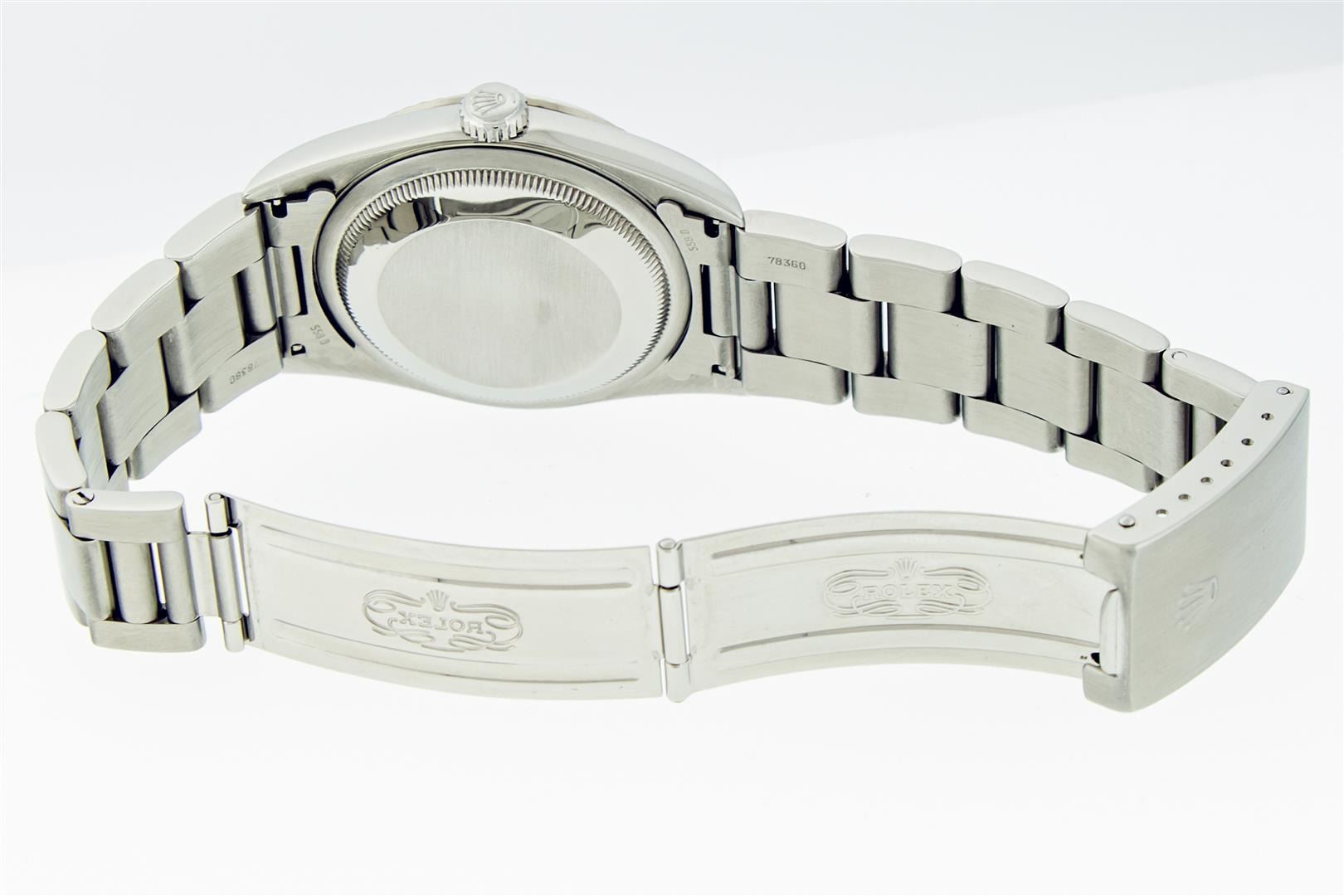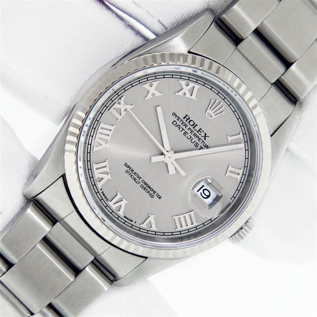One Mens Pre Owned Stainless Steel Rolex Datejust Polished Bright with Satin Finish, This Watch Has Been Serviced & Electronically Tested, Rolex Stainless Steel Case: 36mm, Rolex Stainless Steel Crown, Rolex Bezel: 18K White Gold Fluted Bezel. Custom Crystal: New Sapphire With Magnified Date Window. Custom Hands: New Luminescent Hands. Rolex Movement: Automatic Winding Movement Caliber 3135. Custom Dial: Gray Roman With Square Track. Date Window: 3 O'Clock Position Date Display, Quickset, Model: Sapphire Datejust, Condition: G-6 Extra Fine. Rolex Bracelet: Stainless Steel Oyster Band. Bright Polish & Satin Finish. 7.0 Inch Length, Adjustable. Standard Clasp, With Rolex Logo. This Watch Has Been Serviced Time Tested And Is In Excellent Condition It Is Free Of All Scratches And Dents. This Watch Comes With Rolex Box, Booklets, & Wallet.