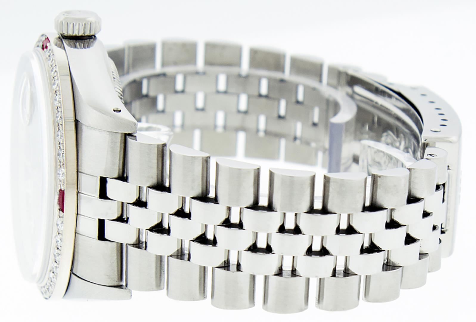 One Pre Owned Stainless Steel Rolex Datejust 36MM Polished Bright with Satin Finish, This Watch Has Been Serviced & Electronically Tested, Rolex Stainless Steel Case: 36mm, Rolex Stainless Steel Crown, Custom Bezel: New 18K White Gold Ruby Beadset Diamond Bezel, Diamond + Gem Count: 36 Diamonds + 4 Rubies. Custom Crystal: New Sapphire With Date Window. Custom Hands: New Luminescent Hands. Rolex Movement: Automatic Winding Movement 3035. Custom Dial: Custom Slate Grey Dial With Added Diamond Hour Markers, Diamond Count: 10 Diamonds in Dial. Date Window: 3 O'Clock Position Date Display, Quickset, Model: Datejust, Condition: G-6 Extra Fine. Rolex Bracelet: Stainless Steel Jubilee Band. Bracelet: 7.0 Inch Length, Adjustable. Standard Clasp, With Rolex Logo. This Watch Has Been Serviced Time Tested And Is In Excellent Condition It Is Free Of All Scratches And Dents.