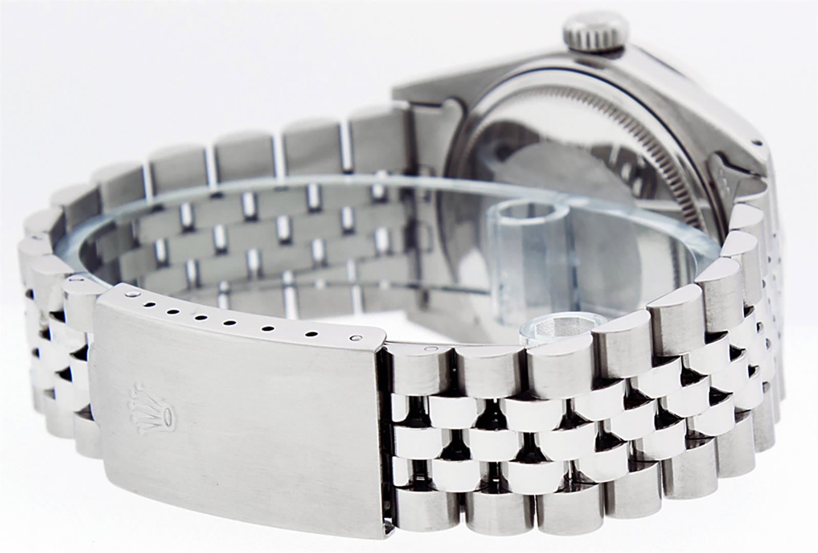 One Mens Stainless Steel Rolex Datejust Polished, Serviced & Electronically Tested, Stainless Steel Case: 36mm, Stainless Steel Crown, Custom Bezel: New 18K White Gold Emerald Beadset Diamond Bezel, Diamond + Gem Count: 36 Diamonds + 4 Emeralds, Total Weight 1.00 Carat, Clarity: SI-VS, Color: G to H. Custom Crystal: New Scratch Resistant Synthetic Sapphire Cyclops Lens. Custom Hands: New Luminescent Hands. Movement: Automatic Winding Movement Caliber 3035. Custom Dial: Green Diamond Dial With Dash Track, 10 Diamonds in Dial, G To H In Color, Clarity: SI-VS. Date Window: 3 O'Clock Position Date Display, Quickset, Model: Datejust. Condition: G-6 Extra Fine. Bracelet: Stainless Steel Jubilee. Bright Polish & Satin Finish. 7.0 Inch Length, Adjustable. Standard Clasp, With Rolex Logo. This Watch Has Been Serviced Time Tested And Is In Excellent Condition It Is Free Of All Scratches And Dents