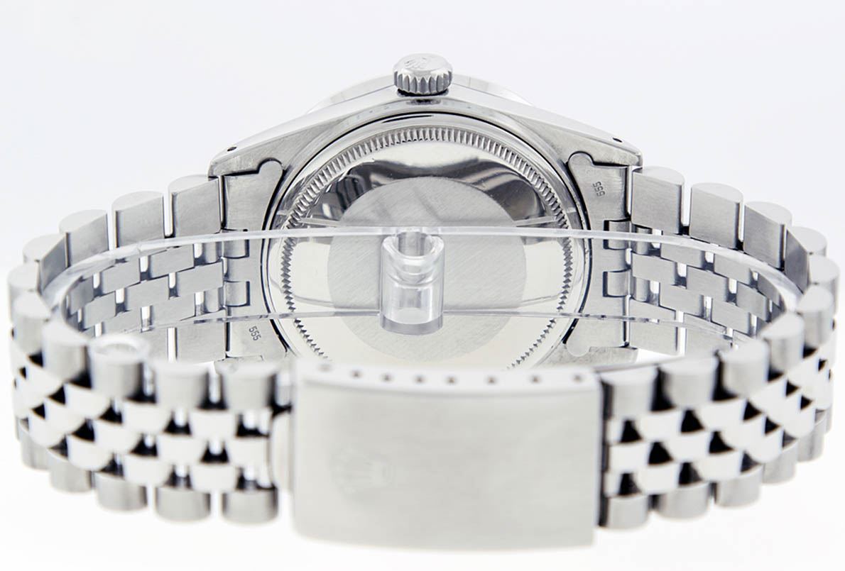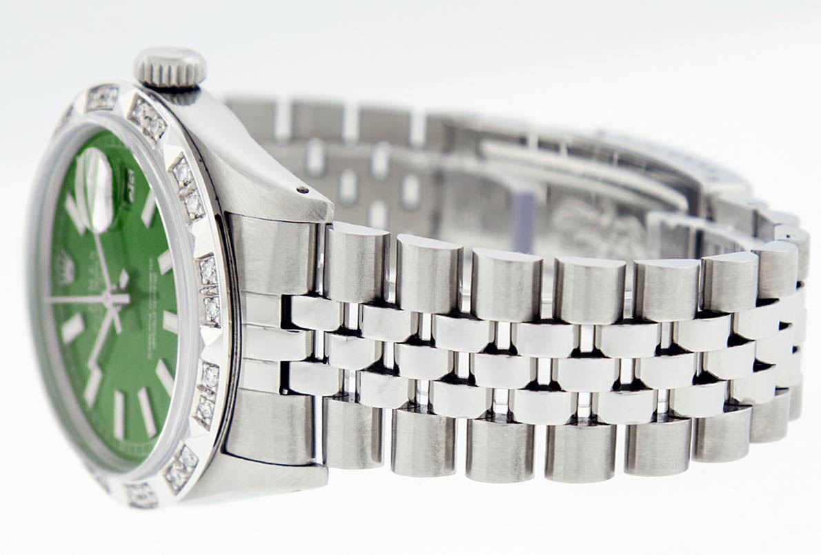 One Mens Rolex Datejust Polished Bright with Satin Finish, Serviced & Electronically Tested, Stainless Steel Case:36mm, Stainless Steel Crown, Custom Bezel: 18K White Gold Pyramid Diamond Bezel, Diamond Count: 24 Diamonds Total Weight .70 Carat, Clarity: SI-VS, Color: G to H. Custom Crystal: Synthetic Sapphire Cyclops Lens. Movement: Automatic Winding Movement Caliber 3035. Custom Dial: Green Index Dial. Date Window: 3 O'Clock Position Date Display, Quickset, Model: Datejust, Condition: G-6 Extra Fine. Bracelet:Stainless Steel Jubilee. Bright Polish & Satin Finish. 7.0 Inch Length, Adjustable. Standard Clasp, With Rolex Logo.