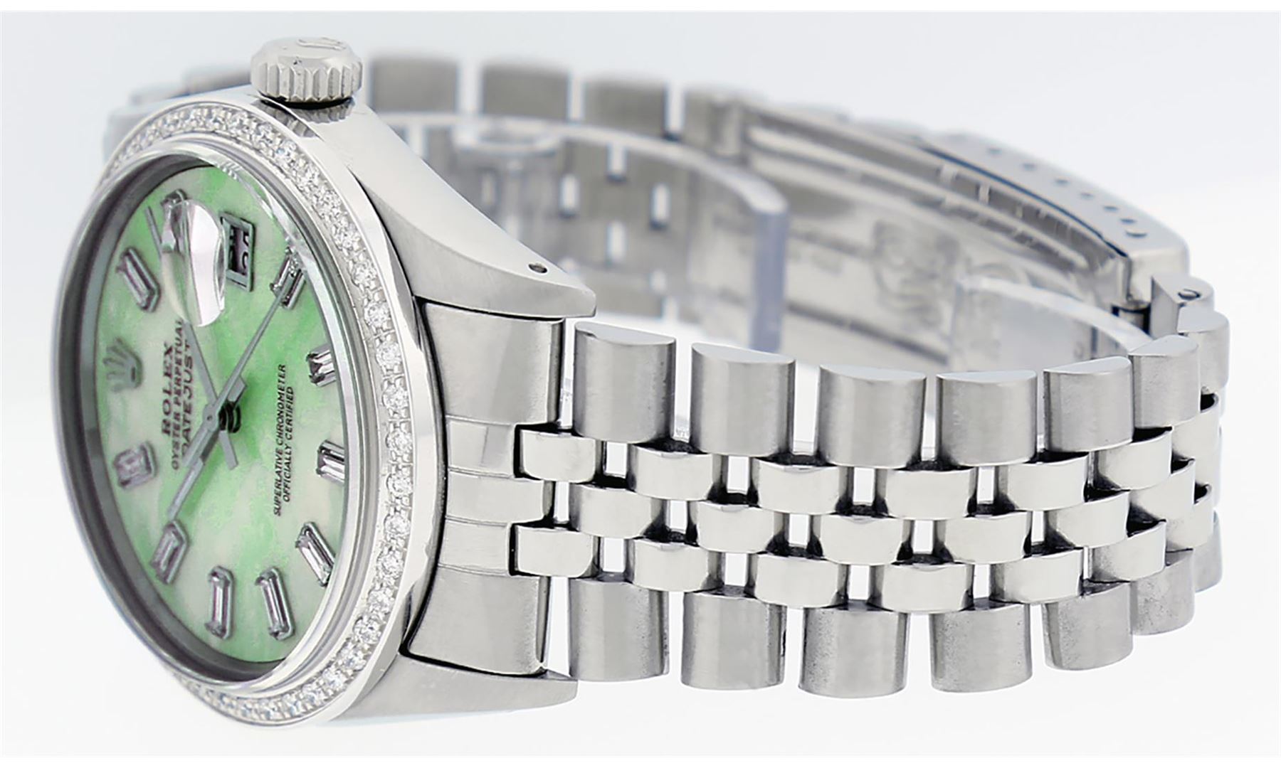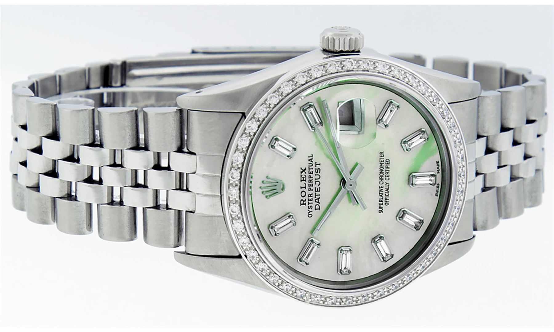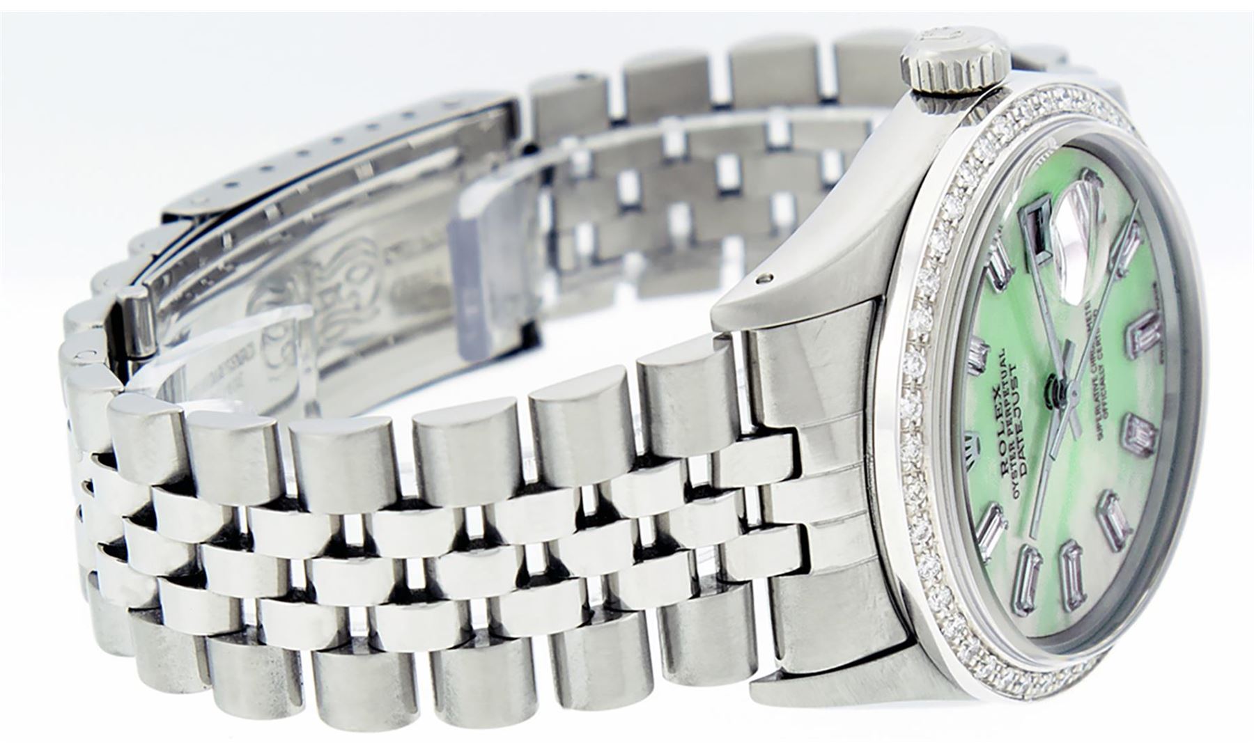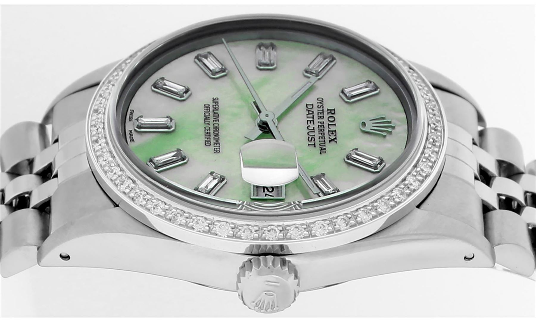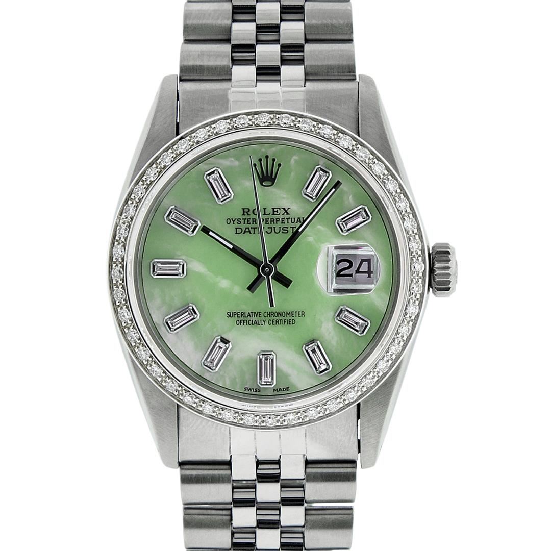 One Mens Rolex Stainless Steel Datejust Polished Bright with Satin Finish, This Watch Has Been Serviced & Electronically Tested, Stainless Steel Case: 36mm, Stainless Steel Crown, Custom Bezel: New 18K White Gold Beadset Diamond Bezel, Diamond Count: 44 Diamonds In Bezel, Total Weight 1.00 Carat, Clarity: SI-VS, Color: G to H. Custom Crystal: New Scratch Resistant Synthetic Sapphire Cyclops Lens. Custom Hands: New Luminescent Hands. Movement: Automatic Winding Movement Caliber 3035. Custom Dial: Green Mother Of Pearl Diamond Dial, Diamond Count: 10 Baguette Diamonds On Dial, Color: G to H, Clarity: VS2-SI1. Date Window: 3 O'Clock Position Date Display, Quickset, Model: Datejust. Condition: G-6 Extra Fine. Bracelet: Stainless Steel Jubilee Band. Bright Polish & Satin Finish. 7.0 Inch Length, Adjustable. Standard Clasp, With Rolex Logo. This Watch Has Been Serviced Time Tested And Is In Excellent Condition It Is Free Of All Scratches And Dents.