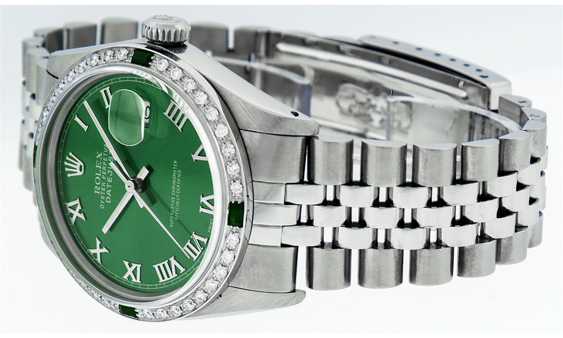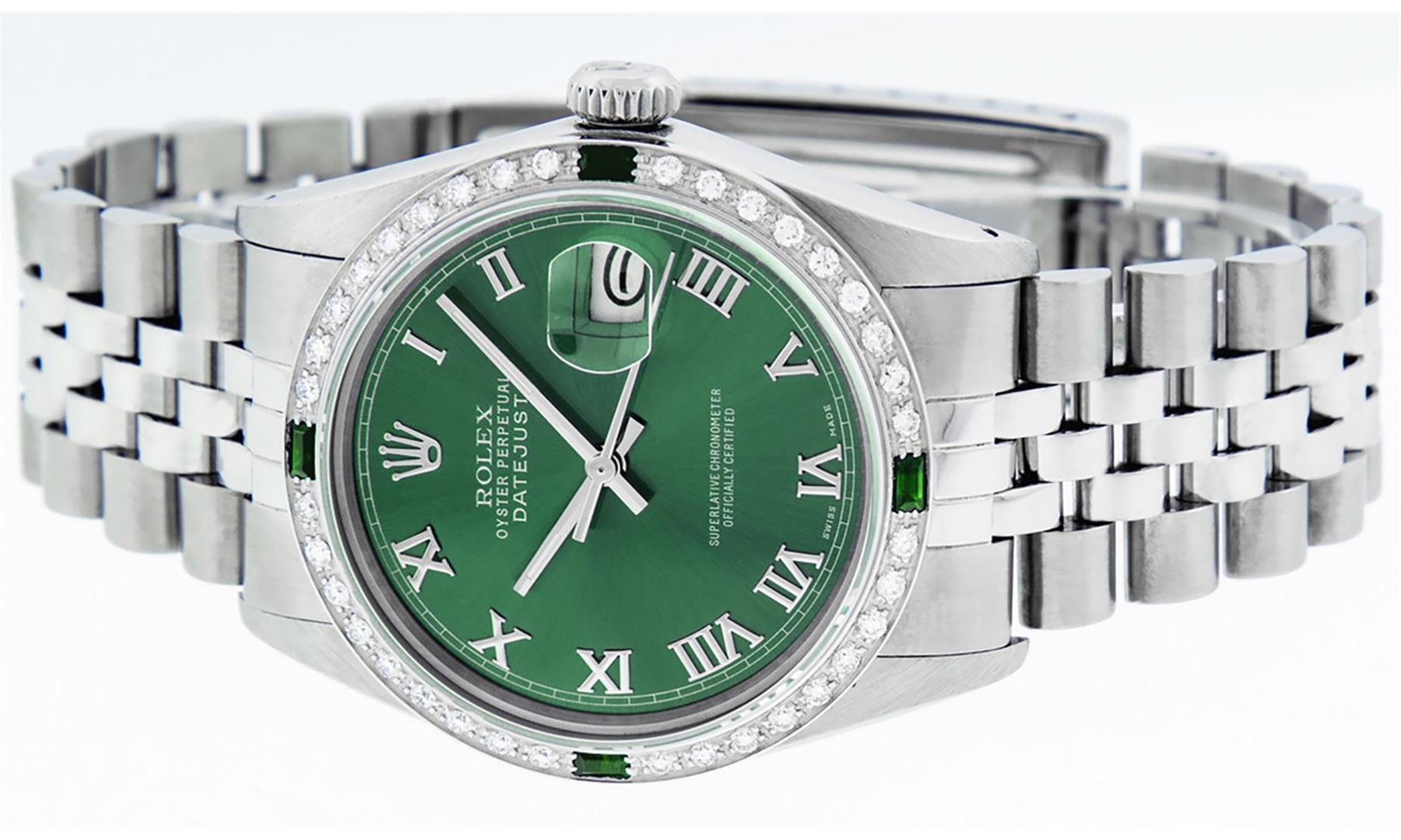 One Mens Stainless Steel Rolex Datejust Polished Bright with Satin Finish, This Watch Has Been Serviced & Electronically Tested, Stainless Steel Case: 36mm, Stainless Steel Crown, Custom Bezel: New 18K White Gold Emerald Beadset Diamond Bezel, Diamond + Gem Count: 36 Diamonds + 4 Emeralds, Total Weight 1.00 Carat, Clarity: SI-VS, Color: G to H. Custom Crystal: New Scratch Resistant Synthetic Sapphire Cyclops Lens. Custom Hands: New Luminescent Hands. Movement: Automatic Winding Movement Caliber 3035. Custom Dial: Green With Roman Track & Square Track. Date Window: 3 O'Clock Position Date Display, Quickset, Model: Datejust, Condition: G-6 Extra Fine. Bracelet: Stainless Steel Jubilee Band. Bracelet: 7.0 Inch Length, Adjustable. Standard Clasp, With Rolex Logo. This Watch Has Been Serviced Time Tested And Is In Excellent Condition It Is Free Of All Scratches And Dents.