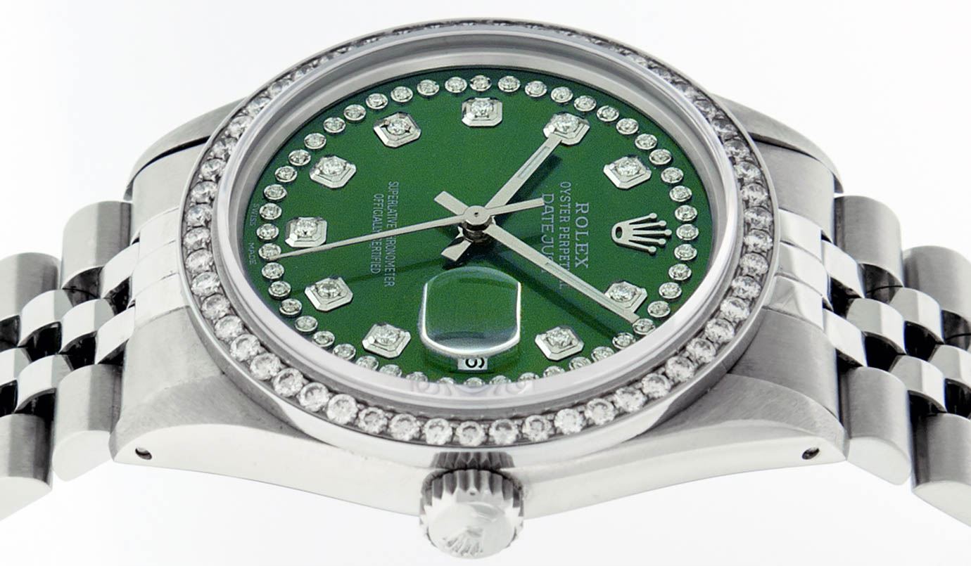 One Mens Rolex Stainless Steel Datejust Polished Bright with Satin Finish, This Watch Has Been Serviced & Electronically Tested, Stainless Steel Case: 36mm, Stainless Steel Crown, Custom Bezel: New Stainless Steel Beadset Diamond Bezel, Diamond Count: 54 Diamonds, Total Weight 1.00 Carat, Clarity: SI-VS, Color: G to H. Custom Crystal: New Synthetic Sapphire Cyclops Lens. Custom Hands: New Luminescent Hands. Movement: Automatic Winding Movement Caliber 3035. Custom Dial: Green String Diamond Dial, Diamond Count: 58 Diamonds In Dial, Color: G to H, Clarity: VS2-SI1. Date Window: 3 O'Clock Position Date Display, Quickset, Model: Datejust. Condition: G-6 Extra Fine. Bracelet: Stainless Steel Jubilee Band. Bright Polish & Satin Finish. 7.0 Inch Length, Adjustable. Standard Clasp, With Rolex Logo. This Watch Has Been Serviced Time Tested And Is In Excellent Condition It Is Free Of All Scratches And Dents.