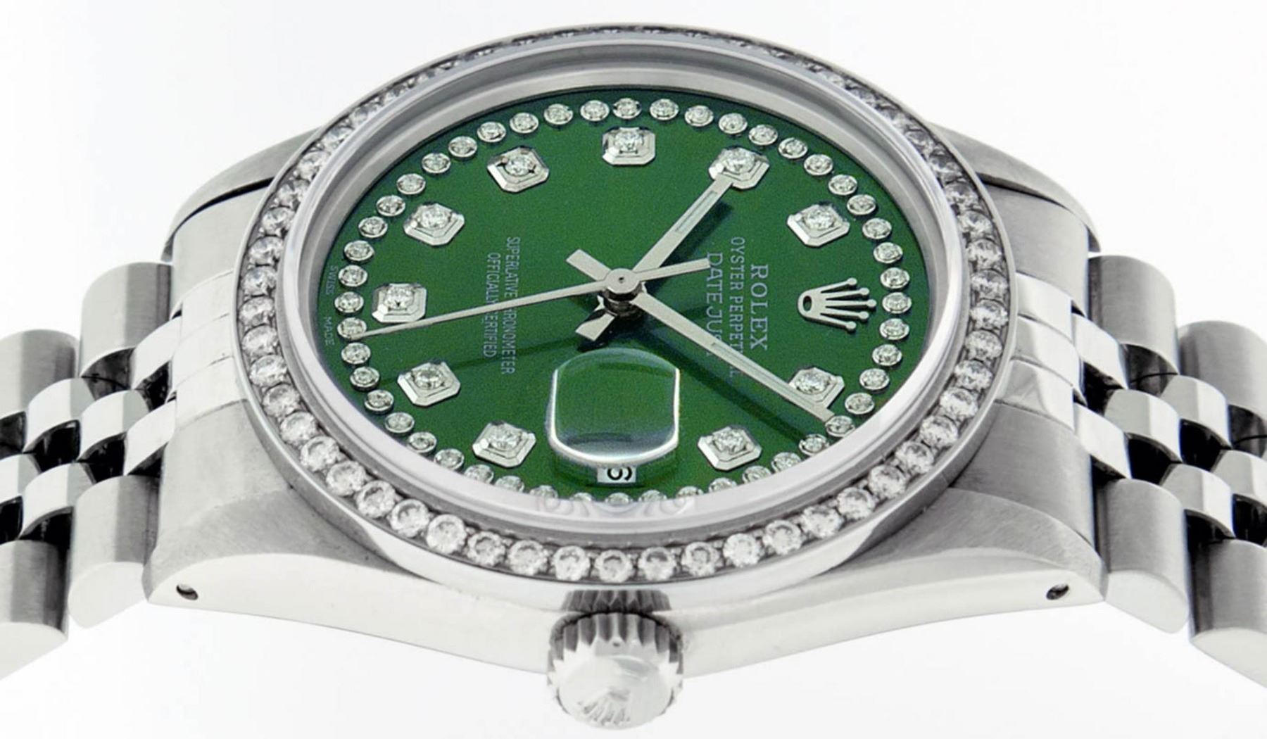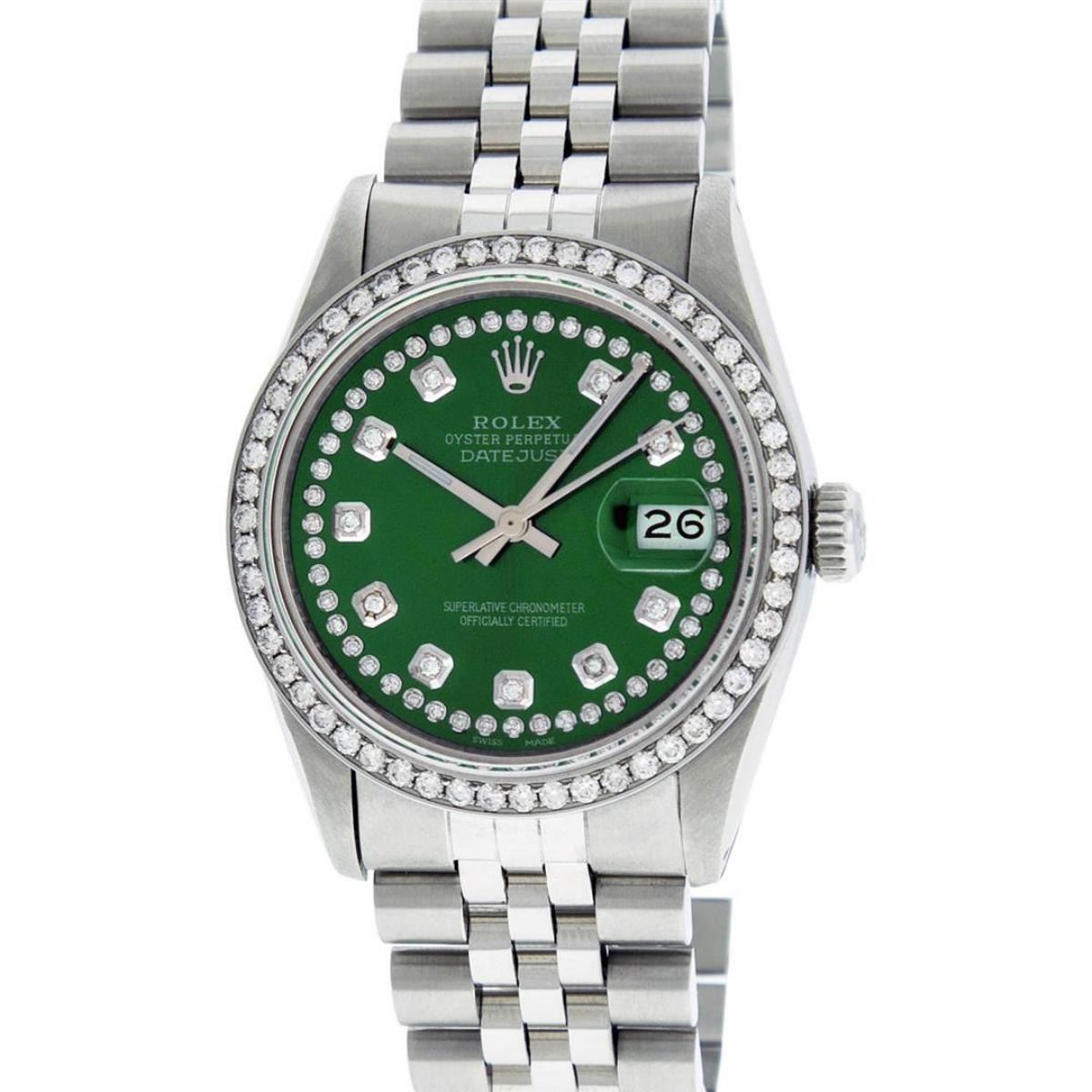 One Mens Rolex Stainless Steel Datejust Polished Bright with Satin Finish, This Watch Has Been Serviced & Electronically Tested, Stainless Steel Case: 36mm, Stainless Steel Crown, Custom Bezel:�New Stainless Steel�Beadset Diamond Bezel, Diamond Count:�54 Diamonds, Total Weight 1.00 Carat, Clarity: SI-VS, Color: G to H. Custom Crystal: New Synthetic Sapphire Cyclops Lens. Custom Hands: New Luminescent Hands. Movement: Automatic Winding Movement Caliber 3035. Custom Dial: Green String Diamond Dial, Diamond Count: 58 Diamonds In Dial, Color: G to H, Clarity: VS2-SI1. Date Window: 3 O'Clock Position Date Display, Quickset, Model: Datejust. Condition: G-6 Extra Fine. Bracelet: Stainless Steel Jubilee Band. Bright Polish & Satin Finish.�7.0 Inch Length, Adjustable. Standard Clasp, With Rolex Logo. This Watch Has Been Serviced Time Tested And Is In Excellent Condition It Is Free Of All Scratches And Dents.