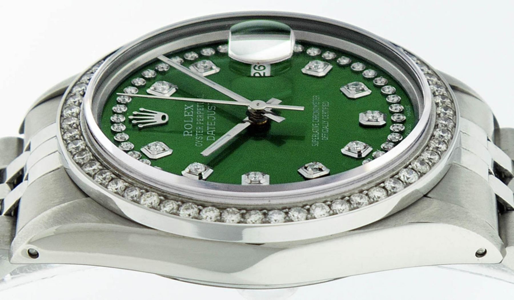 One Mens Rolex Stainless Steel Datejust Polished Bright with Satin Finish, This Watch Has Been Serviced & Electronically Tested, Stainless Steel Case: 36mm, Stainless Steel Crown, Custom Bezel: New Stainless Steel Beadset Diamond Bezel, Diamond Count: 54 Diamonds, Total Weight 1.00 Carat, Clarity: SI-VS, Color: G to H. Custom Crystal: New Synthetic Sapphire Cyclops Lens. Custom Hands: New Luminescent Hands. Movement: Automatic Winding Movement Caliber 3035. Custom Dial: Green String Diamond Dial, Diamond Count: 58 Diamonds In Dial, Color: G to H, Clarity: VS2-SI1. Date Window: 3 O'Clock Position Date Display, Quickset, Model: Datejust. Condition: G-6 Extra Fine. Bracelet: Stainless Steel Jubilee Band. Bright Polish & Satin Finish. 7.0 Inch Length, Adjustable. Standard Clasp, With Rolex Logo. This Watch Has Been Serviced Time Tested And Is In Excellent Condition It Is Free Of All Scratches And Dents.