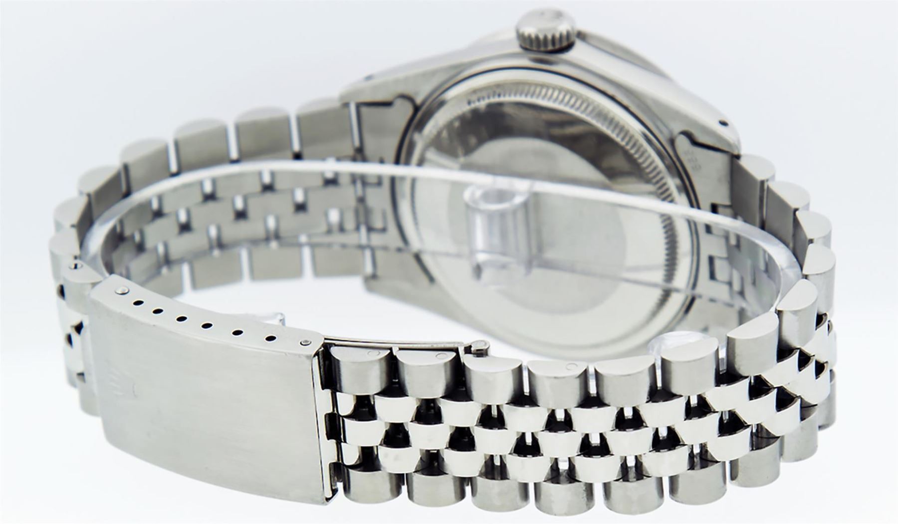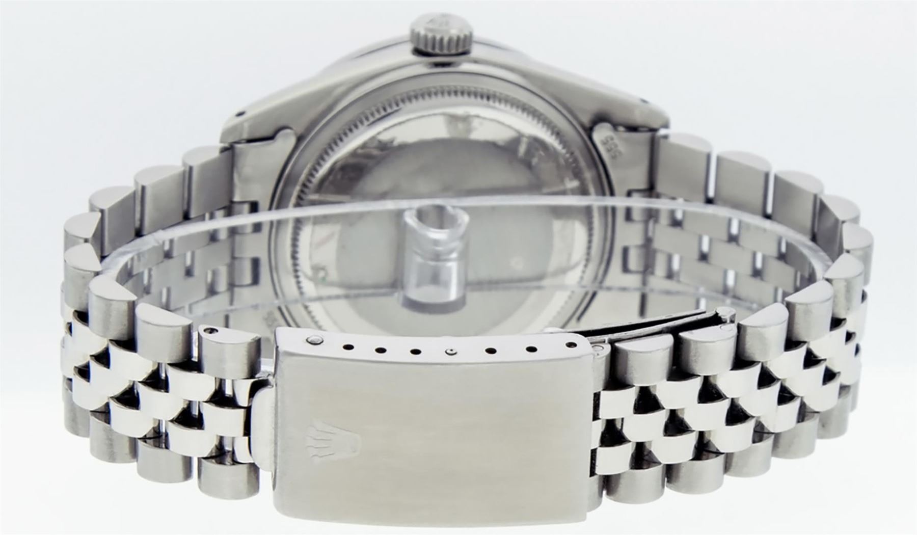 One Mens Rolex Stainless Steel Datejust Polished Bright with Satin Finish, This Watch Has Been Serviced & Electronically Tested, Stainless Steel Case: 36mm, Stainless Steel Crown, Custom Bezel: New Stainless Steel Bead-set Diamond Bezel, Diamond Count: 54 Diamonds, Total Weight 1.00 Carat, Clarity: SI-VS, Color: G to H. Custom Crystal: New Synthetic Sapphire Cyclops Lens. Custom Hands: New Luminescent Hands. Movement: Automatic Winding Movement. Custom Dial: Green String Diamond Dial, Diamond Count: 58 Diamonds In Dial, Color: G to H, Clarity: VS2-SI1. Date Window: 3 O'clock Position Date Display, Quick-Set, Model: Datejust. Condition: G-6 Extra Fine. Bracelet: Stainless Steel Jubilee Band. Bright Polish & Satin Finish. 7.0 Inch Length, Adjustable. Standard Clasp, With Rolex Logo. This Watch Has Been Serviced Time Tested And Is In Excellent Condition It Is Free Of All Scratches And Dents.