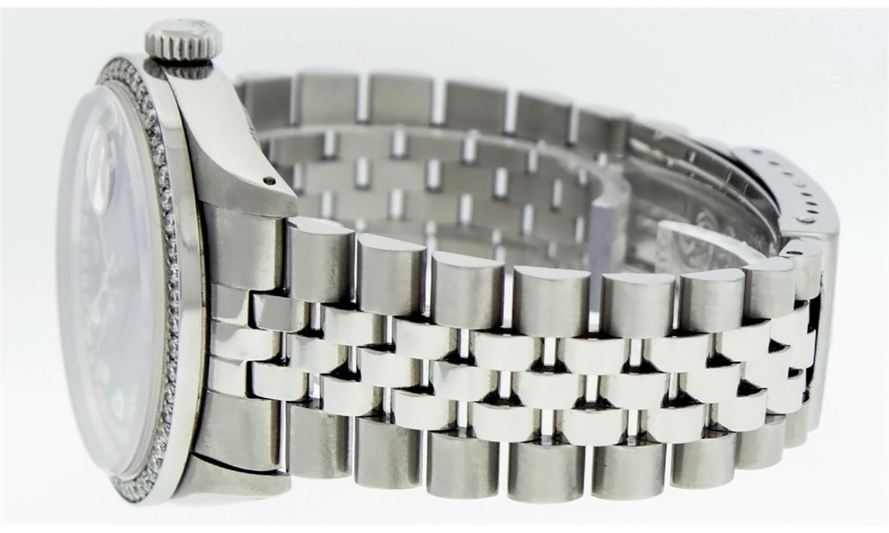One Mens Rolex Stainless Steel Datejust Polished Bright with Satin Finish, This Watch Has Been Serviced & Electronically Tested, Stainless Steel Case: 36mm, Stainless Steel Crown, Custom Bezel: New Stainless Steel Bead-set Diamond Bezel, Diamond Count: 54
