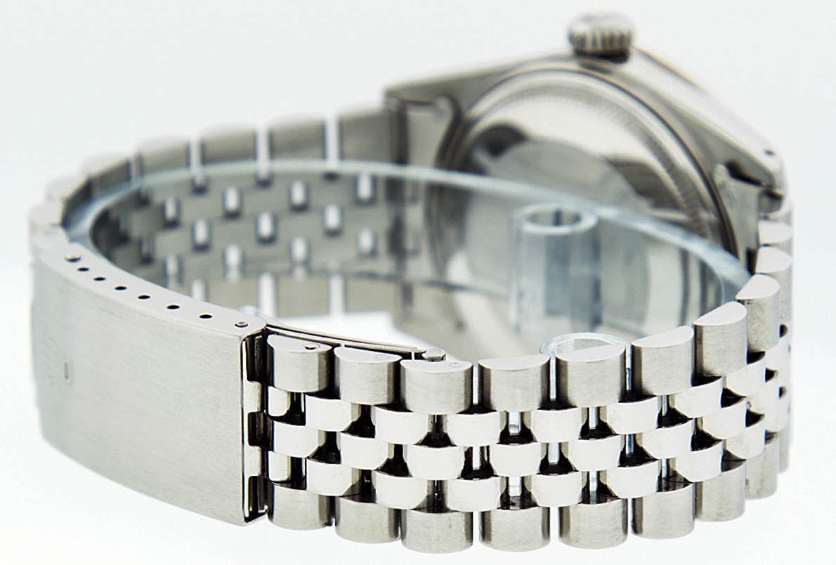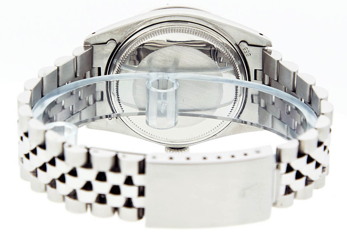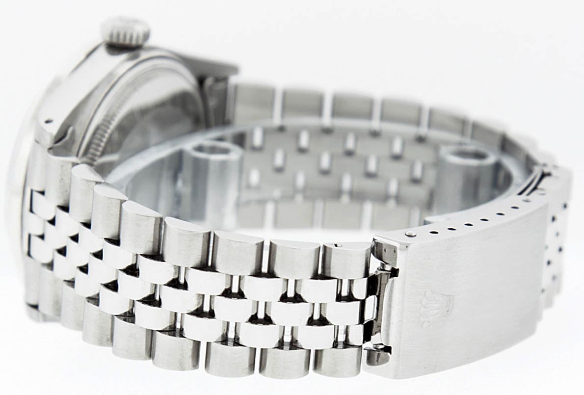 One Mens Rolex Datejust Polished, Serviced & Electronically Tested, Stainless Steel Case:36mm, Stainless Steel Crown, Custom Bezel: 18K White Gold Emerald Beadset Diamond Bezel, Diamond + Gem Count: 36 Diamonds + 4 Emeralds. Total Weight 1.00 Carat, Clarity: SI-VS, Color: G to H. Custom Crystal: Synthetic Sapphire Cyclops Lens. Movement: Automatic Winding Movement Caliber 3035. Custom Dial: Green Vignette With Diamond Hour Markers Square Roman Track, 10 Diamond Dial Square Setting. G To H In Color, Clarity: SI-VS. Date Window: 3 O'Clock Position Date Display, Quickset, Model: Datejust. Condition: G-6 Extra Fine. Bracelet: Stainless Steel Jubilee. Bright Polish & Satin Finish. 7.0 Inch Length, Adjustable. Standard Clasp, With Rolex Logo.