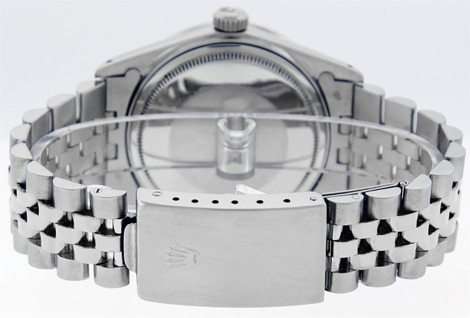 One Mens Stainless Steel Rolex Datejust Polished, Serviced & Electronically Tested, Stainless Steel Case: 36mm, Stainless Steel Crown, Custom Bezel: New 18K White Gold Synthetic Emerald Beadset Diamond Bezel, Diamond + Gem Count: 36 Diamonds + 4 Synthetic Emeralds, Total Weight 1.00 Carat, Clarity: SI-VS, Color: G to H. Custom Crystal: New Synthetic Sapphire Cyclops Lens. Custom Hands: New Luminescent Hands. Movement: Automatic Winding Movement Caliber 3035. Custom Dial: Green Vignette With Diamond Hour Markers, 10 Diamond Dial, G To H In Color, Clarity: SI-VS. Date Window: 3 O'Clock Position Date Display, Quickset, Model: Datejust. Condition: G-6 Extra Fine. Bracelet: Stainless Steel Jubilee. Bright Polish & Satin Finish. 7.0 Inch Length, Adjustable. Standard Clasp, With Rolex Logo. This Watch Has Been Serviced Time Tested And Is In Excellent Condition It Is Free Of All Scratches And Dents