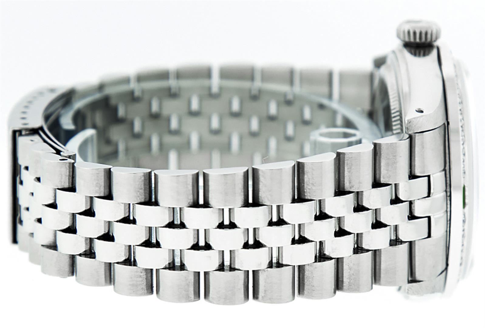 One Mens Stainless Steel Rolex Datejust Polished, Serviced & Electronically Tested, Stainless Steel Case: 36mm, Stainless Steel Crown, Custom Bezel: New 18K White Gold Emerald Beadset Diamond Bezel, Diamond + Gem Count: 36 Diamonds + 4 Emeralds, Total Weight 1.00 Carat, Clarity: SI-VS, Color: G to H. Custom Crystal: New Scratch Resistant Synthetic Sapphire Cyclops Lens. Custom Hands: New Luminescent Hands. Movement: Automatic Winding Movement Caliber 3035. Custom Dial: Green Vignette Diamond Dial With Roman Track, 10 Diamonds in Dial, G To H In Color, Clarity: SI-VS. Date Window: 3 O'Clock Position Date Display, Quickset, Model: Datejust. Condition: G-6 Extra Fine. Bracelet: Stainless Steel Jubilee Band. Bright Polish & Satin Finish. 7.0 Inch Length, Adjustable. Standard Clasp, With Rolex Logo. This Watch Has Been Serviced Time Tested And Is In Excellent Condition It Is Free Of All Scratches And Dents.