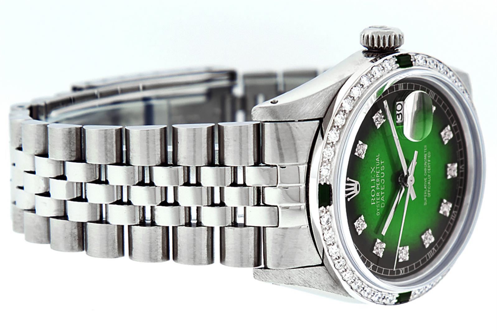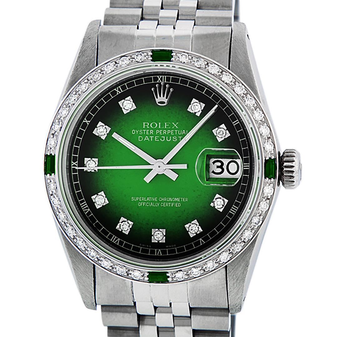 One Mens Stainless Steel Rolex Datejust Polished, Serviced & Electronically Tested, Stainless Steel Case: 36mm, Stainless Steel Crown, Custom Bezel: New 18K White Gold Emerald Beadset Diamond Bezel, Diamond + Gem Count: 36 Diamonds + 4 Emeralds, Total Weight 1.00 Carat, Clarity: SI-VS, Color: G to H. Custom Crystal: New Scratch Resistant Synthetic Sapphire Cyclops Lens. Custom Hands: New Luminescent Hands. Movement: Automatic Winding Movement Caliber 3035. Custom Dial: Green Vignette Diamond Dial With Roman Track, 10 Diamonds in Dial, G To H In Color, Clarity: SI-VS. Date Window: 3 O'Clock Position Date Display, Quickset, Model: Datejust. Condition: G-6 Extra Fine. Bracelet: Stainless Steel Jubilee Band. Bright Polish & Satin Finish. 7.0 Inch Length, Adjustable. Standard Clasp, With Rolex Logo. This Watch Has Been Serviced Time Tested And Is In Excellent Condition It Is Free Of All Scratches And Dents.