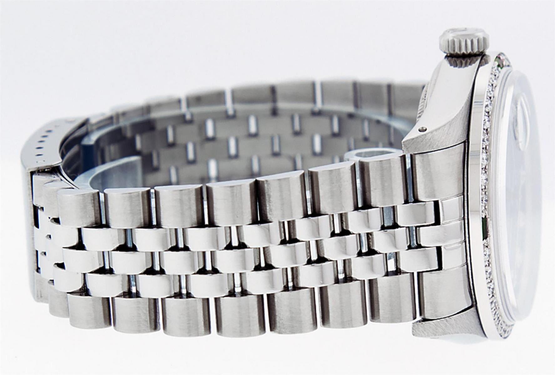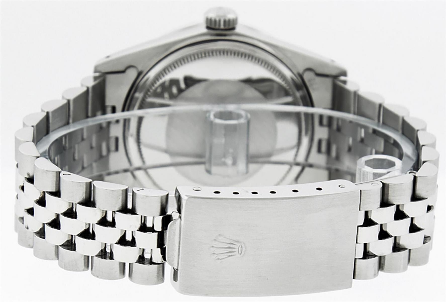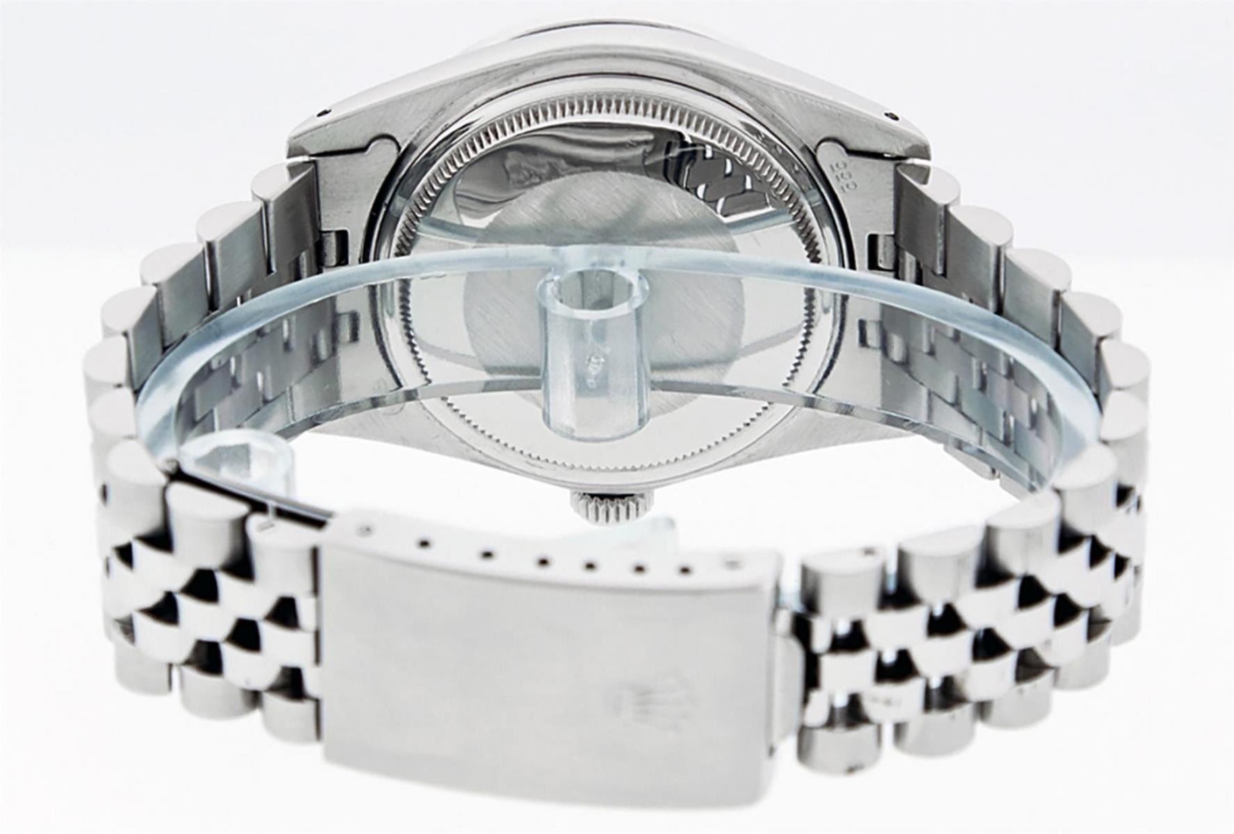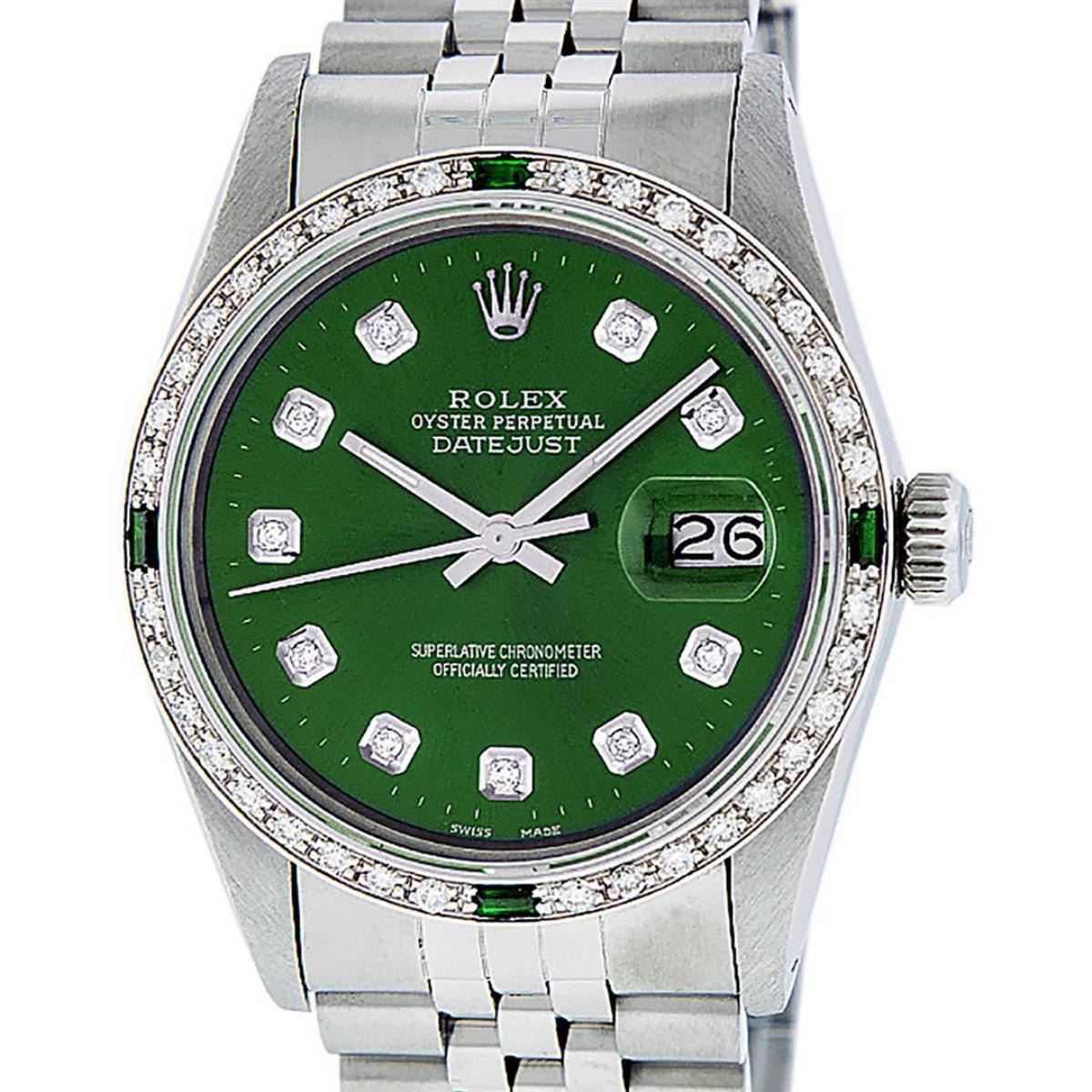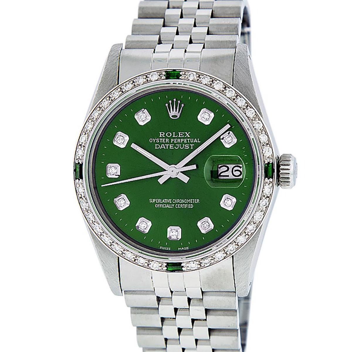 One Mens Stainless Steel Rolex Datejust Polished, Serviced & Electronically Tested, Stainless Steel Case: 36mm, Stainless Steel Crown, Custom Bezel: New 18K White Gold Synthetic Emerald Beadset Diamond Bezel, Diamond + Gem Count: 36 Diamonds + 4 Synthetic Emeralds, Total Weight 1.00 Carat, Clarity: SI-VS, Color: G to H. Custom Crystal: New Scratch Resistant Synthetic Sapphire Cyclops Lens. Custom Hands: New Luminescent Hands. Movement: Automatic Winding Movement. Custom Dial: Green Vignette With Diamond Hour Markers, 10 Diamond Dial, G To H In Color, Clarity: SI-VS. Date Window: 3 O'Clock Position Date Display, Quickset, Model: Datejust. Condition: G-6 Extra Fine. Bracelet: Stainless Steel Jubilee Band. Bright Polish & Satin Finish. 7.0 Inch Length, Adjustable. Standard Clasp, With Rolex Logo. This Watch Has Been Serviced Time Tested And Is In Excellent Condition It Is Free Of All Scratches And Dents