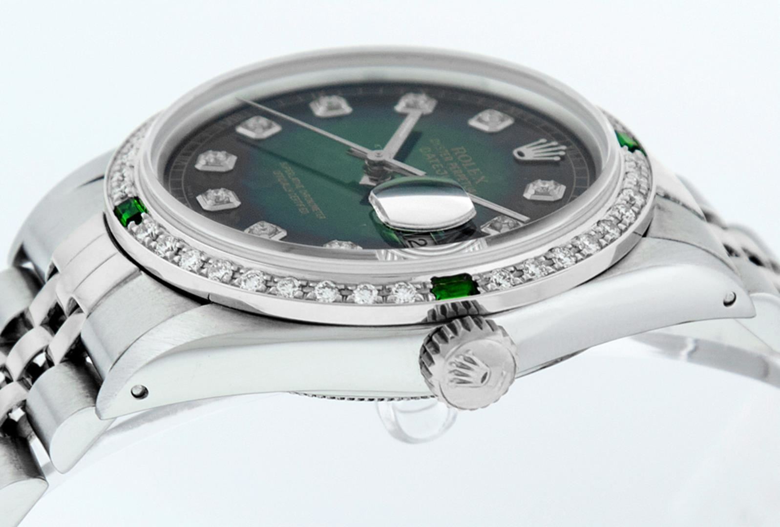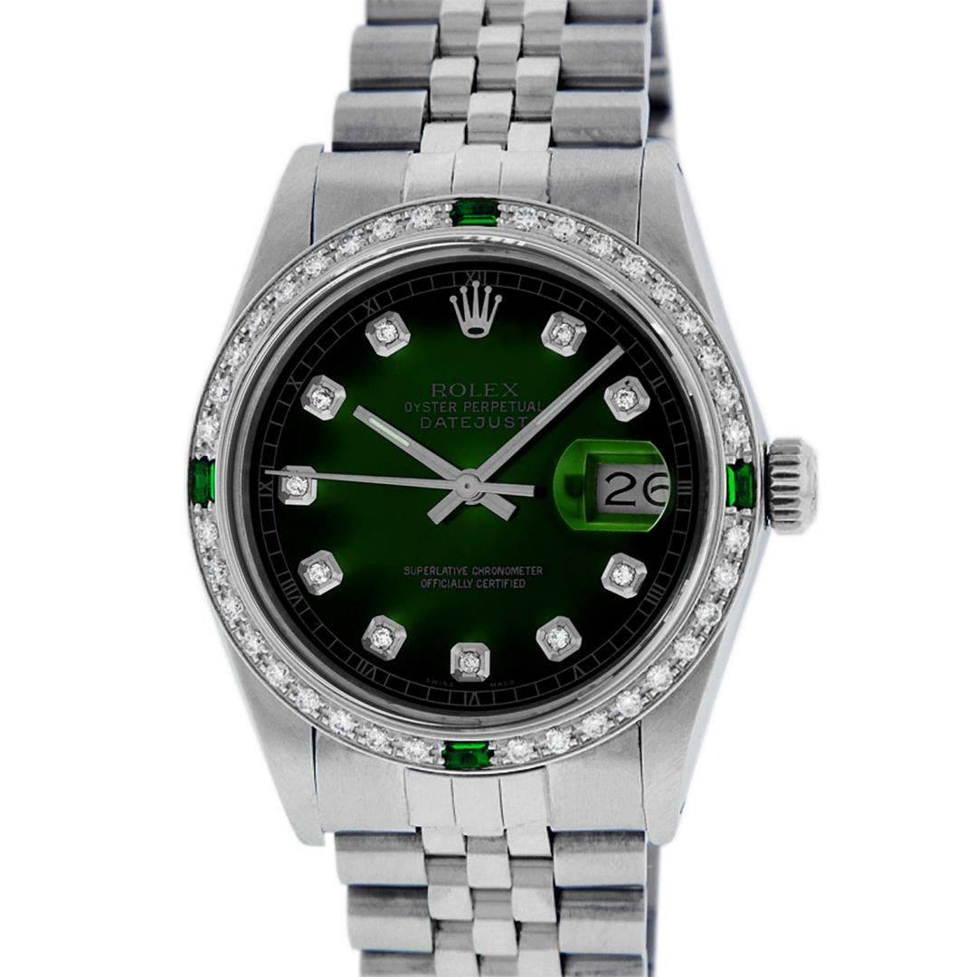 One Pre Owned Stainless Steel 36MM Rolex Datejust Polished, Serviced And Electronically Tested, Rolex Stainless Steel Case: 36mm, Rolex Stainless Steel Crown, Custom Bezel: New 18K White Gold Emerald Beadset Diamond Bezel, Diamond + Gem Count: 36 Diamonds + 4 Emeralds. Custom Crystal: New Sapphire With Magnified Date. Custom Hands: New Luminescent Hands. Rolex Movement: Automatic Winding Movement 3035. Custom Dial: Custom Green Vignette Dial With Added Diamond Hour Markers, 10 Diamonds In Dial. Date Window: 3 O'Clock Position Date Display, Quickset, Model: Quickset Datejust. Condition: G-6 Extra Fine. Rolex Bracelet: Stainless Steel Jubilee Band. Bright Polish & Satin Finish. 7.0 Inch Length, Adjustable. Fold Clasp, With Rolex Logo. This Watch Has Been Serviced Time Tested And Is In Excellent Condition It Is Free Of All Scratches And Dents.