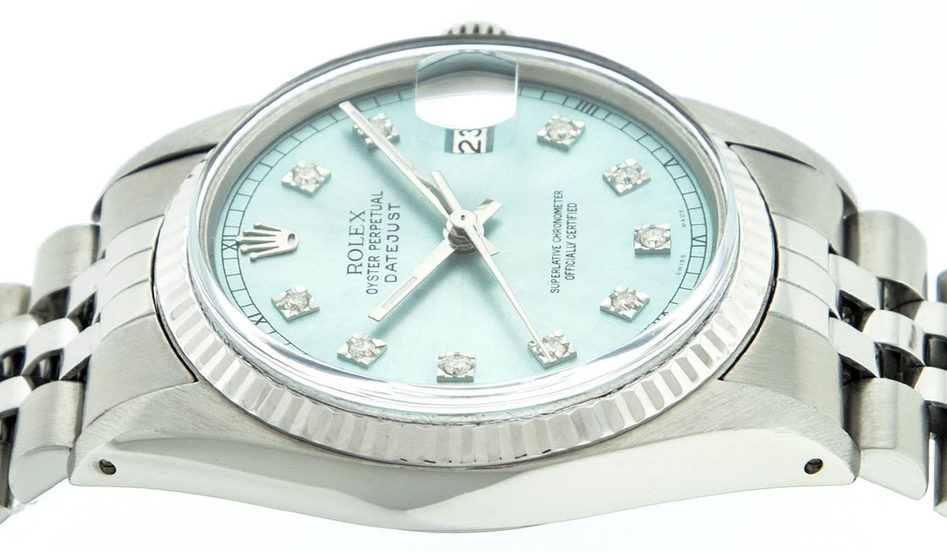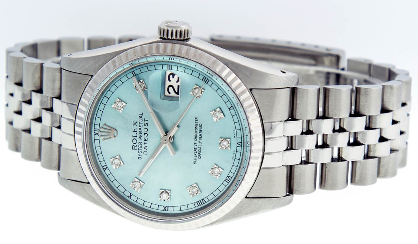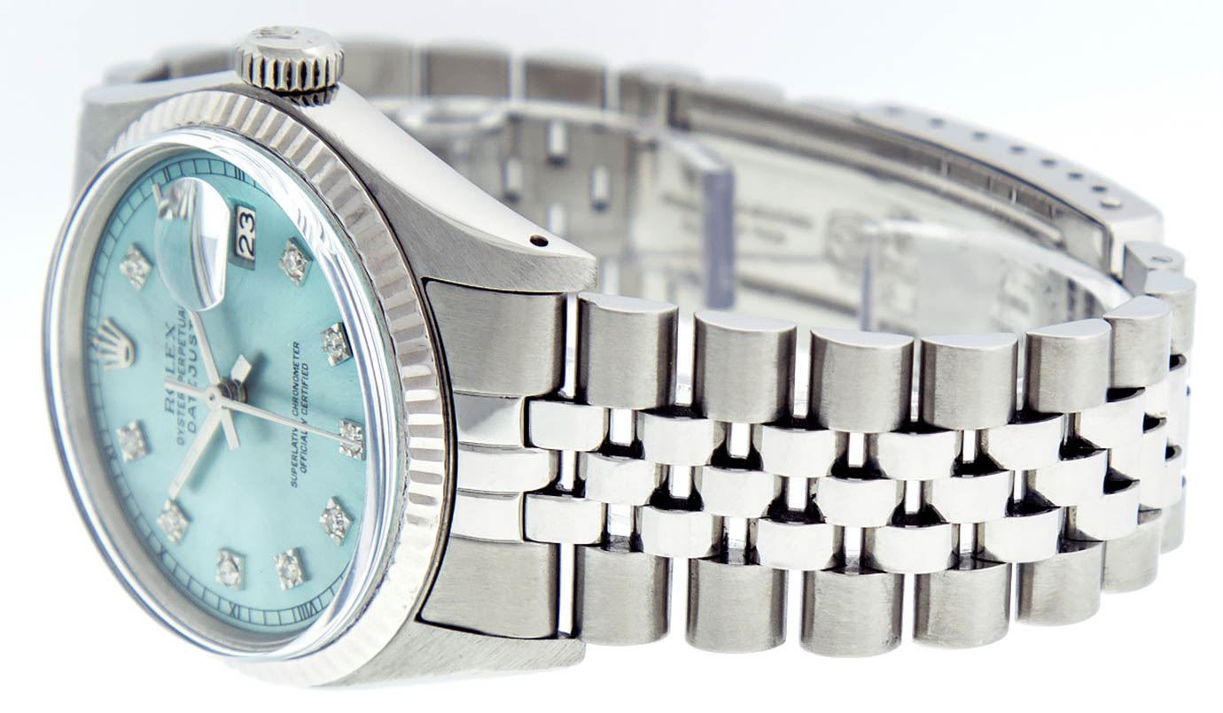 One Mens Stainless Steel Rolex Datejust Polished Bright with Satin Finish, This Watch Has Been Serviced & Electronically Tested, Stainless Steel Case: 36mm, Stainless Steel Crown, Original Bezel: 14K White Gold Fluted Bezel. Custom Crystal: New Acrylic Cyclops Lens. Custom Hands: New Luminescent Hands. Movement: Automatic Winding Movement Caliber 3035. Custom Dial: Ice Blue Dial With Diamond Hour Markers and Track Square Setting, 10 Diamonds in Dial G To H In Color, SI-VS Clarity. Date Window: 3 O'Clock Position Date Display, Quickset, Model: Datejust, Condition: G-6 Extra Fine. Bracelet:Stainless Steel Jubilee. Bright Polish & Satin Finish. 7.0 Inch Length, Adjustable. Standard Clasp, With Rolex Logo. This Watch Has Been Serviced Time Tested And Is In Excellent Condition It Is Free Of All Scratches And Dents