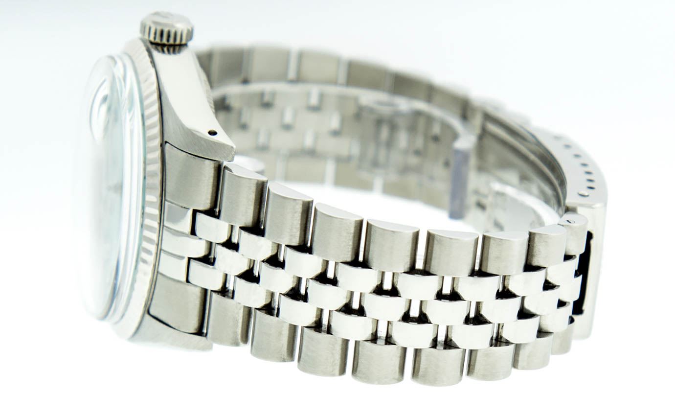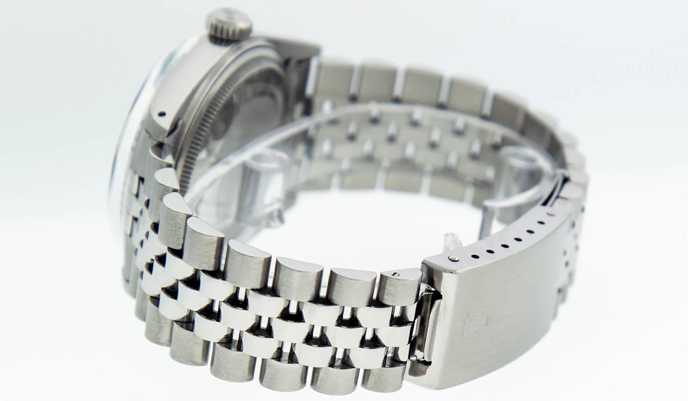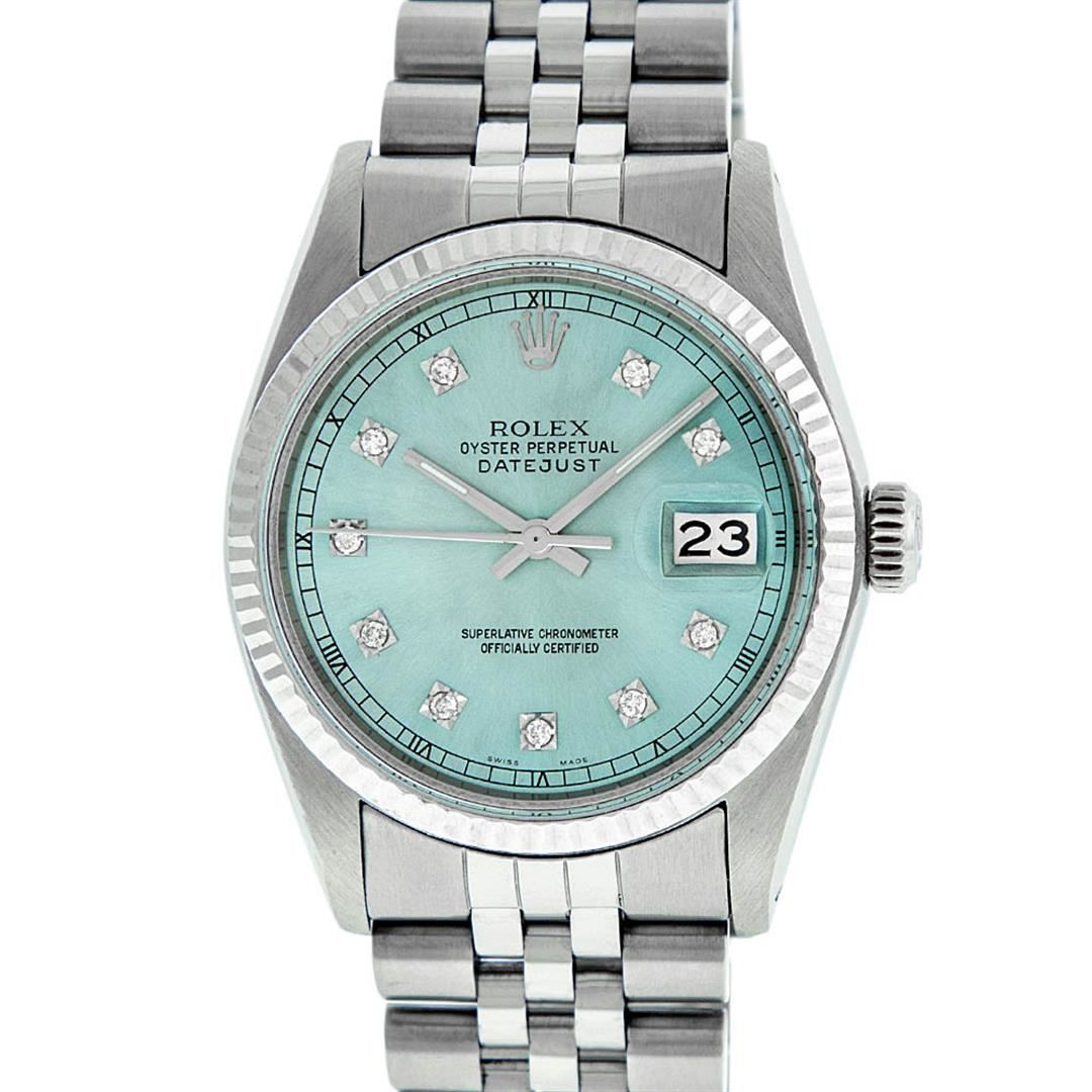 One Mens Stainless Steel Rolex Datejust Polished Bright with Satin Finish, This Watch Has Been Serviced & Electronically Tested, Stainless Steel Case: 36mm, Stainless Steel Crown, Original Bezel: 14K White Gold Fluted Bezel. Custom Crystal: New Acrylic Cyclops Lens. Custom Hands: New Luminescent Hands. Movement: Automatic Winding Movement Caliber 3035. Custom Dial: Ice Blue Dial With Diamond Hour Markers and Track Square Setting, 10 Diamonds in Dial G To H In Color, SI-VS Clarity. Date Window: 3 O'Clock Position Date Display, Quickset, Model: Datejust, Condition: G-6 Extra Fine. Bracelet:Stainless Steel Jubilee. Bright Polish & Satin Finish. 7.0 Inch Length, Adjustable. Standard Clasp, With Rolex Logo. This Watch Has Been Serviced Time Tested And Is In Excellent Condition It Is Free Of All Scratches And Dents