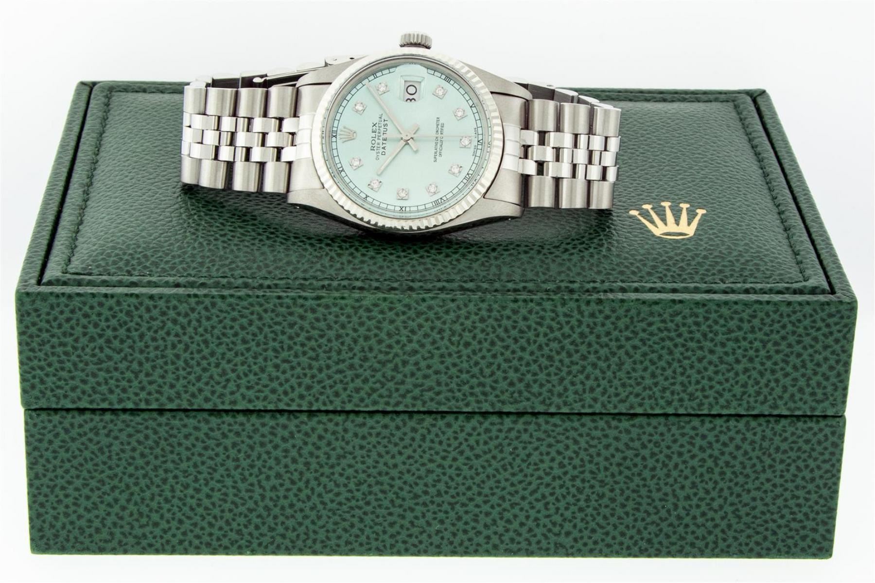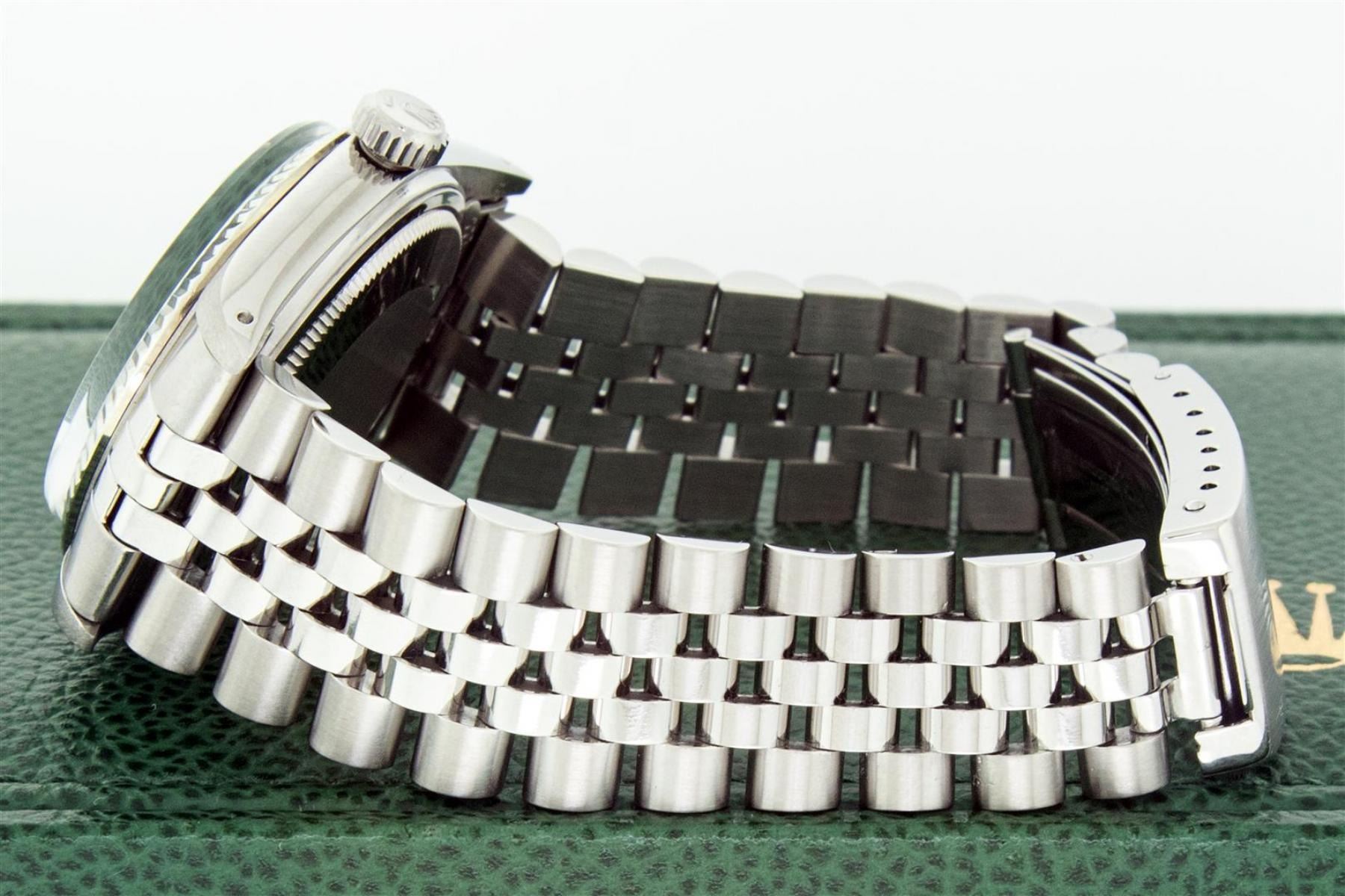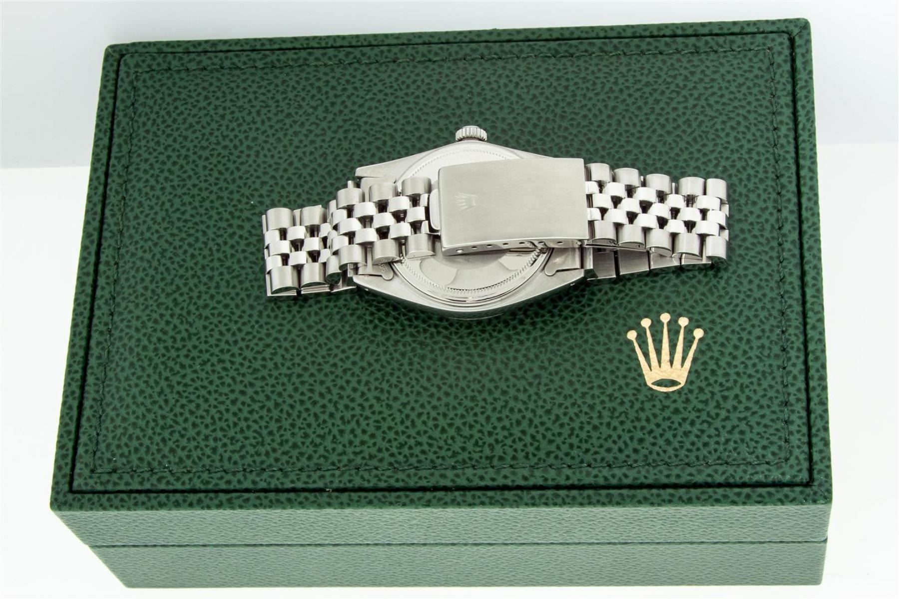 One Mens Stainless Steel Rolex Datejust Polished Bright with Satin Finish, This Watch Has Been Serviced & Electronically Tested, Stainless Steel Case: 36mm, Stainless Steel Crown, Bezel: 14K White Gold Fluted Bezel. Custom Crystal: New Acrylic Cyclops Len