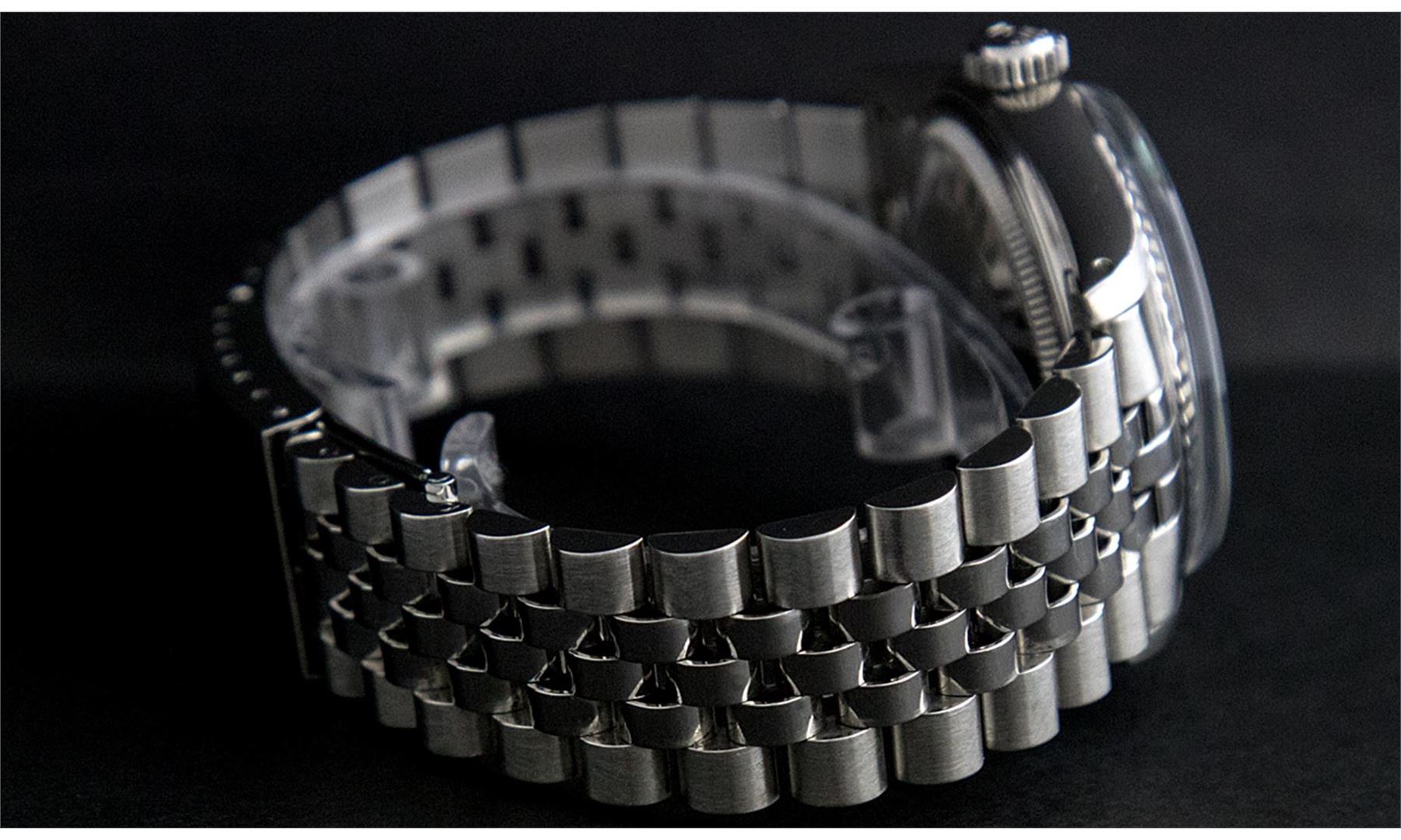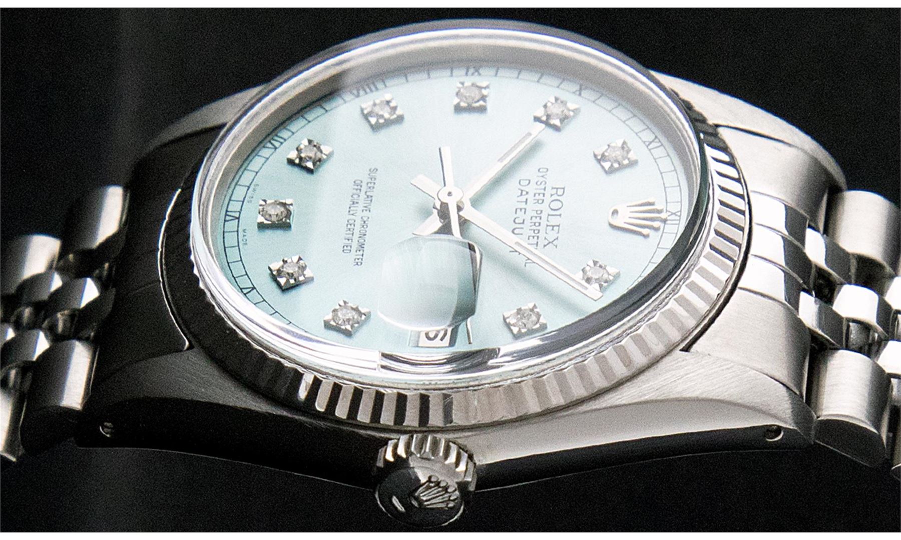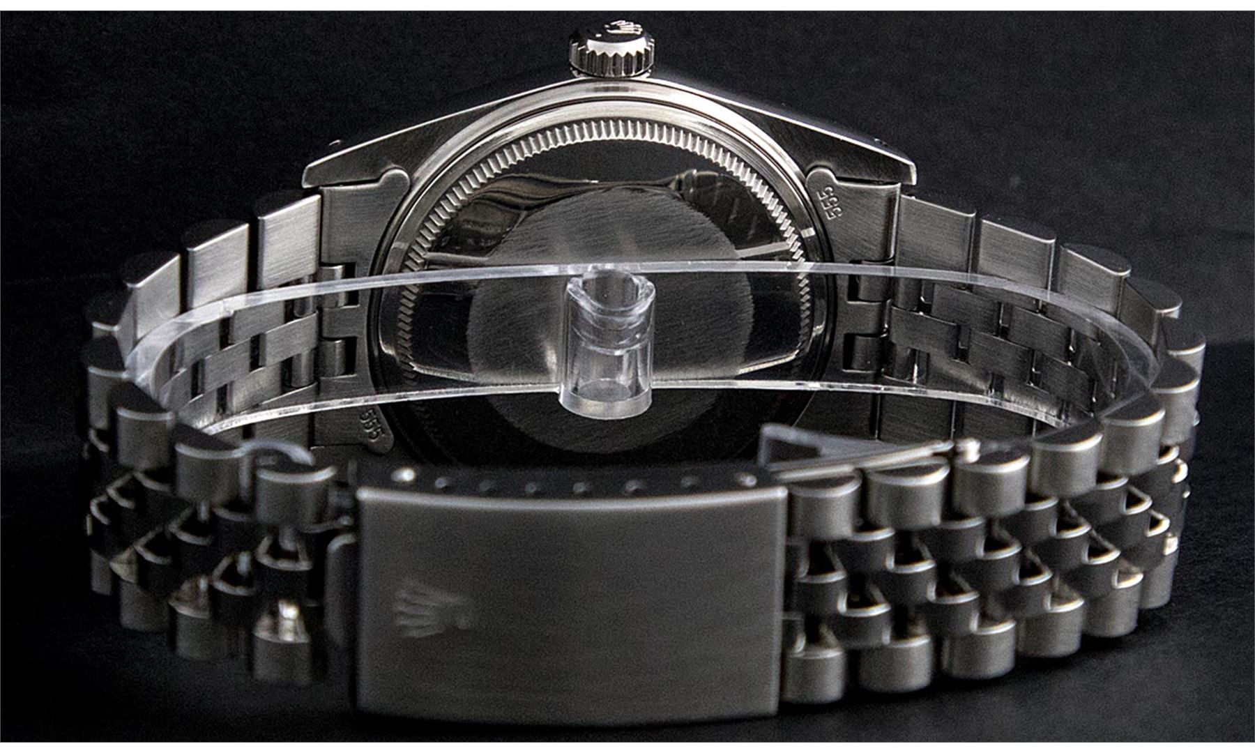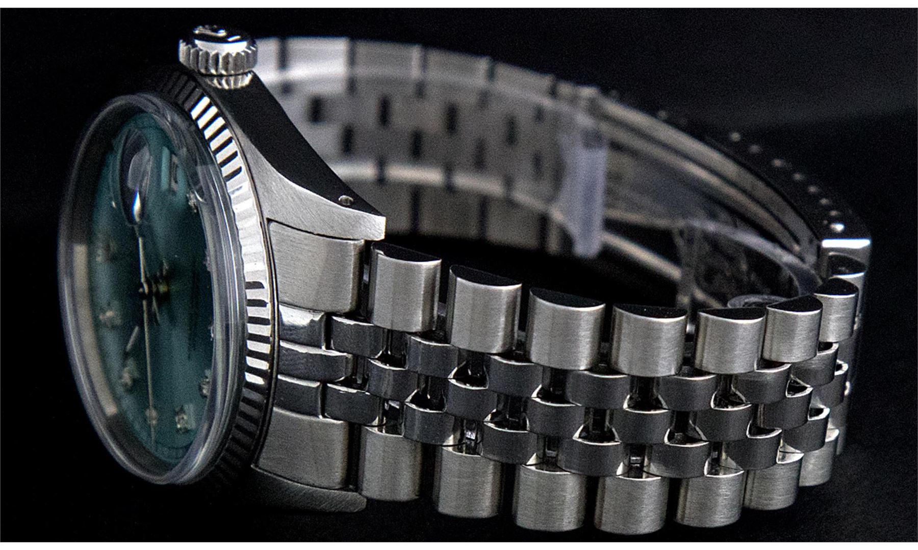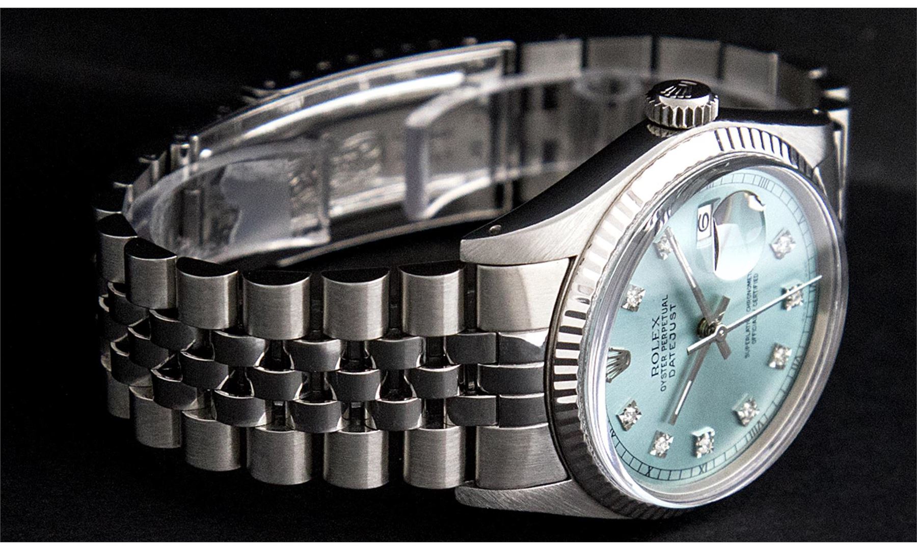 One Mens Rolex Datejust Polished Bright with Satin Finish, Serviced & Electronically Tested, Stainless Steel Case:36mm, Stainless Steel Crown, Original Bezel: 18K White Gold Fluted Bezel. Custom Crystal: Sapphire Cyclops Lens. Movement: Automatic Winding Movement Caliber 3135. Custom Dial: Ice Blue Dial With Diamond Hour Markers and Track Square Setting, 10 Diamond in Dial G To H In Color, Si-VS Clarity. Date Window: 3 O'Clock Position Date Display, Quickset, Model: Sapphire 16234 Datejust, Condition: G-6 Extra Fine. Bracelet:Stainless Steel Rolex Jubilee Bamd. Bright Polish & Satin Finish. 7.0 Inch Length, Adjustable. Standard Clasp, With Rolex Logo.