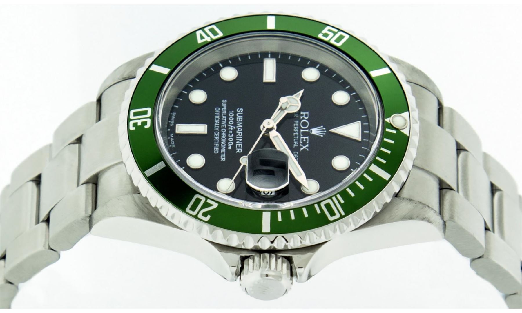 One Mens Pre Owned Rolex Anniversary Edition Stainless Steel Submariner "Kermit" With Date Polished, Serviced & Electronically Tested, Rolex Stainless Steel Case: 40mm, Rolex Stainless Steel Crown, Rolex Bezel: Stainless Steel Rotatable Bezel With Green Insert. Crystal: Sapphire With Magnified Date Window. Rolex Movement: Automatic Winding Movement Caliber 3135. Rolex Dial: Black Submariner Dial, Hands: Submariner Hands. Date Window: 3 O'Clock Position Date Display, Model: Submariner, Quickset, Condition: G-6 Extra Fine. Rolex Bracelet: Stainless Steel Oyster Band. Bright Polish & Satin Finish. 7.0 Inch Length, Adjustable. Standard Clasp, With Rolex Logo.