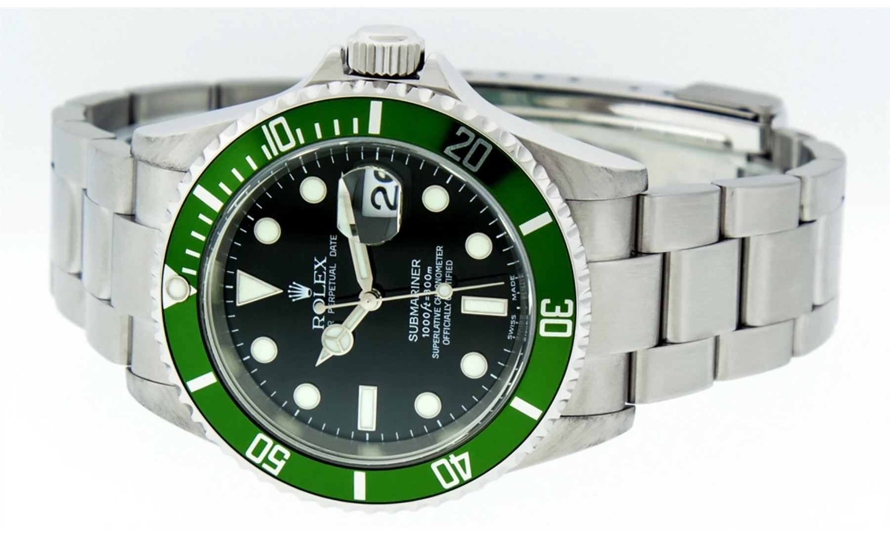 One Mens Pre Owned Rolex Anniversary Edition Stainless Steel Submariner "Kermit" With Date Polished, Serviced & Electronically Tested, Rolex Stainless Steel Case: 40mm, Rolex Stainless Steel Crown, Rolex Bezel: Stainless Steel Rotatable Bezel With Green Insert. Crystal: Sapphire With Magnified Date Window. Rolex Movement: Automatic Winding Movement Caliber 3135. Rolex Dial: Black Submariner Dial, Hands: Submariner Hands. Date Window: 3 O'Clock Position Date Display, Model: Submariner, Quickset, Condition: G-6 Extra Fine. Rolex Bracelet: Stainless Steel Oyster Band. Bright Polish & Satin Finish. 7.0 Inch Length, Adjustable. Standard Clasp, With Rolex Logo.