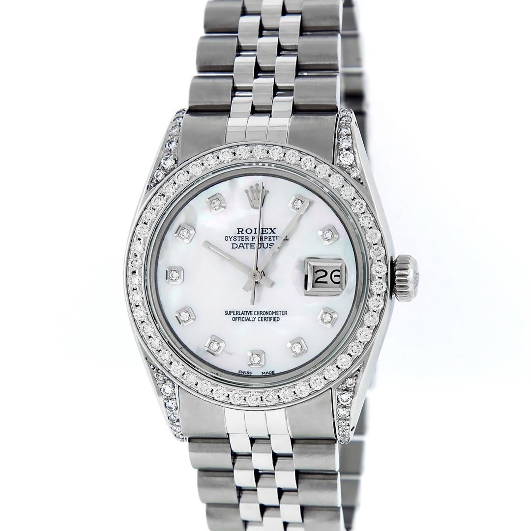 One Mens Stainless Steel Rolex Datejust Polished Bright with Satin Finish, Serviced & Electronically Tested, Stainless Steel Case: 36mm, Diamond Lugs: 24 Diamonds On Lugs, Color: G to H, Clarity: SI-VS. Stainless Steel Crown, New Custom Bezel: Stainless Steel Diamond Bezel, Diamond Count: 54 Diamonds On Bezel, Total Weight 1.00 Carat, Clarity: SI-VS, Color: G to H. Custom Crystal: New Scratch Resistant Synthetic Sapphire Cyclops Lens. Movement: Automatic Winding Movement Caliber 3035. Custom Refinished Dial: Mother Of Pearl Diamond Dial, Diamond Color: G To H In Color, Clarity: SI-VS. Date Window: 3 O'Clock Position Date Display, Quickset, Model: Quickset Datejust, Condition: G-6 Extra Fine. Bracelet: Stainless Steel Jubilee Band. Bright Polish & Satin Finish. 7.0 Inch Length, Adjustable. Standard Clasp, With Rolex Logo. This Watch Has Been Serviced Time Tested And Is In Excellent Condition It Is Free Of All Scratches And Dents.