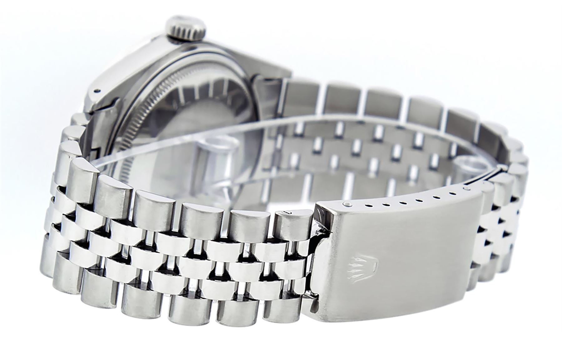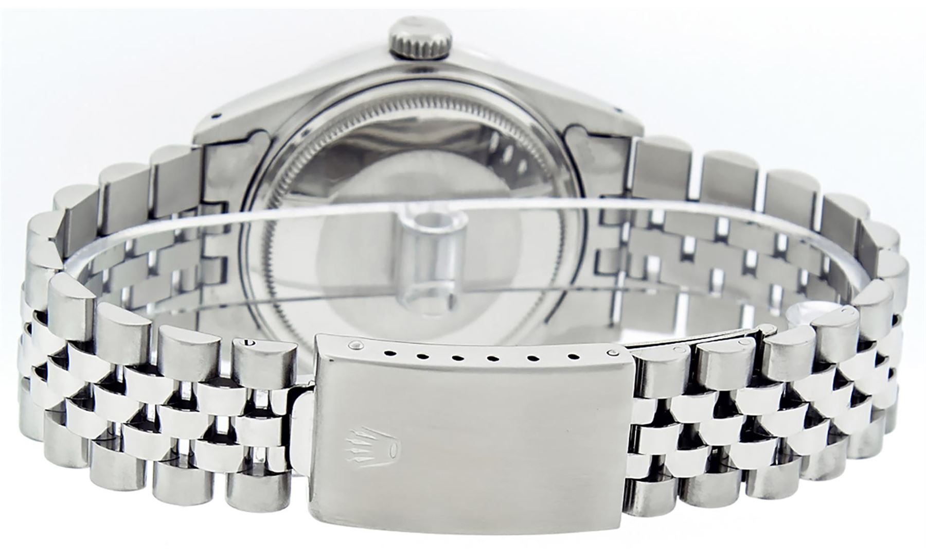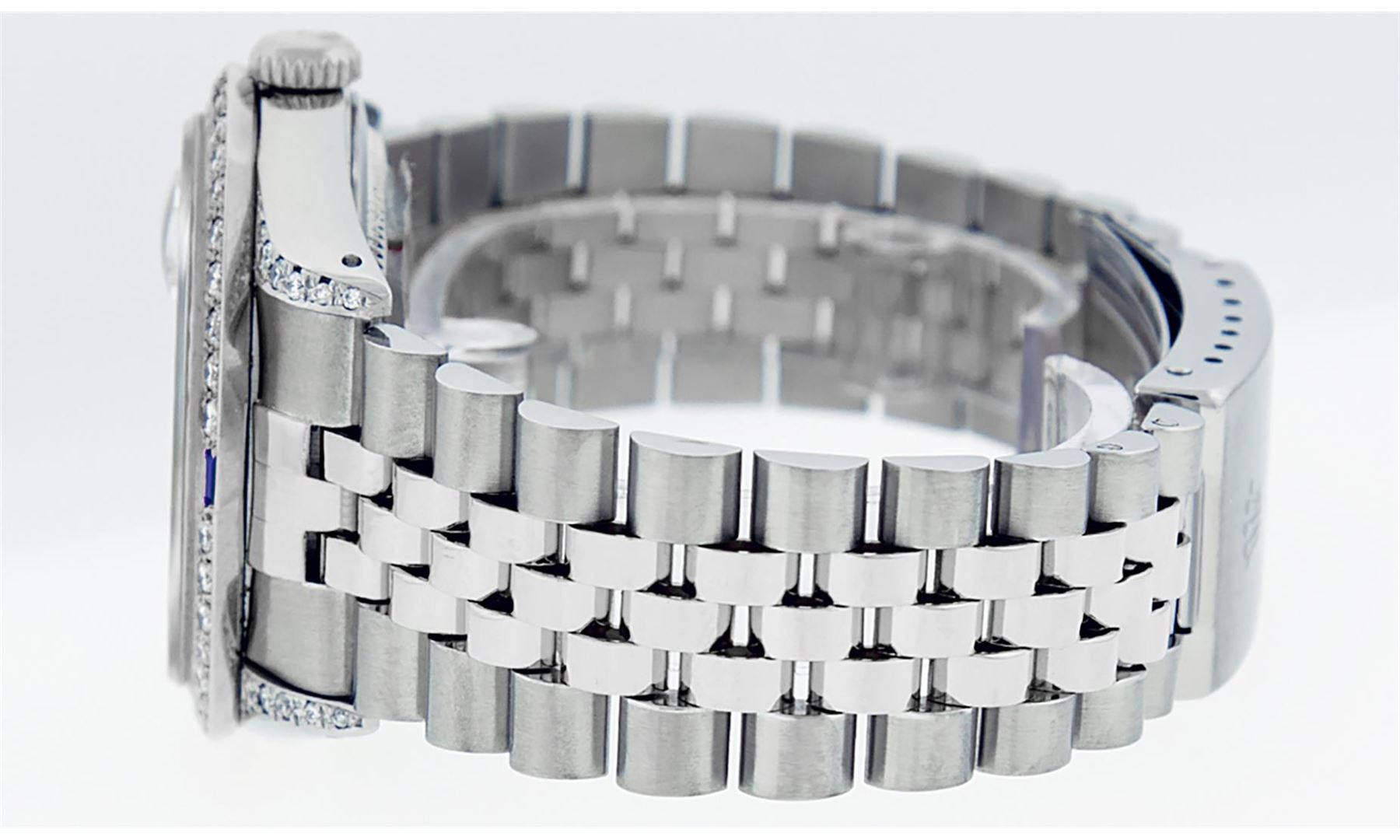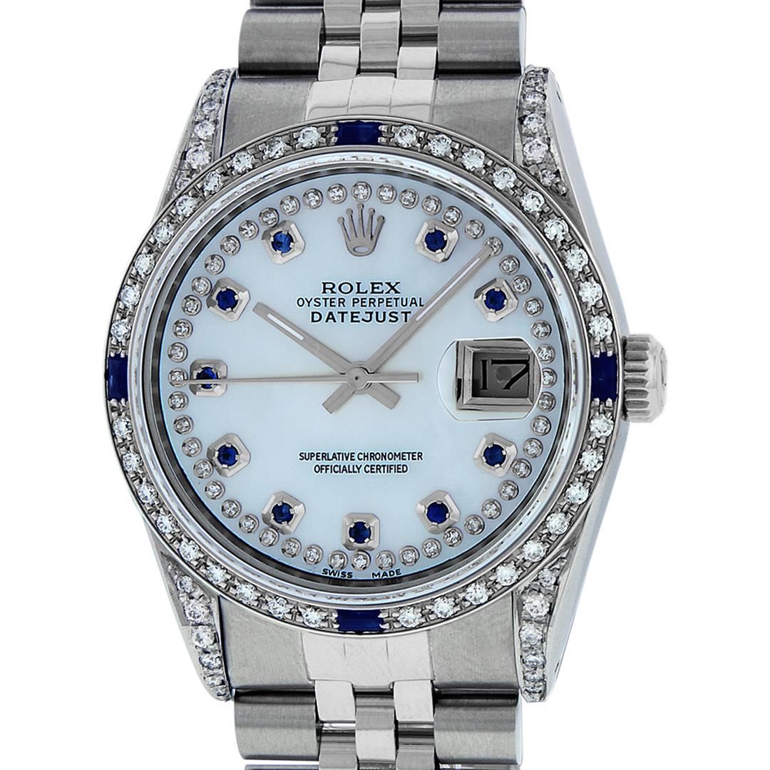 One Mens Rolex Datejust Polished Bright with Satin Finish, Serviced & Electronically Tested, Stainless Steel Case: 36mm, Custom Diamond Lugs: 28 Diamonds In Lugs, Color: G to H, Clarity: SI-VS. Stainless Steel Crown, Custom Bezel: 18K White Gold Diamond + Sapphire Beadset, Diamond Count: 36 Diamonds + 4 Sapphires, Total Weight 1.00 Carat, Clarity: SI-VS, Color: G to H. Custom Crystal: New Synthetic Sapphire Cyclops Lens. Custom Hands: New Luminescent Hands. Movement: Automatic Winding Movement Caliber 3035. Custom Dial: Mother Of Pearl String Diamond and Sapphire Dial, Stone Count: 10 Sapphires + 33 Diamonds, Diamond Color: G To H In Color, Clarity: SI-VS. Date Window: 3 O'Clock Position Date Display, Quickset, Model: Datejust Condition: G-6 Extra Fine. Bracelet: Stainless Steel Jubilee Band. Bright Polish & Satin Finish. 7.0 Inch Length, Adjustable. Standard Clasp, With Rolex Logo. This Watch Has Been Serviced And Polished And Its Free Of All Dents And Scratches.
