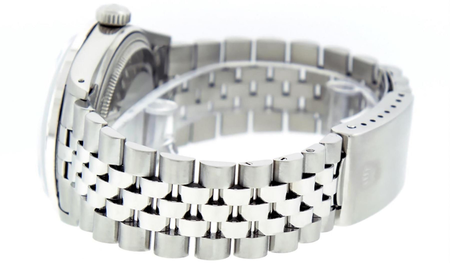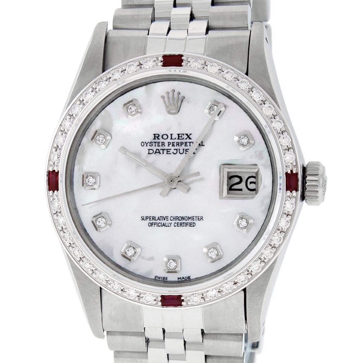 One Mens Stainless Steel Rolex Datejust Polished, Serviced & Electronically Tested, Stainless Steel Case: 36mm, Stainless Steel Crown, Custom Bezel: New 18K White Gold Ruby Beadset Diamond Bezel, Diamond + Gem Count: 36 Diamonds + 4 Rubies, Total Weight 1.00 Carat, Clarity: SI-VS, Color: G to H. Custom Crystal: New Scratch Resistant Synthetic Sapphire Cyclops Lens. Custom Hands: New Luminescent Hands. Movement: Automatic Winding Movement. Custom Refinished Dial: Mother Of Pearl With Diamond Hour Markers, 10 Diamond In Dial, G To H In Color, Clarity: SI-VS. Date Window: 3 O'Clock Position Date Display, Quickset, Model: Datejust. Condition: G-6 Extra Fine. Bracelet: Stainless Steel Jubilee Band. Bright Polish & Satin Finish. 7.0 Inch Length, Adjustable. Standard Clasp, With Rolex Logo. This Watch Has Been Serviced Time Tested And Is In Excellent Condition It Is Free Of All Scratches And Dents.