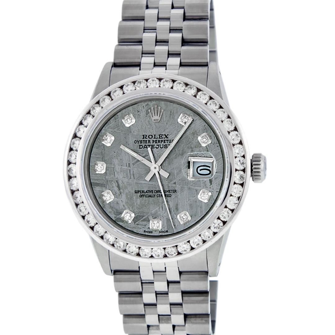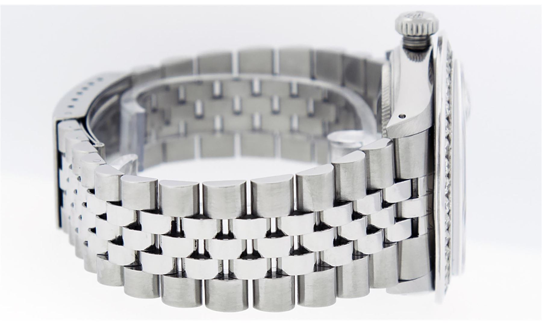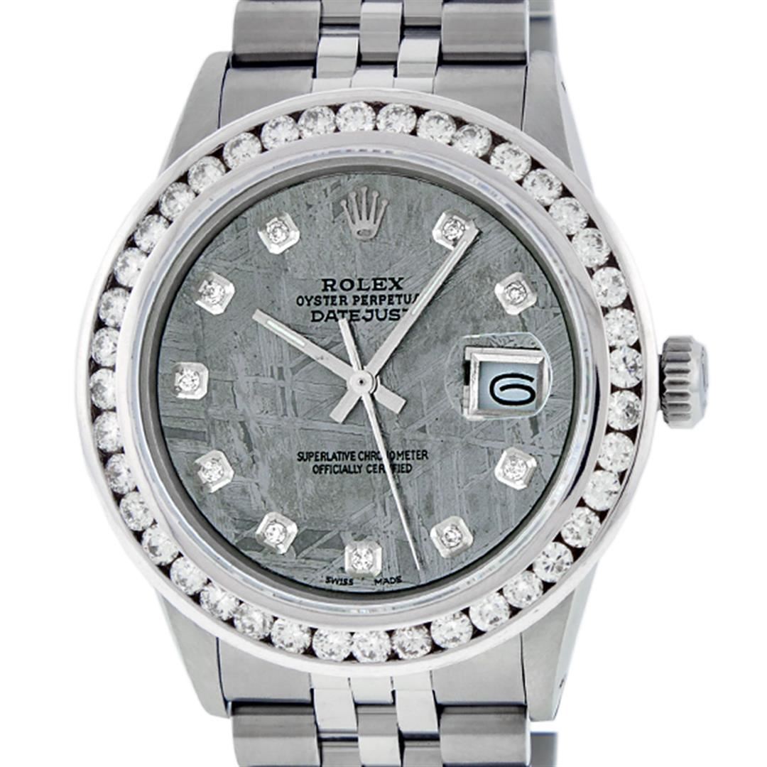 One Mens Rolex Datejust Polished Bright with Satin Finish, Serviced & Electronically Tested, Stainless Steel Case:36mm, Stainless Steel Crown, Custom Bezel: 18K White Gold 3ct Channel Set Diamond Bezel, Diamond Count: 40 Diamonds, Total Weight 3.00 Carat, Clarity: SI-VS, Color: G to H. Custom Crystal: Synthetic Sapphire Cyclops Lens. Movement: Automatic Winding Movement Caliber 3035. Custom Dial: Meteorite Diamond Dial, Diamond Count: 10 Diamonds In Dial, Diamond Color: G To H In Color, Clarity: SI-VS. Date Window: 3 O'Clock Position Date Display, Quickset, Model: Datejust Condition: G-6 Extra Fine. Bracelet: Stainless Steel Jubilee Band. Bright Polish & Satin Finish. 7.0 Inch Length, Adjustable. Standard Clasp, With Rolex Logo.