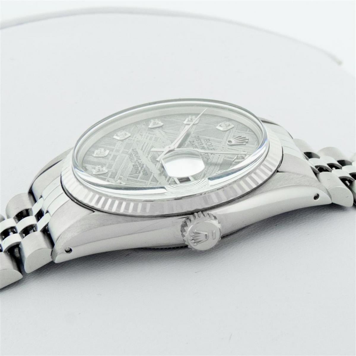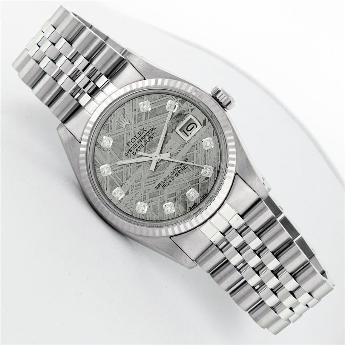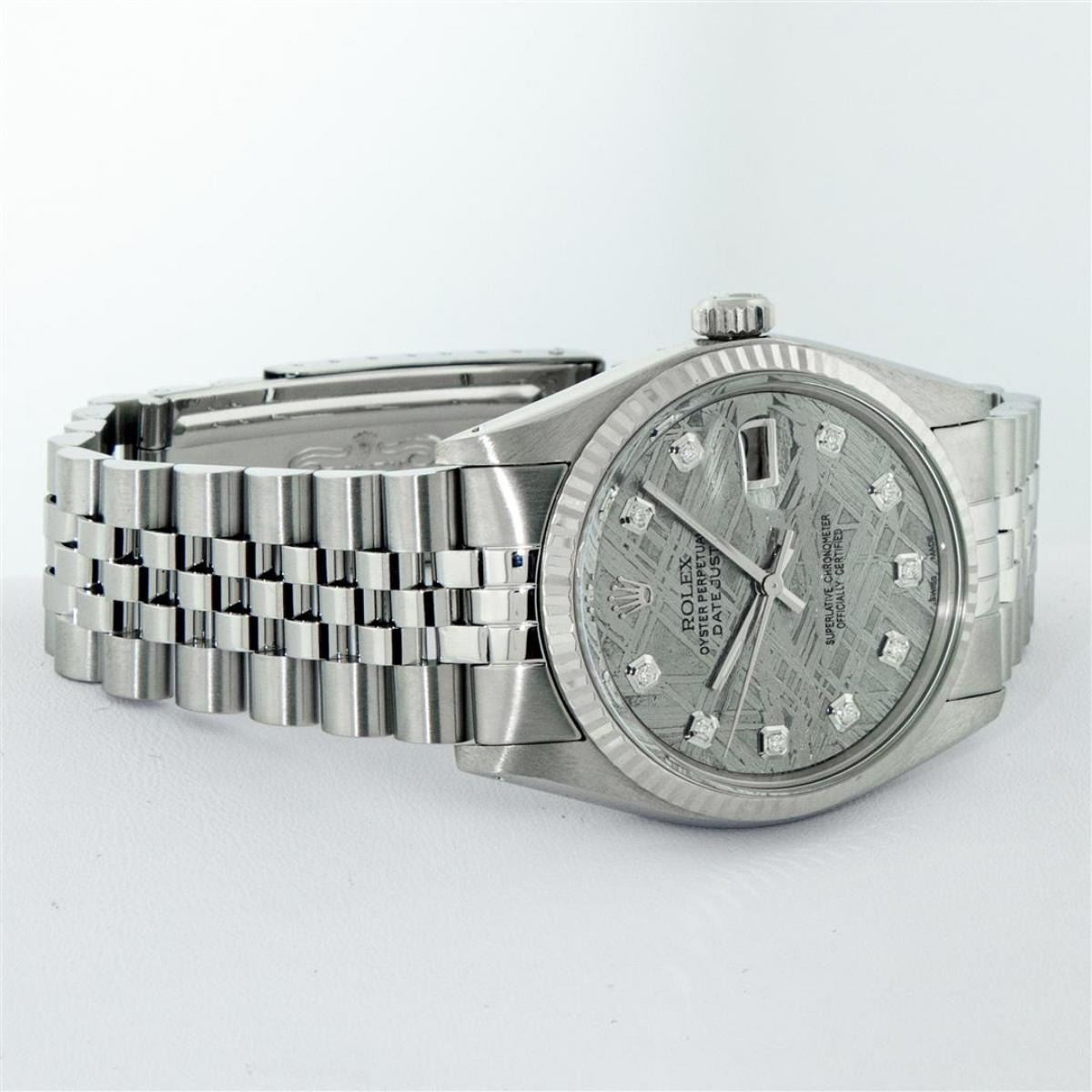 One Mens Stainless Steel Rolex Datejust Polished Bright with Satin Finish, This Watch Has Been Serviced & Electronically Tested, Stainless Steel Case: 36mm, Stainless Steel Crown, Original Bezel: 14K White Gold Fluted Bezel. Custom Crystal: New Acrylic Cyclops Lens. Custom Hands: New Luminescent Hands. Movement: Automatic Winding Movement Caliber 3035. Custom Dial: Meteorite Diamond Dial With Diamond Hour Markers, Diamond Count: 10 Diamonds in Dial, G To H In Color, SI-VS Clarity. Date Window: 3 O'Clock Position Date Display, Quickset, Model: Datejust, Condition: G-6 Extra Fine. Bracelet:Stainless Steel Jubilee. Bright Polish & Satin Finish. 7.0 Inch Length, Adjustable. Standard Clasp, With Rolex Logo. This Watch Has Been Serviced Time Tested And Is In Excellent Condition It Is Free Of All Scratches And Dents With Rolex Box.