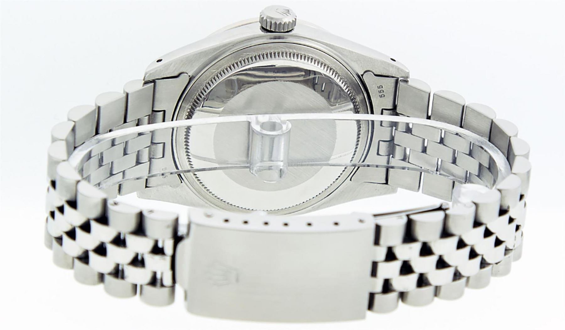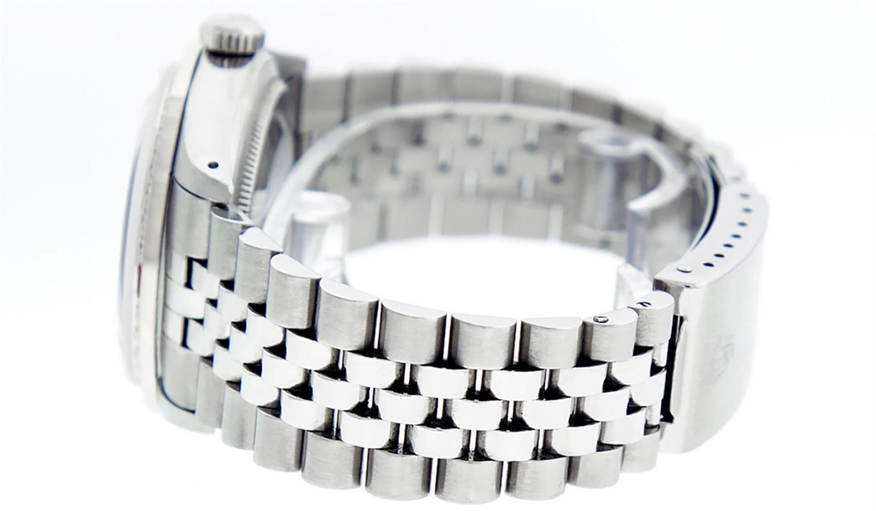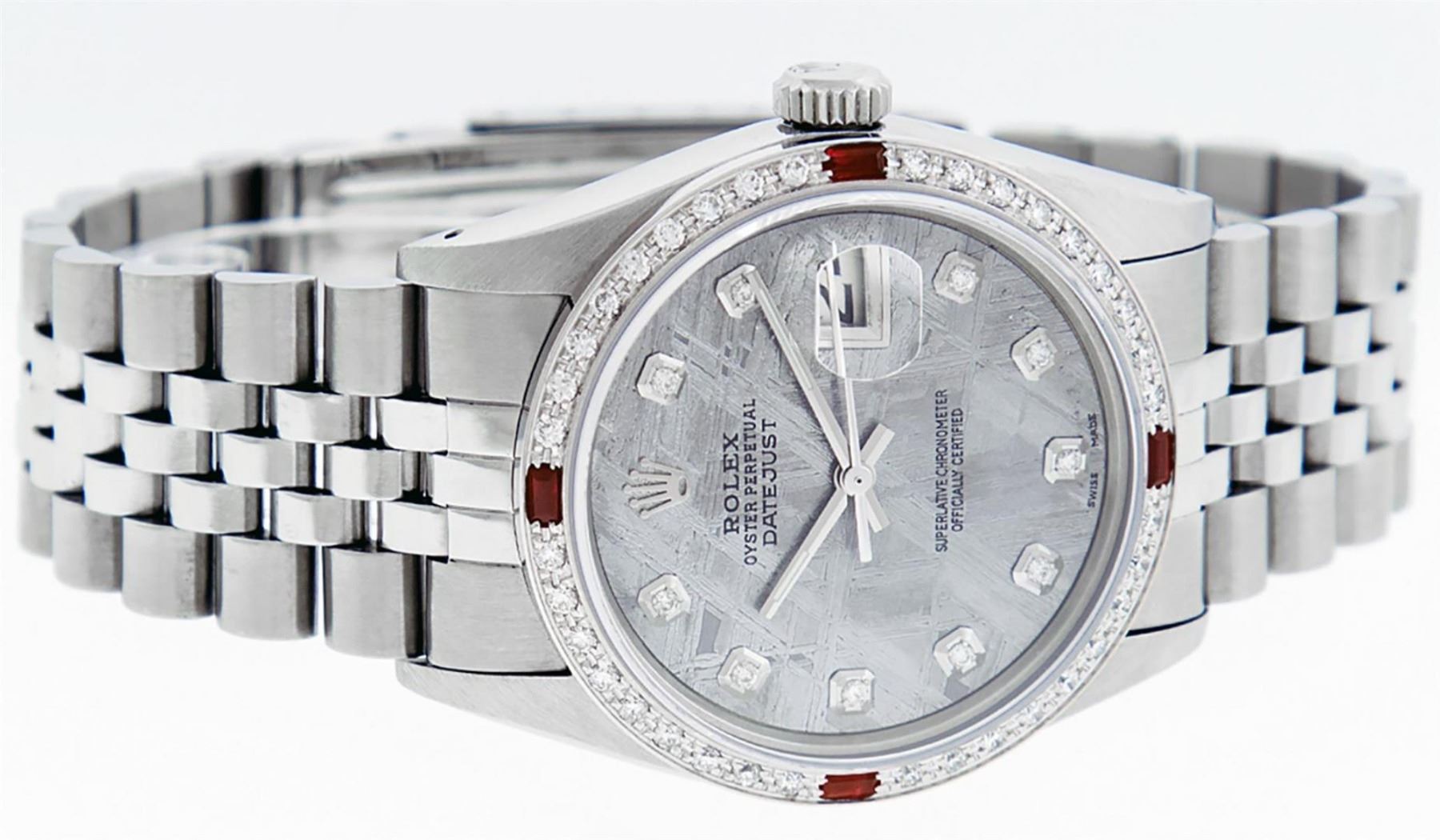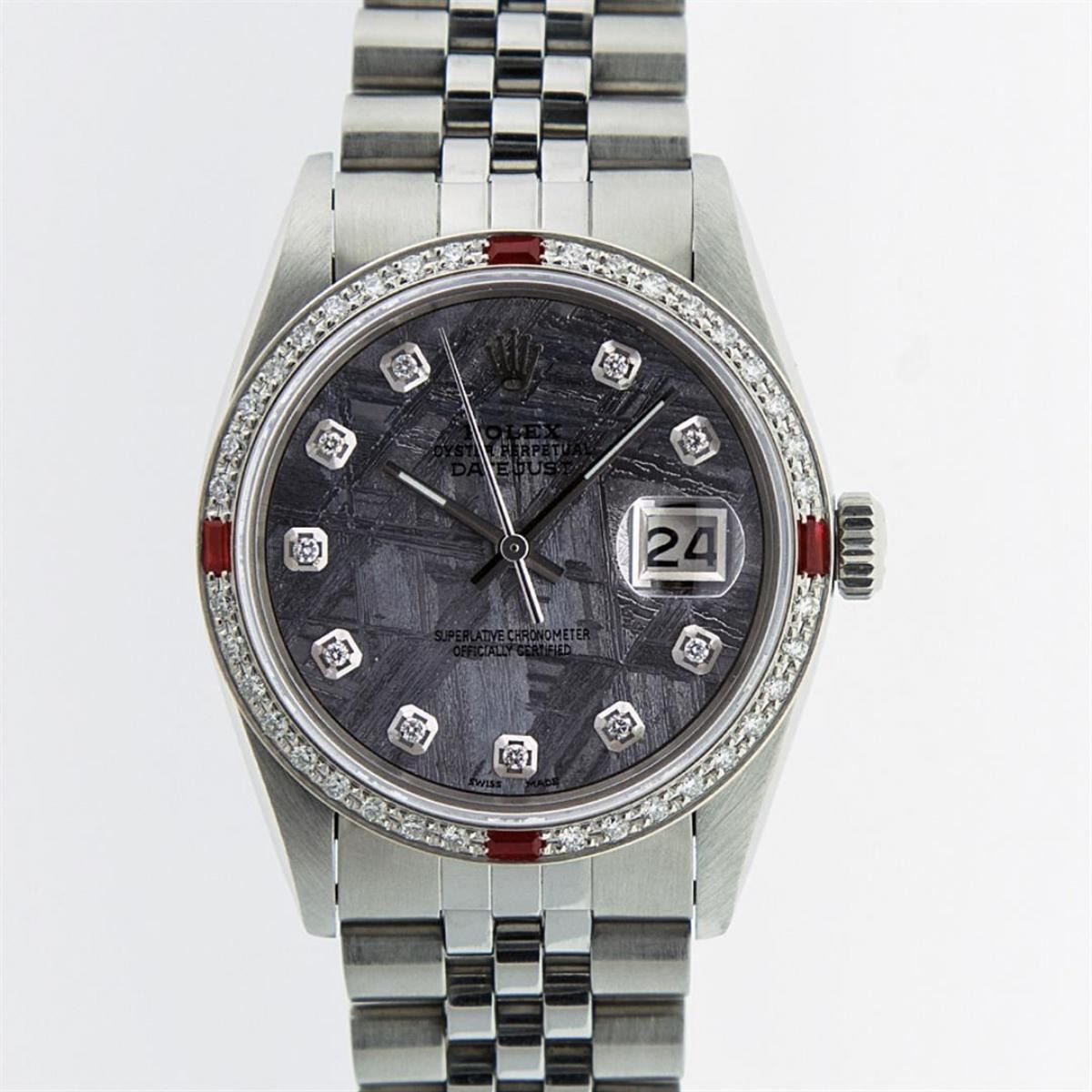 One Mens Stainless Steel Rolex Datejust Polished, Serviced & Electronically Tested, Stainless Steel Case: 36mm, Stainless Steel Crown, Custom Bezel: New 18K White Gold Ruby Beadset Diamond Bezel, Diamond + Gem Count: 36 Diamonds + 4 Rubies, Total Weight 1.00 Carat, Clarity: SI-VS, Color: G to H. Custom Crystal: New Scratch Resistant Synthetic Sapphire Cyclops Lens. Custom Hands: New Luminescent Hands. Movement: Automatic Winding Movement. Custom Dial: Meteorite With Diamond Hour Markers, 10 Diamonds In Dial, G To H In Color, Clarity: SI-VS. Date Window: 3 O'Clock Position Date Display, Quickset, Model: Datejust. Condition: G-6 Extra Fine. Bracelet: Stainless Steel Jubilee Band. Bright Polish & Satin Finish. 7.0 Inch Length, Adjustable. Standard Clasp, With Rolex Logo. This Watch Has Been Serviced Time Tested And Is In Excellent Condition It Is Free Of All Scratches And Dents.