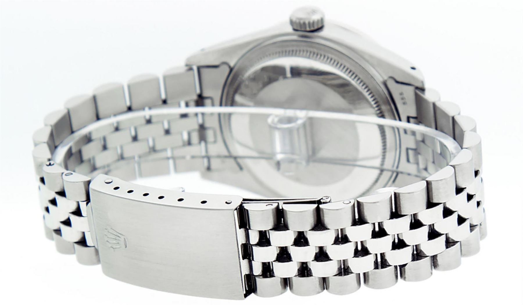 One Mens Stainless Steel Rolex Datejust Polished, Serviced & Electronically Tested, Stainless Steel Case: 36mm, Stainless Steel Crown, Custom Bezel: New 18K White Gold Ruby Beadset Diamond Bezel, Diamond + Gem Count: 36 Diamonds + 4 Rubies, Total Weight 1.00 Carat, Clarity: SI-VS, Color: G to H. Custom Crystal: New Scratch Resistant Synthetic Sapphire Cyclops Lens. Custom Hands: New Luminescent Hands. Movement: Automatic Winding Movement Caliber 3035. Custom Dial: Meteorite With Diamond Hour Markers, 10 Diamonds In Dial, G To H In Color, Clarity: SI-VS. Date Window: 3 O'Clock Position Date Display, Quickset, Model: Datejust. Condition: G-6 Extra Fine. Bracelet: Stainless Steel Jubilee. Bright Polish & Satin Finish. 7.0 Inch Length, Adjustable. Standard Clasp, With Rolex Logo. This Watch Has Been Serviced Time Tested And Is In Excellent Condition It Is Free Of All Scratches And Dents