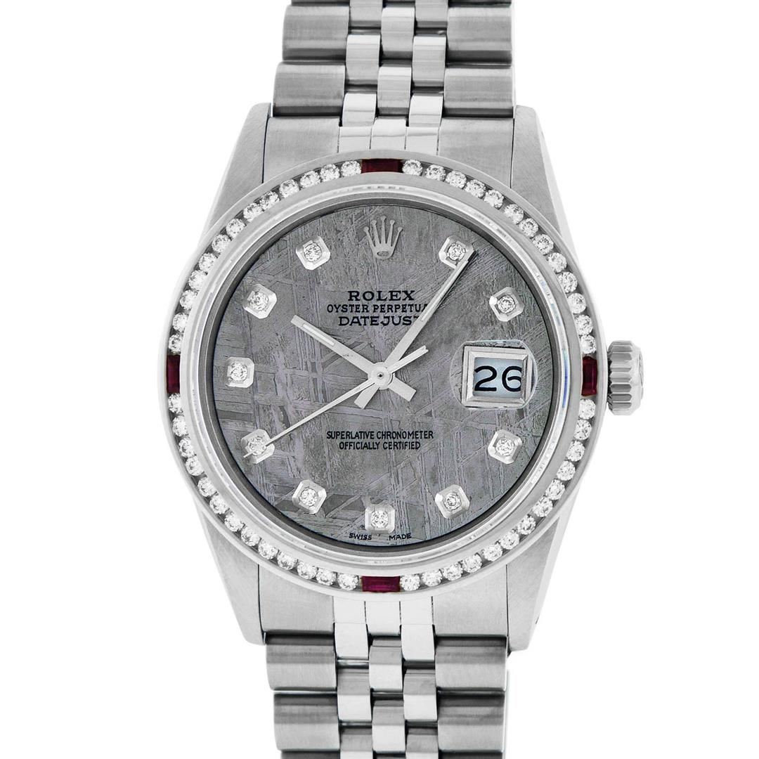 One Mens Stainless Steel Rolex Datejust Polished Bright with Satin Finish, Fully Serviced & Electronically Tested, Stainless Steel Case:36mm, Stainless Steel Crown, Custom Bezel: 18K White Gold Ruby Channel Set Diamond Bezel, Diamond Count: 52 Diamonds + 4 Rubies, Total Weight 1.30 Carat, Clarity: SI-VS, Color: G to H. Custom Crystal: New Synthetic Sapphire Cyclops Lens. Custom Hands: New Luminecent Hands. Movement: Automatic Winding Movement Caliber 3035. Custom Dial: Meteorite Diamond Dial, 10 Diamonds in Dial, G To H In Color, Clarity: SI-VS. Date Window: 3 O'Clock Position Date Display, Quickset, Model: Datejust 36mm, Condition: G-6 Extra Fine. Bracelet: Rolex Stainless Steel Jubilee Band. Bright Polish & Satin Finish. 7.0 Inch Length, Adjustable. Standard Clasp, With Rolex Logo. This watch has been serviced and polished and its free of all dents and scratches and has been time tested.