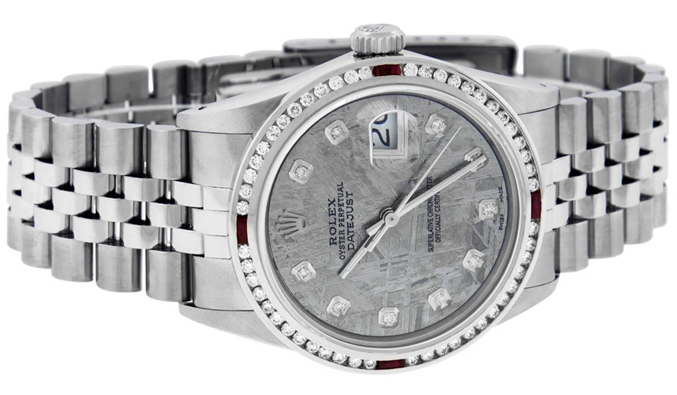 One Mens Stainless Steel Rolex Datejust Polished Bright with Satin Finish, Fully Serviced & Electronically Tested, Stainless Steel Case:36mm, Stainless Steel Crown, Custom Bezel: 18K White Gold Ruby Channel Set Diamond Bezel, Diamond Count: 52 Diamonds + 4 Rubies, Total Weight 1.30 Carat, Clarity: SI-VS, Color: G to H. Custom Crystal: New Synthetic Sapphire Cyclops Lens. Custom Hands: New Luminecent Hands. Movement: Automatic Winding Movement Caliber 3035. Custom Dial: Meteorite Diamond Dial, 10 Diamonds in Dial, G To H In Color, Clarity: SI-VS. Date Window: 3 O'Clock Position Date Display, Quickset, Model: Datejust 36mm, Condition: G-6 Extra Fine. Bracelet: Rolex Stainless Steel Jubilee Band. Bright Polish & Satin Finish. 7.0 Inch Length, Adjustable. Standard Clasp, With Rolex Logo. This watch has been serviced and polished and its free of all dents and scratches and has been time tested.