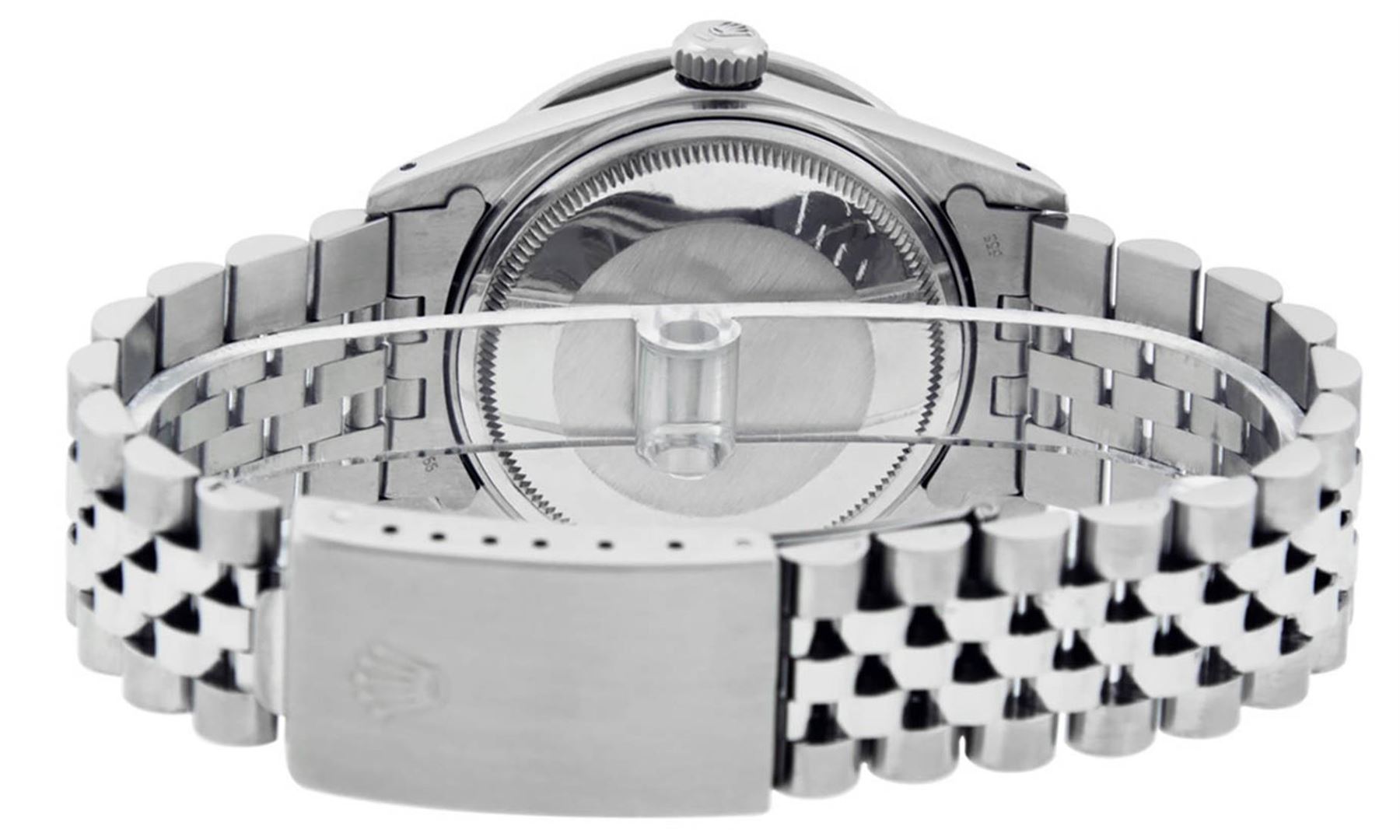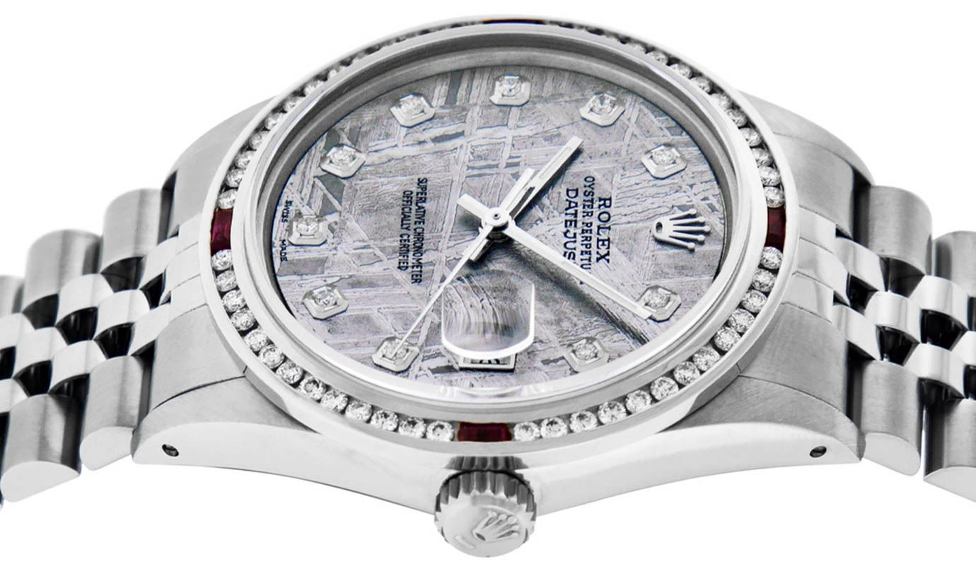 One Mens Stainless Steel Rolex Datejust Polished Bright with Satin Finish, Fully Serviced & Electronically Tested, Stainless Steel Case:36mm, Stainless Steel Crown, Custom Bezel: 18K White Gold Ruby Channel Set Diamond Bezel, Diamond Count: 52 Diamonds + 4 Rubies, Total Weight 1.30 Carat, Clarity: SI-VS, Color: G to H. Custom Crystal: New Synthetic Sapphire Cyclops Lens. Custom Hands: New Luminecent Hands. Movement: Automatic Winding Movement Caliber 3035. Custom Dial: Meteorite Diamond Dial, 10 Diamonds in Dial, G To H In Color, Clarity: SI-VS. Date Window: 3 O'Clock Position Date Display, Quickset, Model: Datejust 36mm, Condition: G-6 Extra Fine. Bracelet: Rolex Stainless Steel Jubilee Band. Bright Polish & Satin Finish. 7.0 Inch Length, Adjustable. Standard Clasp, With Rolex Logo. This watch has been serviced and polished and its free of all dents and scratches and has been time tested.