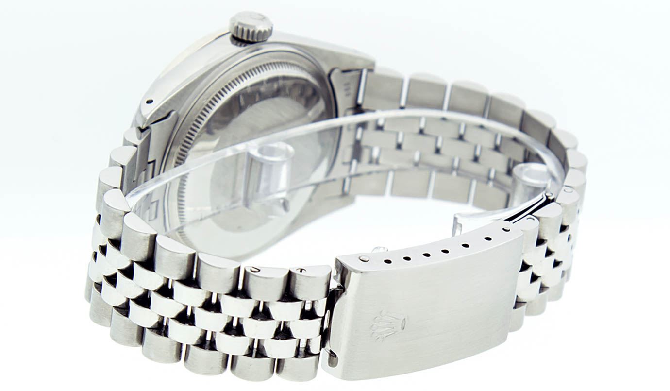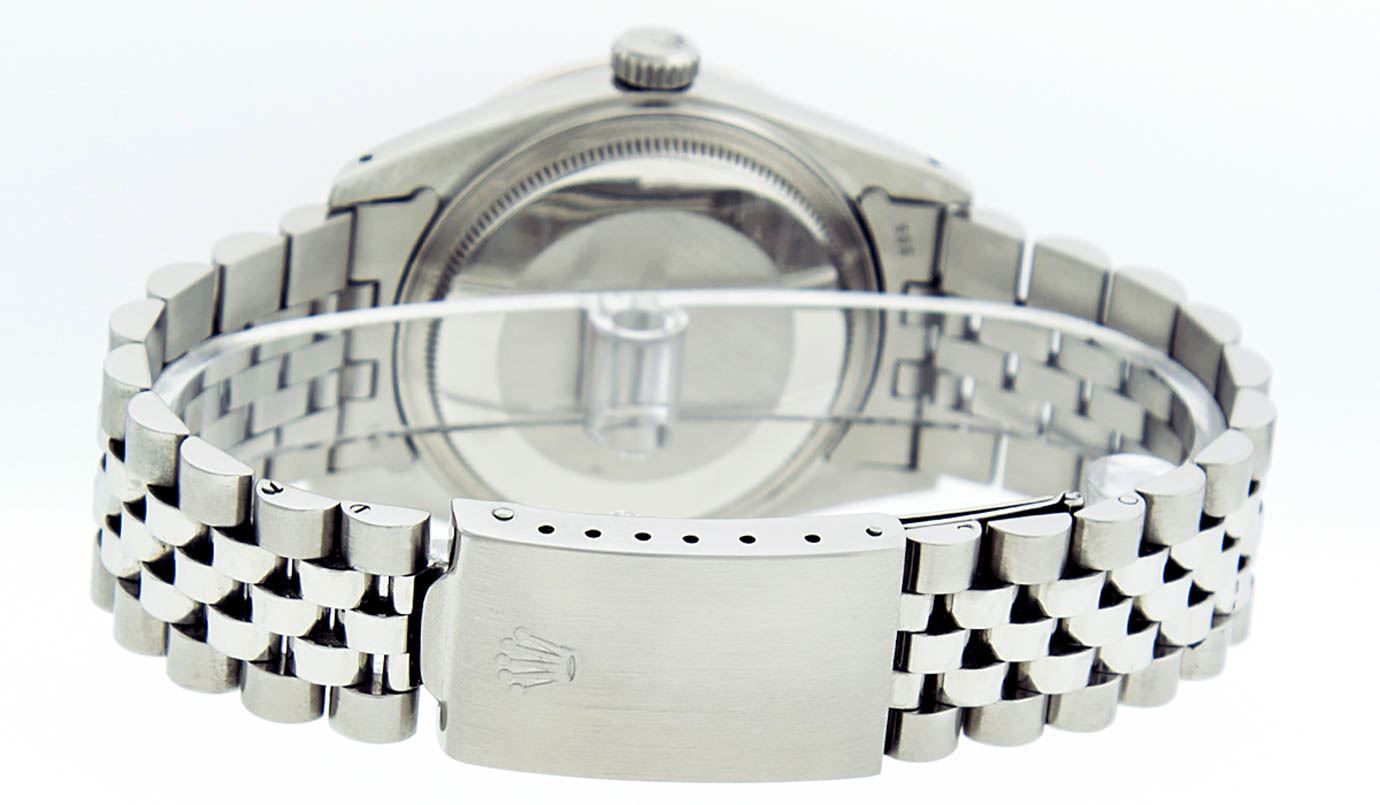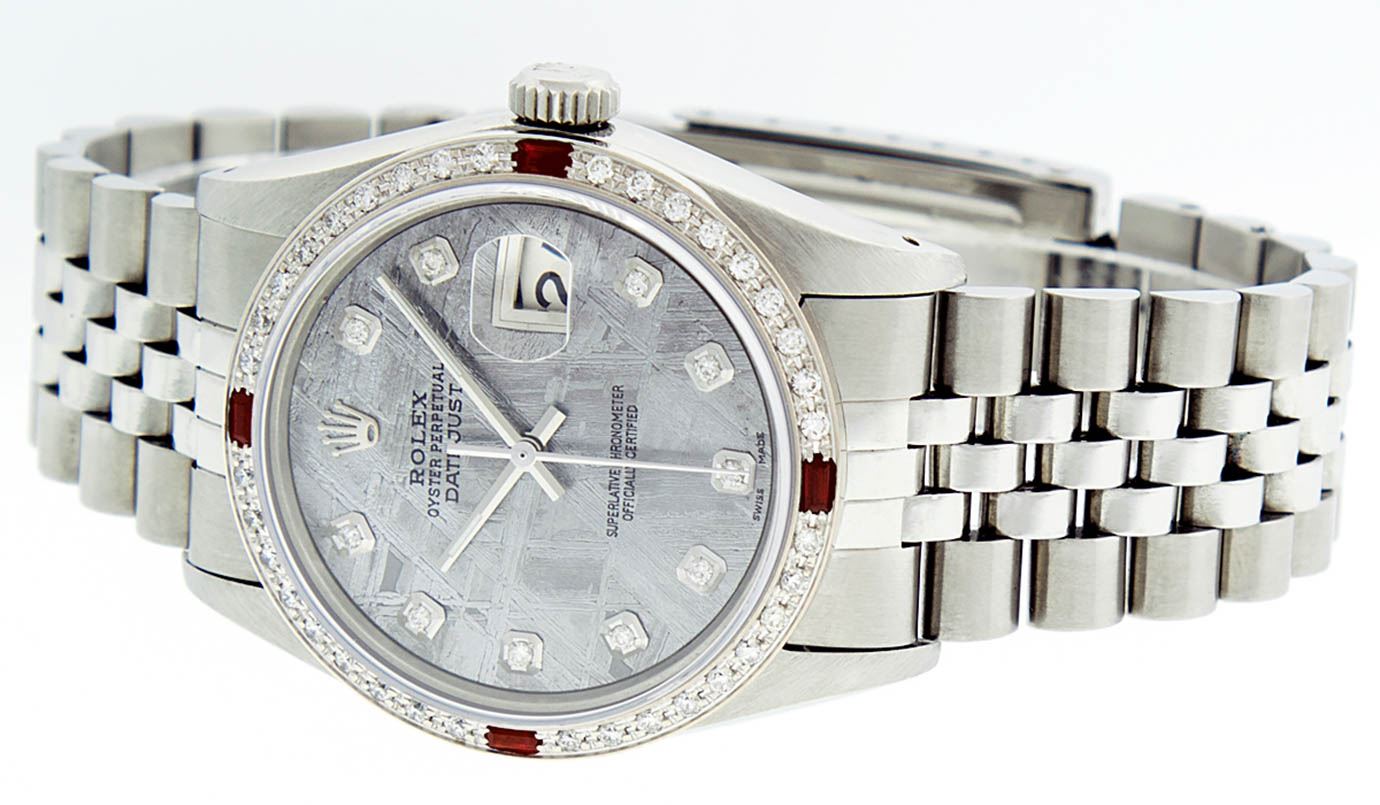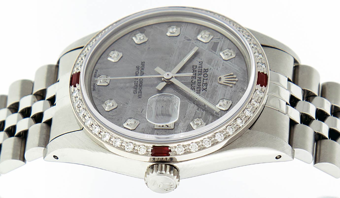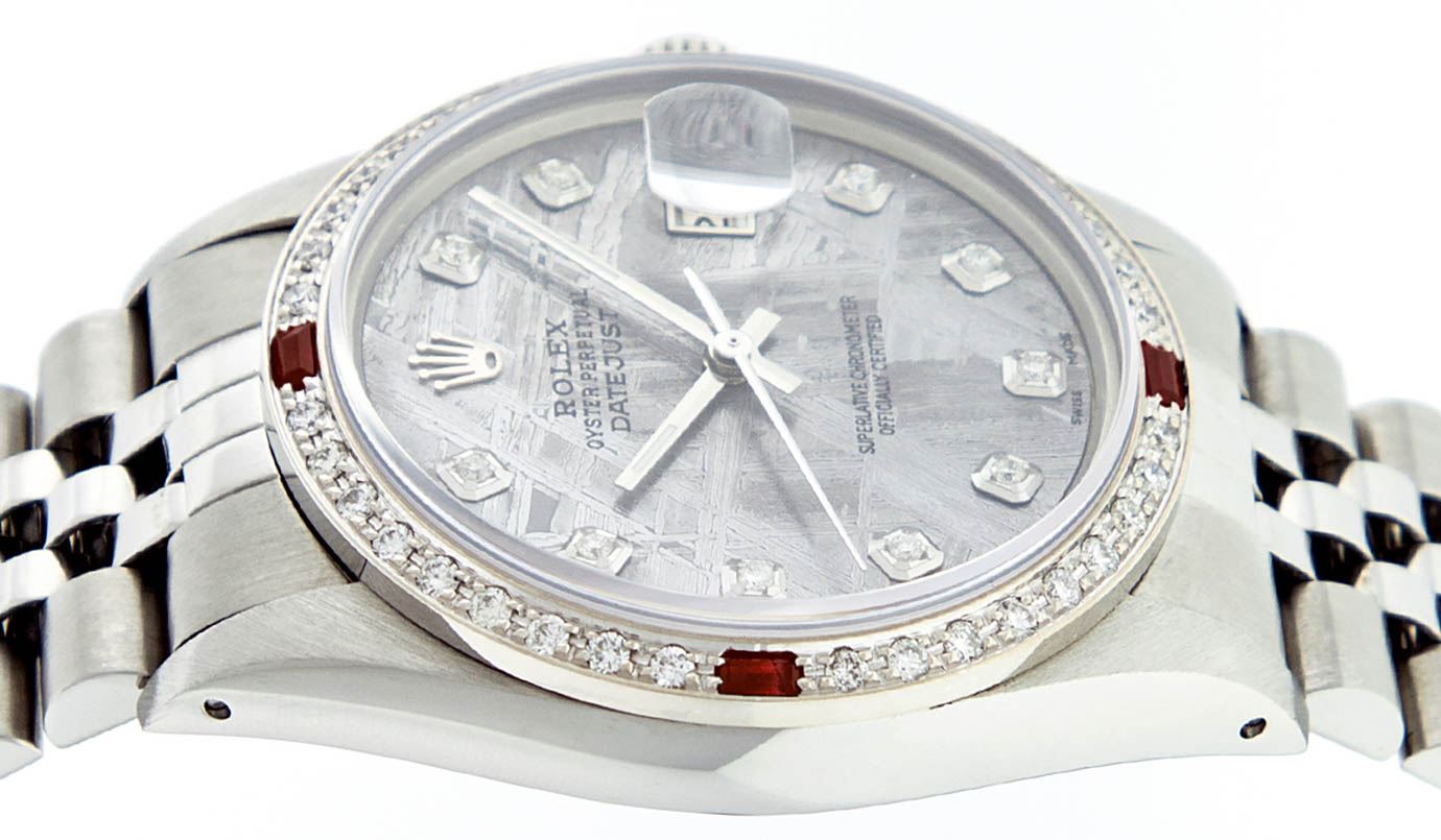 One Gents Stainless Steel Rolex Datejust Polished Bright with Satin Finish, Fully Serviced & Electronically Tested, Stainless Steel Case:36mm, Stainless Steel Crown, Custom Bezel: 18K White Gold Ruby Beadset Diamond Bezel, Diamond Count: 36 Diamonds + 4 Rubies, Total Weight 1.00 Carat, Clarity: SI-VS, Color: G to H. Custom Crystal: Synthetic Sapphire Cyclops Lens. Movement: Automatic Winding Movement Caliber 3035. Custom Dial: Meteorite Diamond Dial, 10 Diamonds in Dial, G To H In Color, Clarity: SI-VS. Date Window: 3 O'Clock Position Date Display, Quickset, Model: Datejust, Condition: G-6 Extra Fine. Bracelet:Stainless Steel Jubilee. Bright Polish & Satin Finish. 7.0 Inch Length, Adjustable. Standard Clasp, With Rolex Logo.
