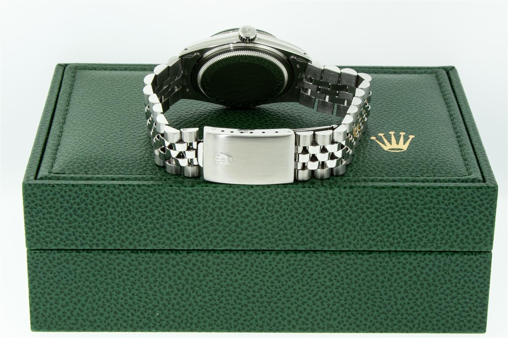 One Mens Stainless Steel Rolex Datejust Polished Bright with Satin Finish, Serviced & Electronically Tested, Stainless Steel Case: 36mm, Stainless Steel Crown, Original Bezel: White Gold Fluted Bezel. Custom Crystal: New Acrylic Cyclops Lens. Custom Hands: New Luminescent Hands. Movement: Automatic Winding Movement.. Custom Dial: Mother Of Pearl Ruby String Diamond Dial, Stone Count: 10 Rubies + 48 Diamonds in Dial, G To H In Color, SI-VS Clarity. Date Window: 3 O'Clock Position Date Display, Quickset, Model: Datejust, Condition: G-6 Extra Fine. Bracelet: Stainless Steel Jubilee. Bright Polish & Satin Finish. 7.0 Inch Length, Adjustable. Standard Clasp, With Rolex Logo. Watch Has Been Serviced And Polished It Is Free Of All Scratches And Dents. This Watch Comes With A Rolex Box.
